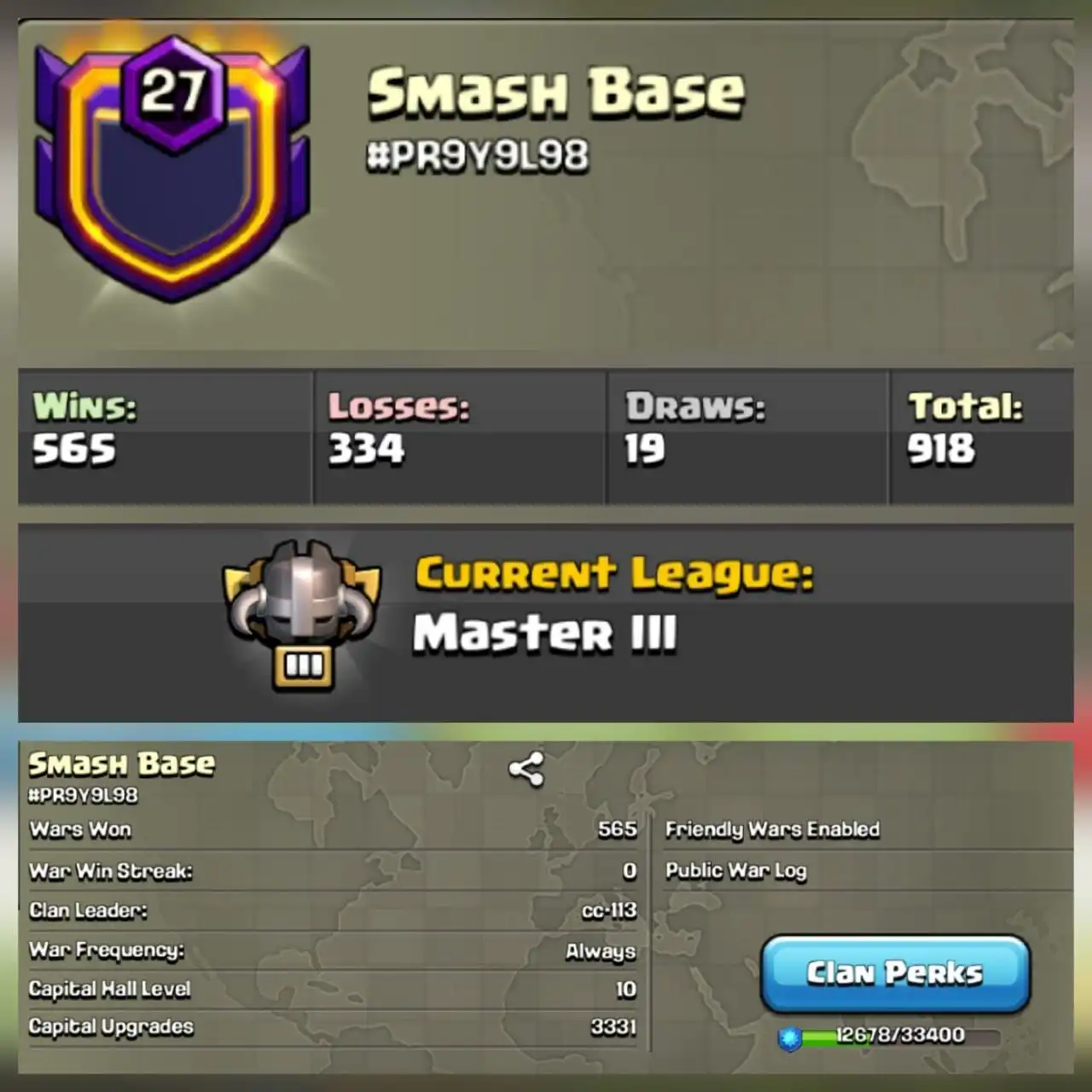 Level 27 clan || clan capital 10 maxed with 3331 upgraded || master 3 || warlog 565-334 || name - Smash Base