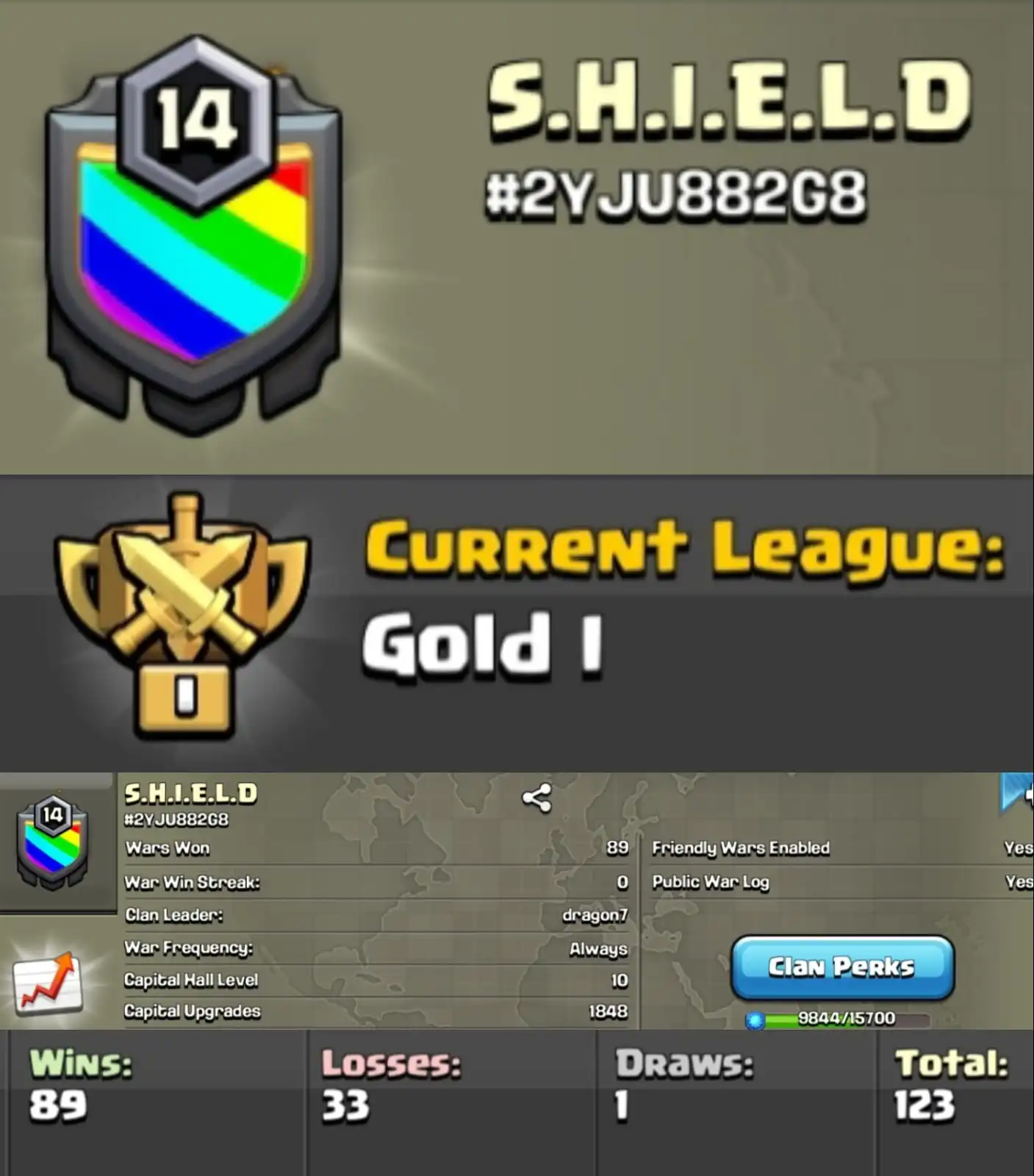 Level 14 clan || clan capital 10 || gold 1 || warlog 89-33 || name - S.H.I.E.L.D