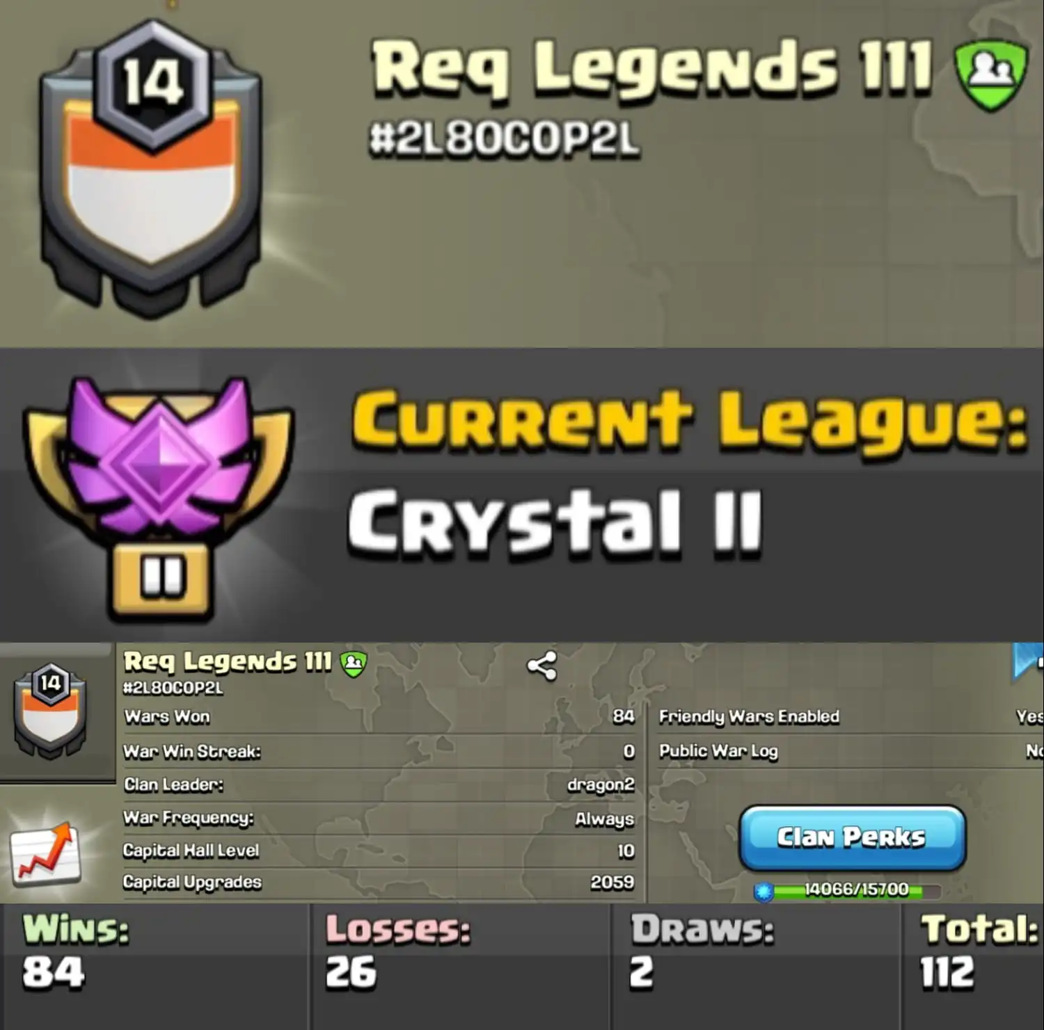 Level 14 clan || clan capital 10 || crystal 2 || best warlog 84-26 || name - Req Legends 111