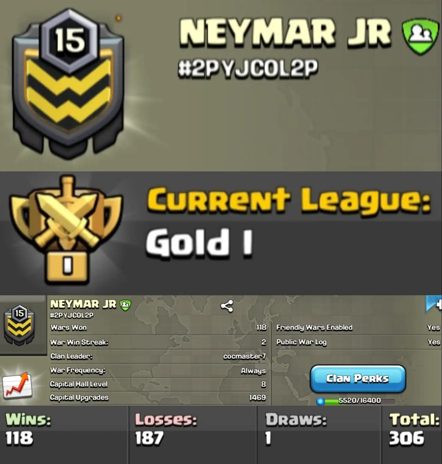 Level 15 clan || clan capital 8 || gold 1 || name - NEYMAR JR
