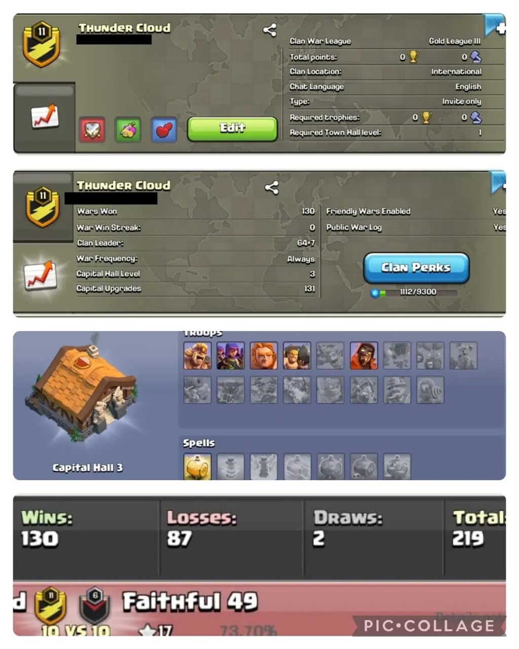 🔥NAME- Thunder Cloud | LVL 11🥵| 💥WARLOG W/L/D:130/87/2 | CWL League: GOLD 3🏆| CC: ALMOST 3 !!💥