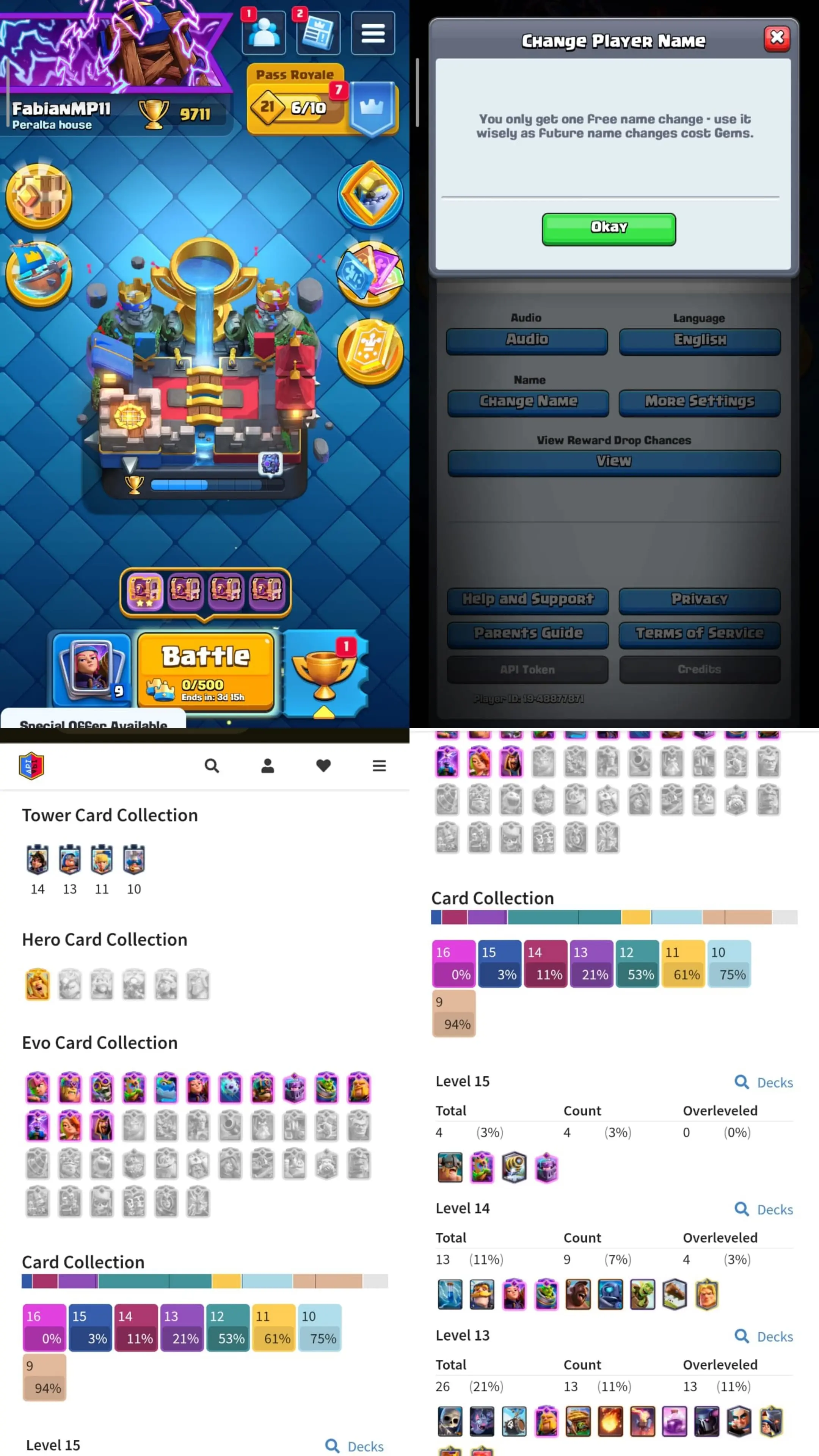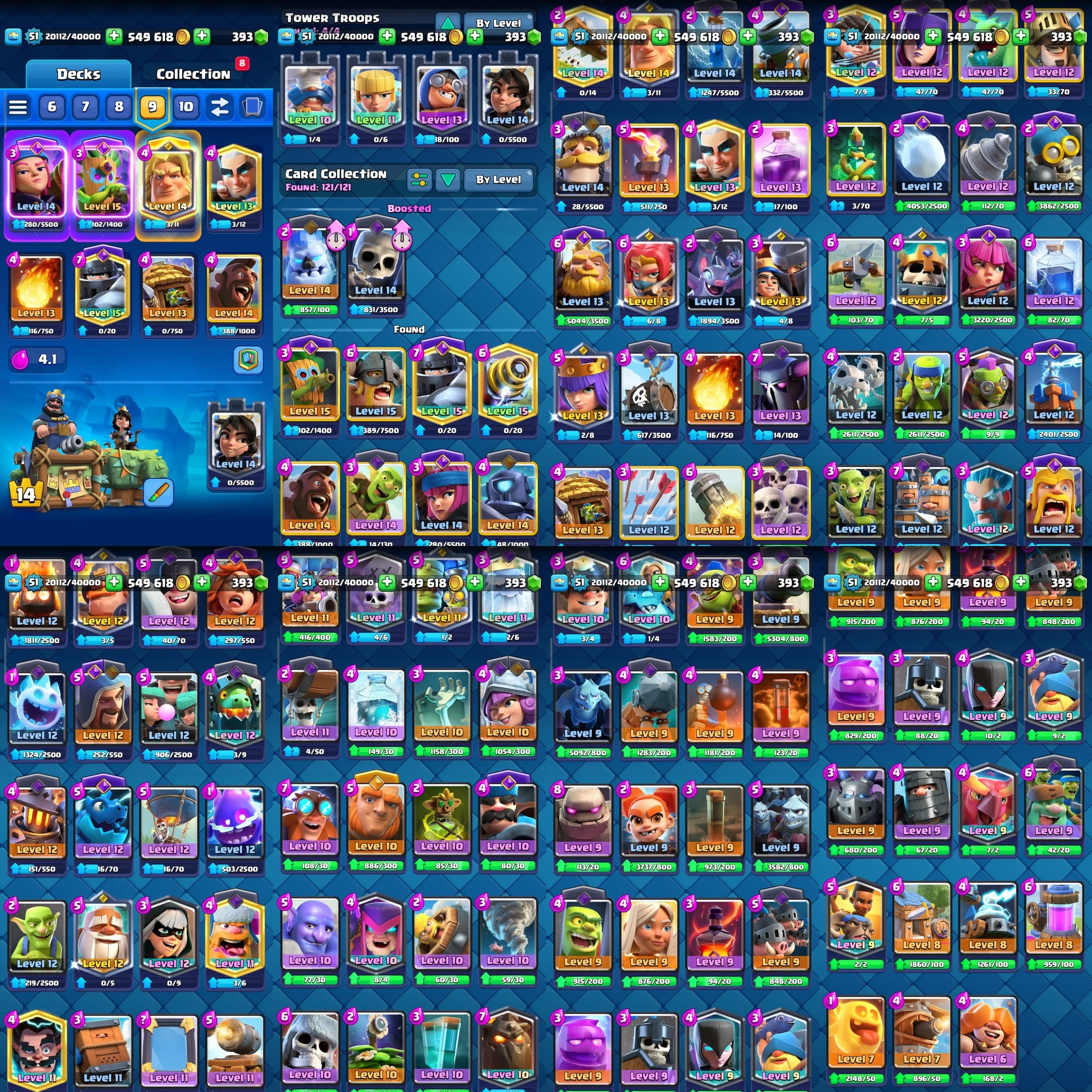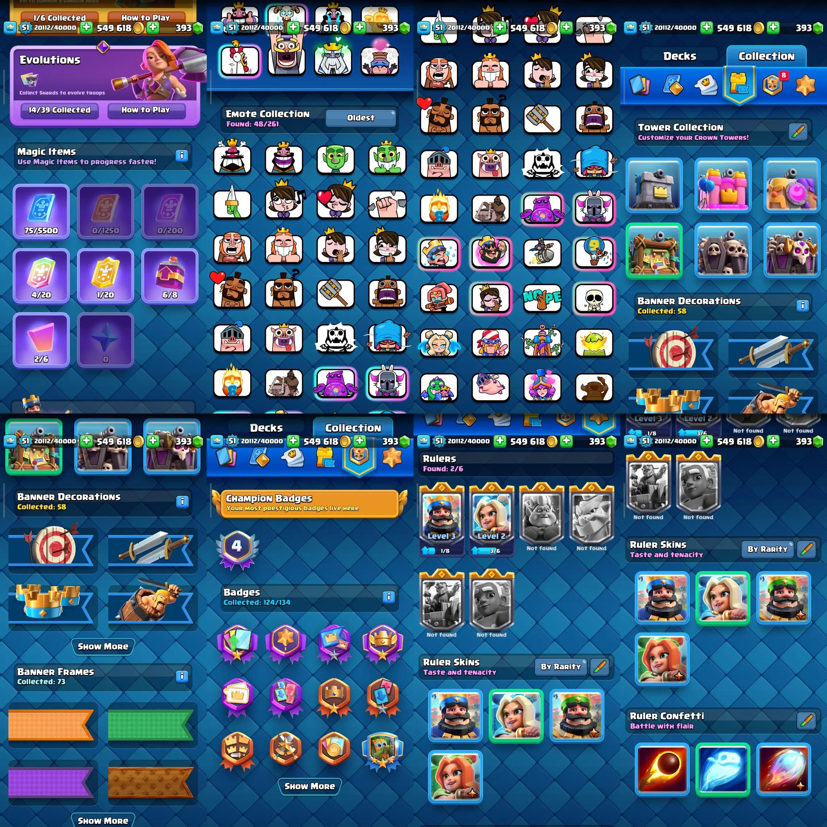 4 YR OLD CR, 9711 TROPHY, [4 ⸱ Level 15], [9 ⸱ Level 14], 1 HERO ,14 EVO, 48 RARE EMOTE, 6 TOWER , 124 BADGES, 73 FRAMES, 58 DECOR , ARENA 24 , LEVEL 51 | H197