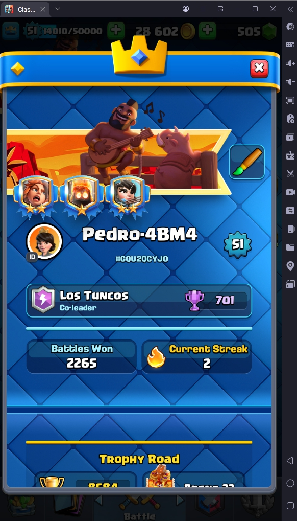 8584 TROPHY 🏆 51 LVL 💯 KT 14 👑 118 CARDS ♦️ 13 MAX CARDS 👑 3 ELITE CARDS 🔮 3 EVO 🔥 EMOTE 68 🎭 #GQU2QCYJ0 ⸱ TAG ACCOUNT ♥️