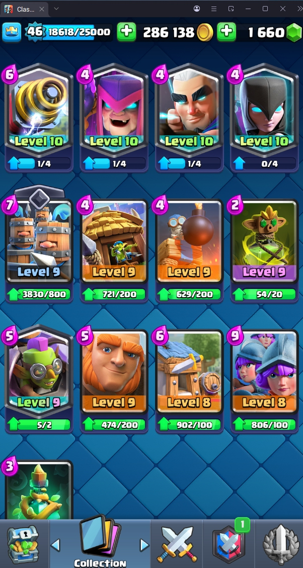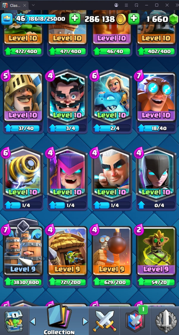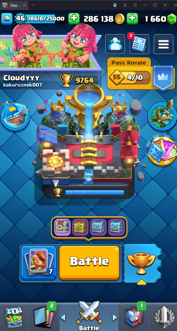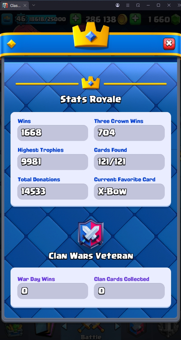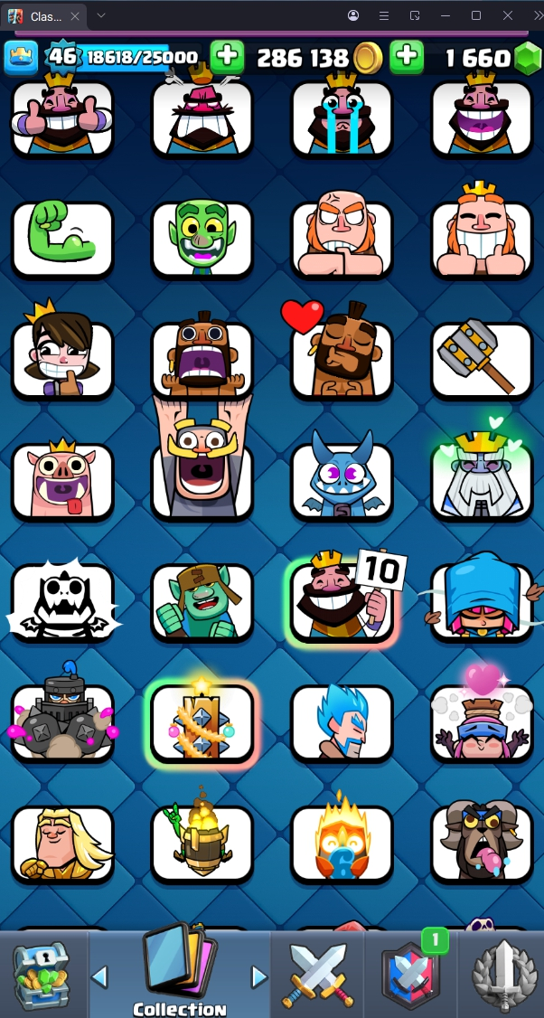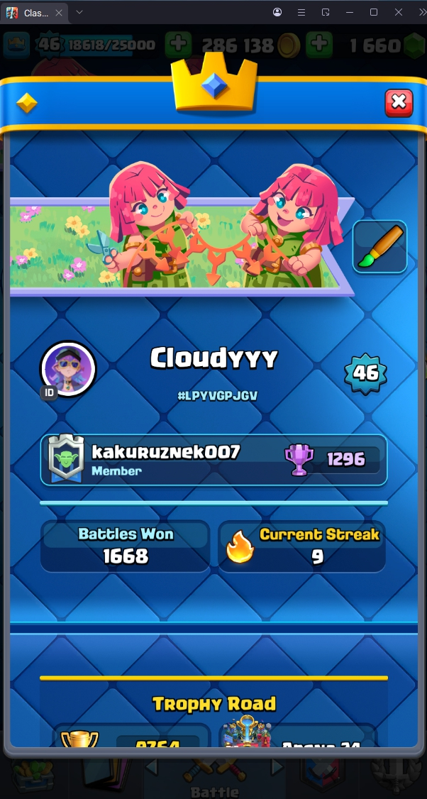 9764 TROPHY 🏆 46 LVL 💯 KT 14 👑 121 CARDS ♦️ 9 MAX CARDS 👑 2 ELITE CARDS 🔮 10 EVO 💯 EMOTE 47 🎭 #LPYVGPJGV ⸱ TAG ACCOUNT ♥️