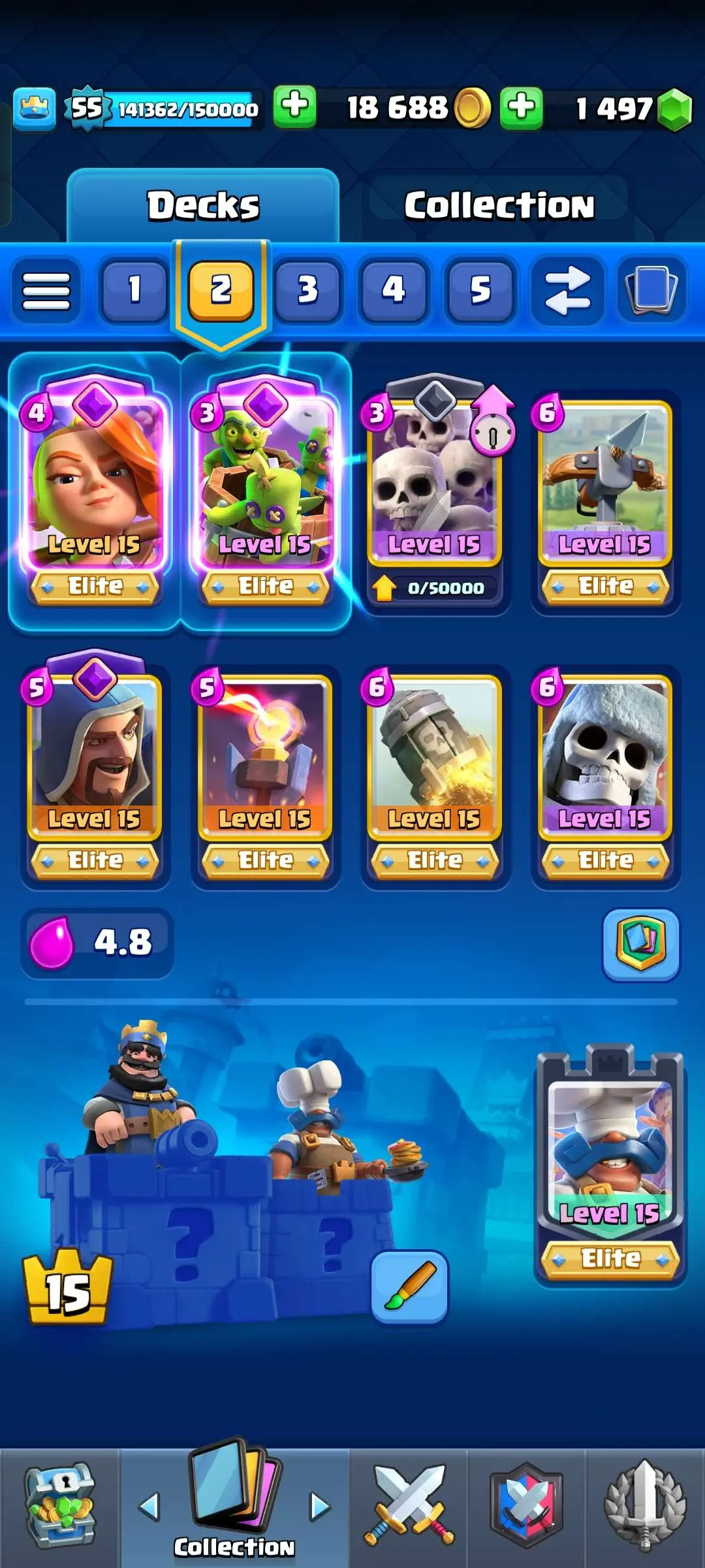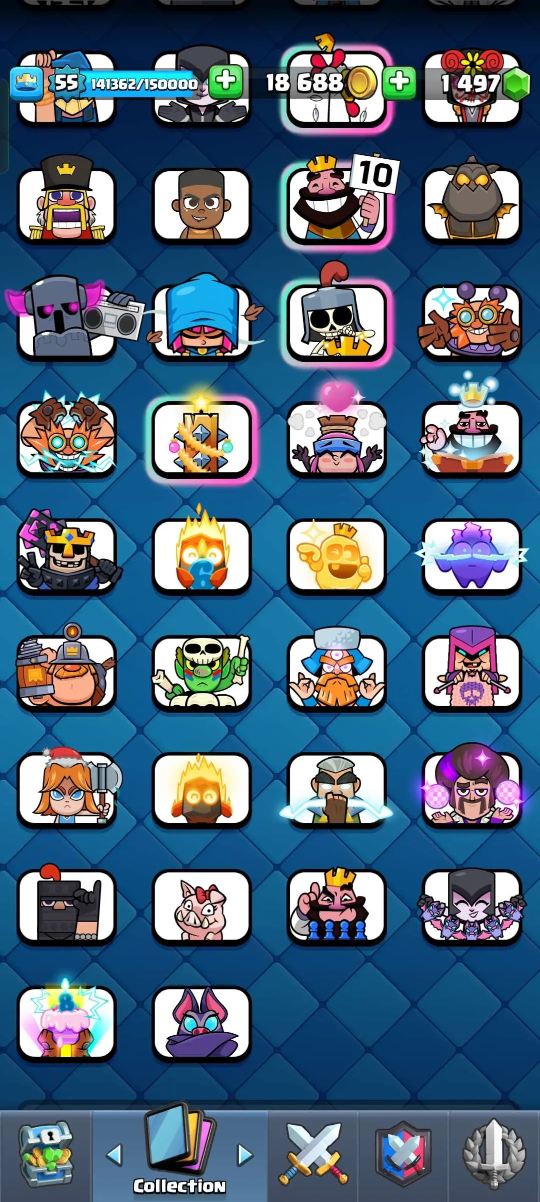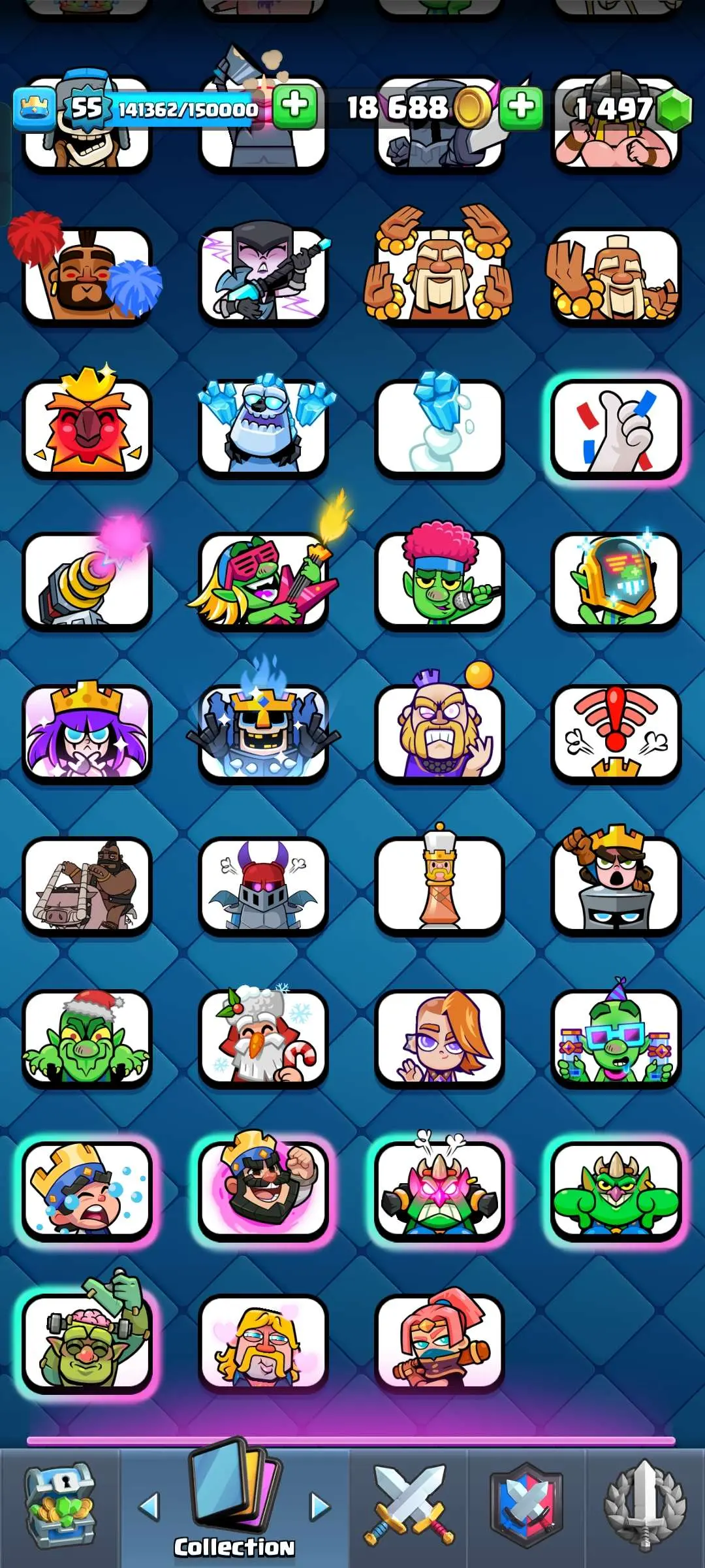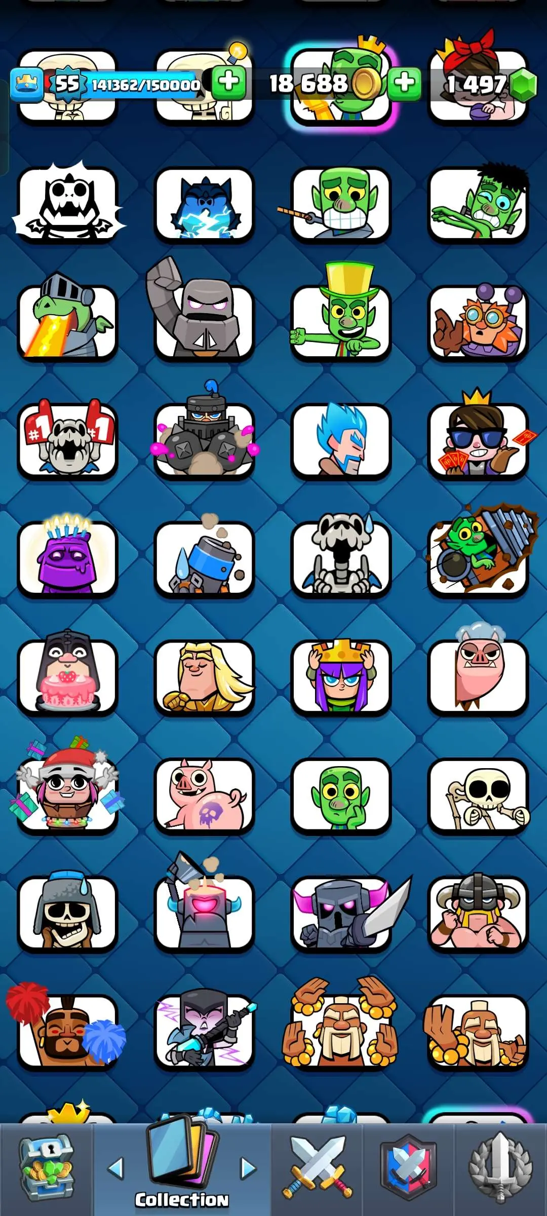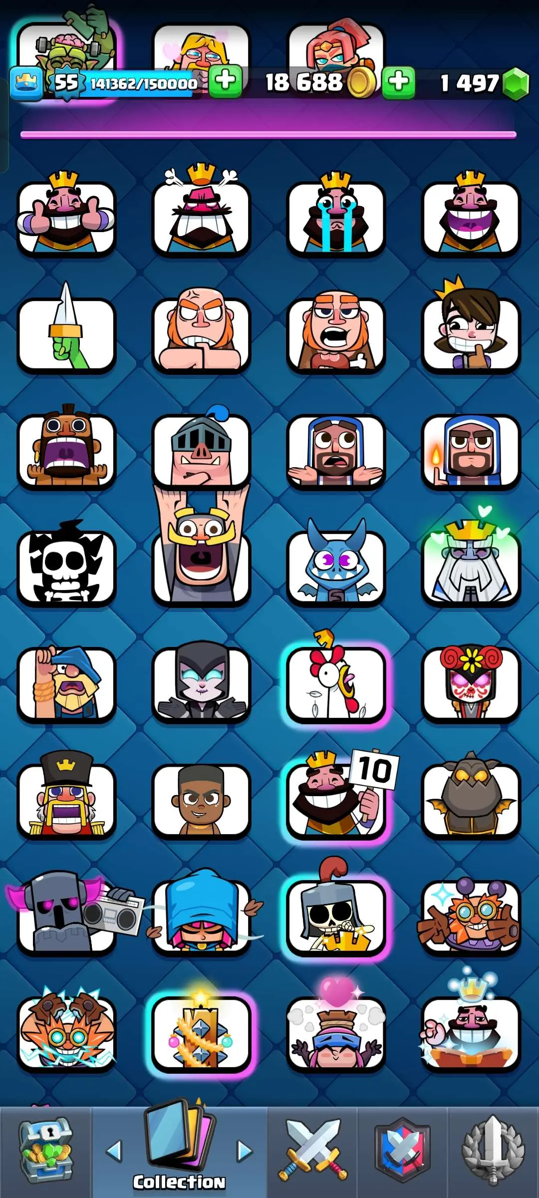 CR Lvl 55 ✨ 9700 Trophy✨ KT 15 ✨ 9 elite cards ✨ 48 max cards ✨ 10 Evo cards ✨ 133 emotes ✨ 6 Tower skins