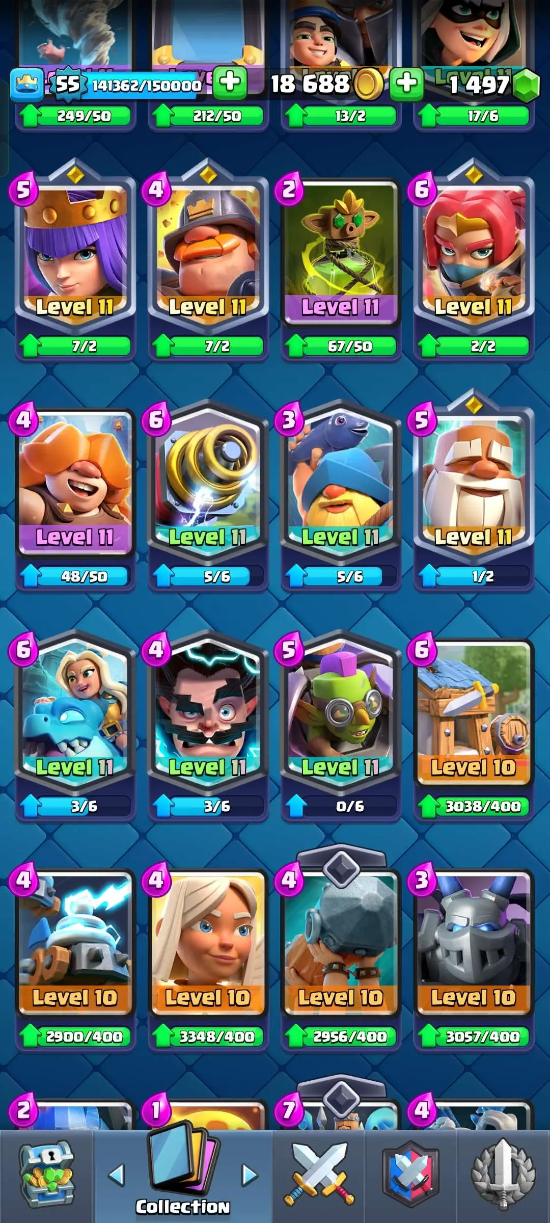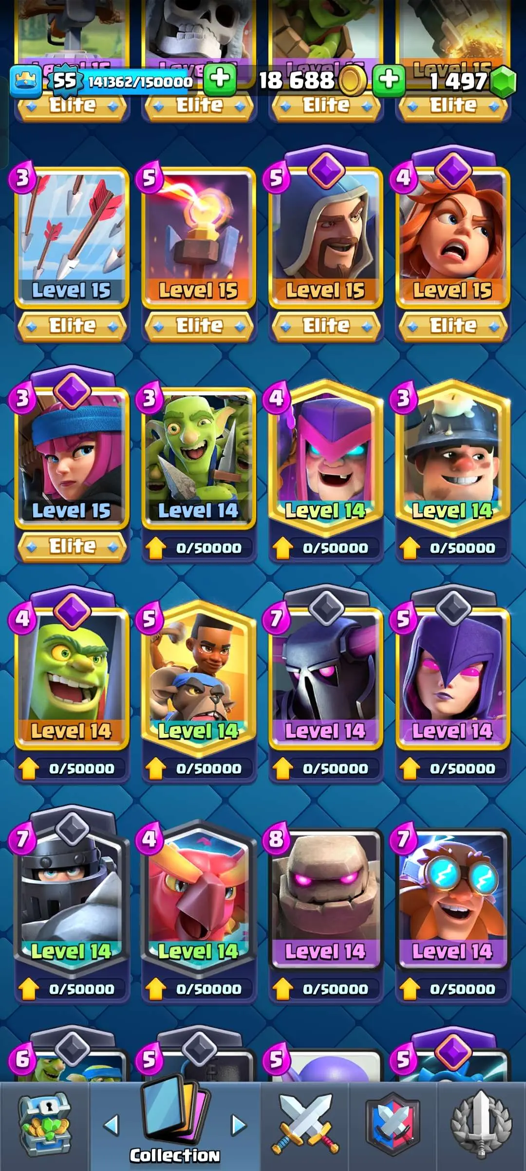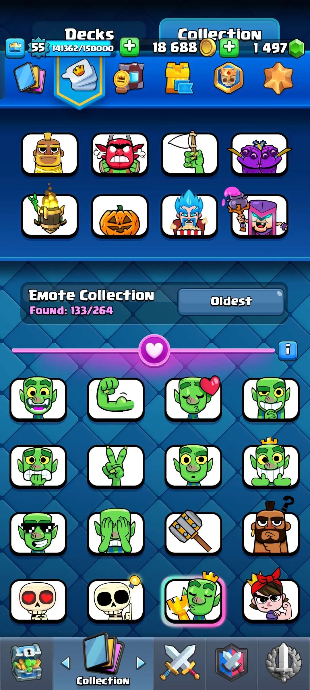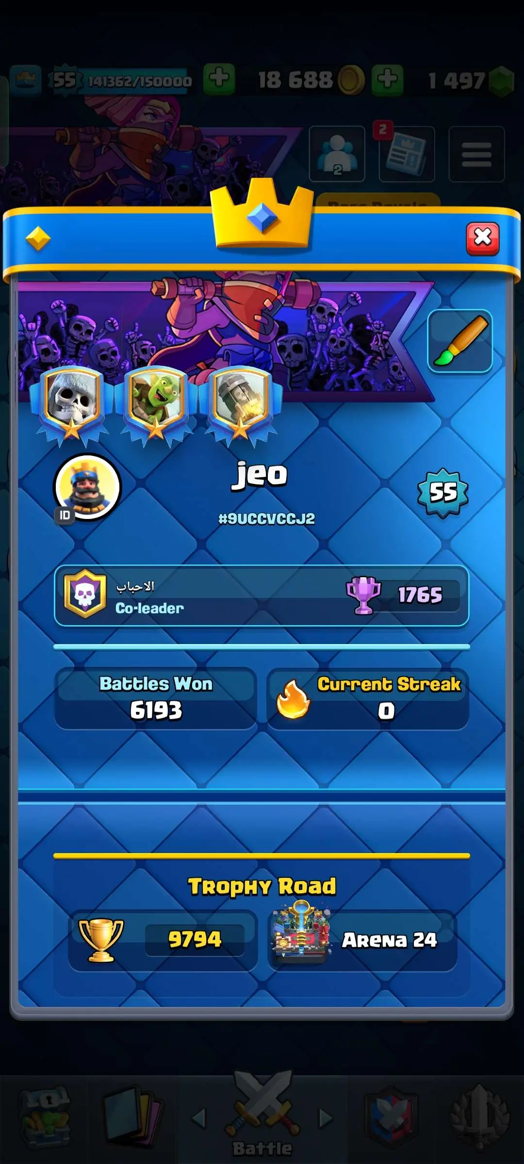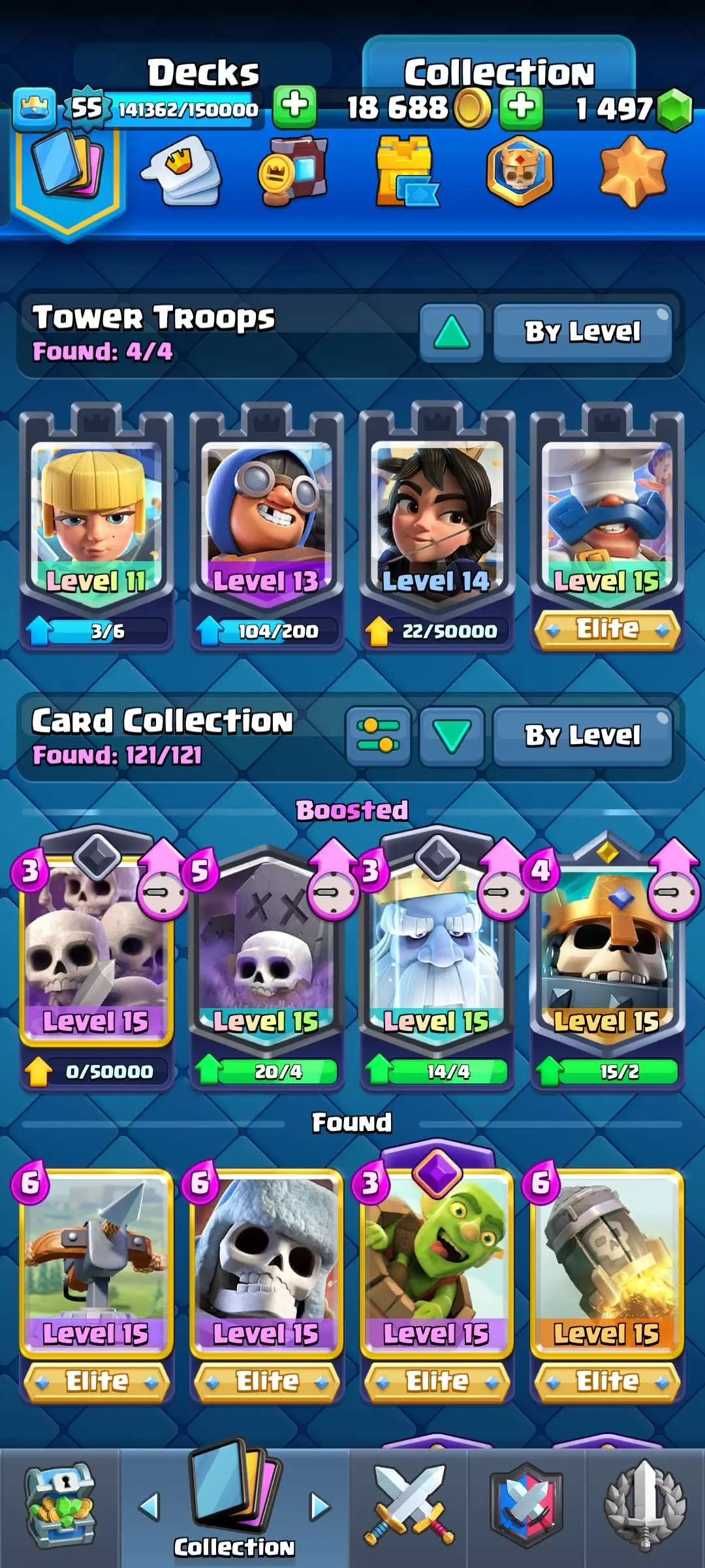 CR Lvl 55 ✨ 9700 Trophy✨ KT 15 ✨ 9 elite cards ✨ 48 max cards ✨ 10 Evo cards ✨ 133 emotes ✨ 6 Tower skins