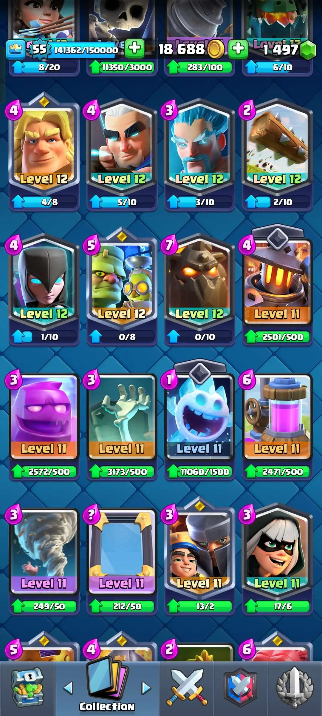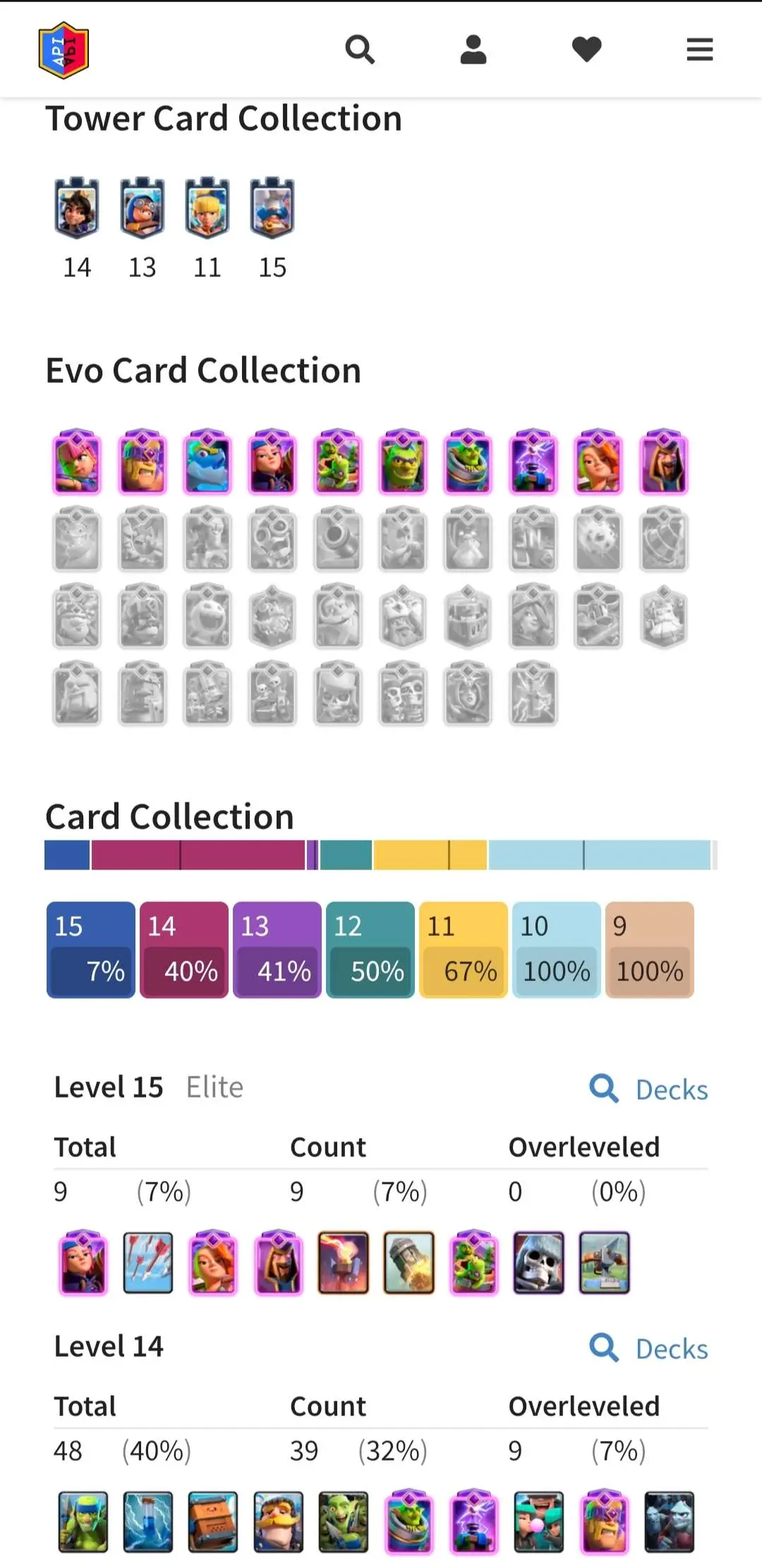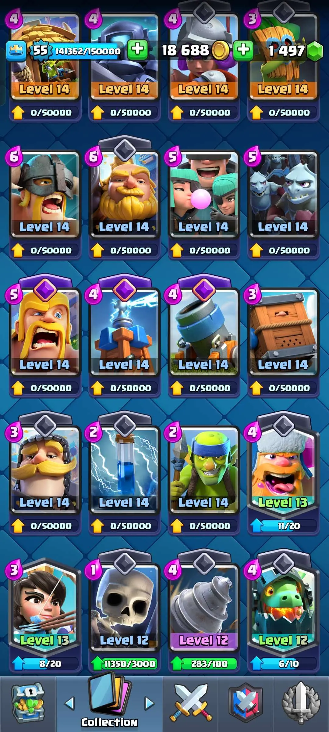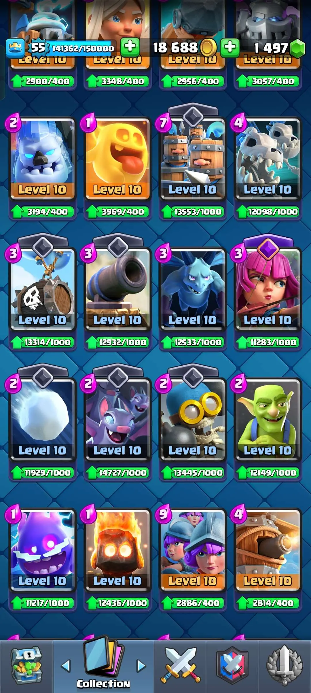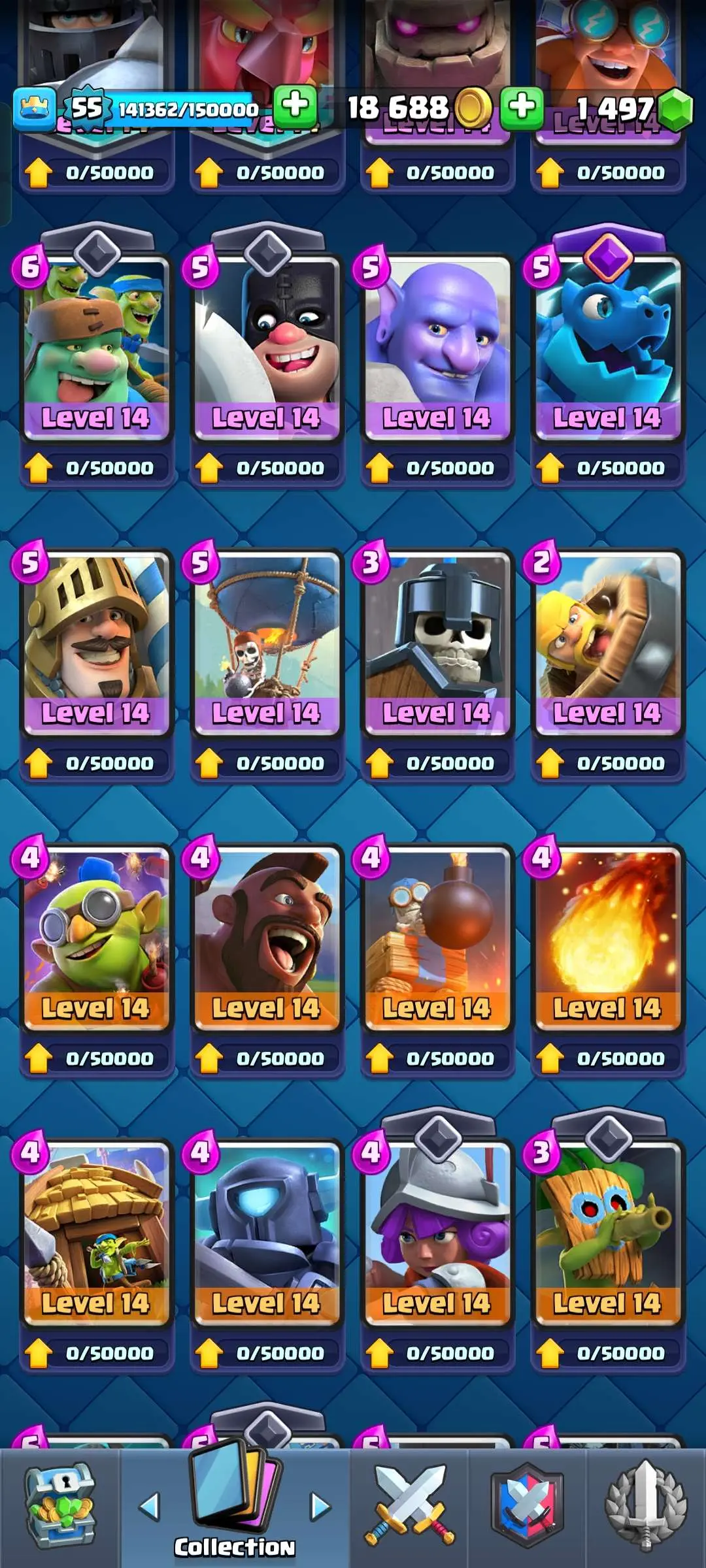 CR Lvl 55 ✨ 9700 Trophy✨ KT 15 ✨ 9 elite cards ✨ 48 max cards ✨ 10 Evo cards ✨ 133 emotes ✨ 6 Tower skins
