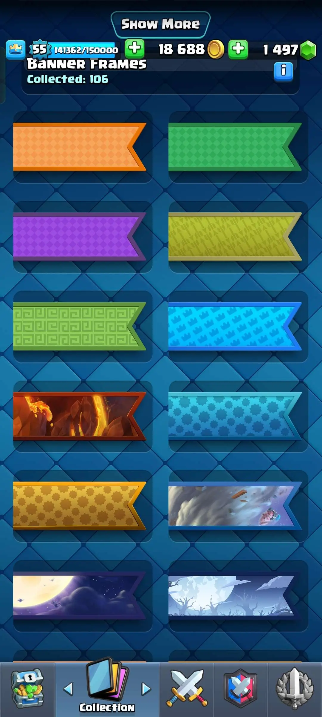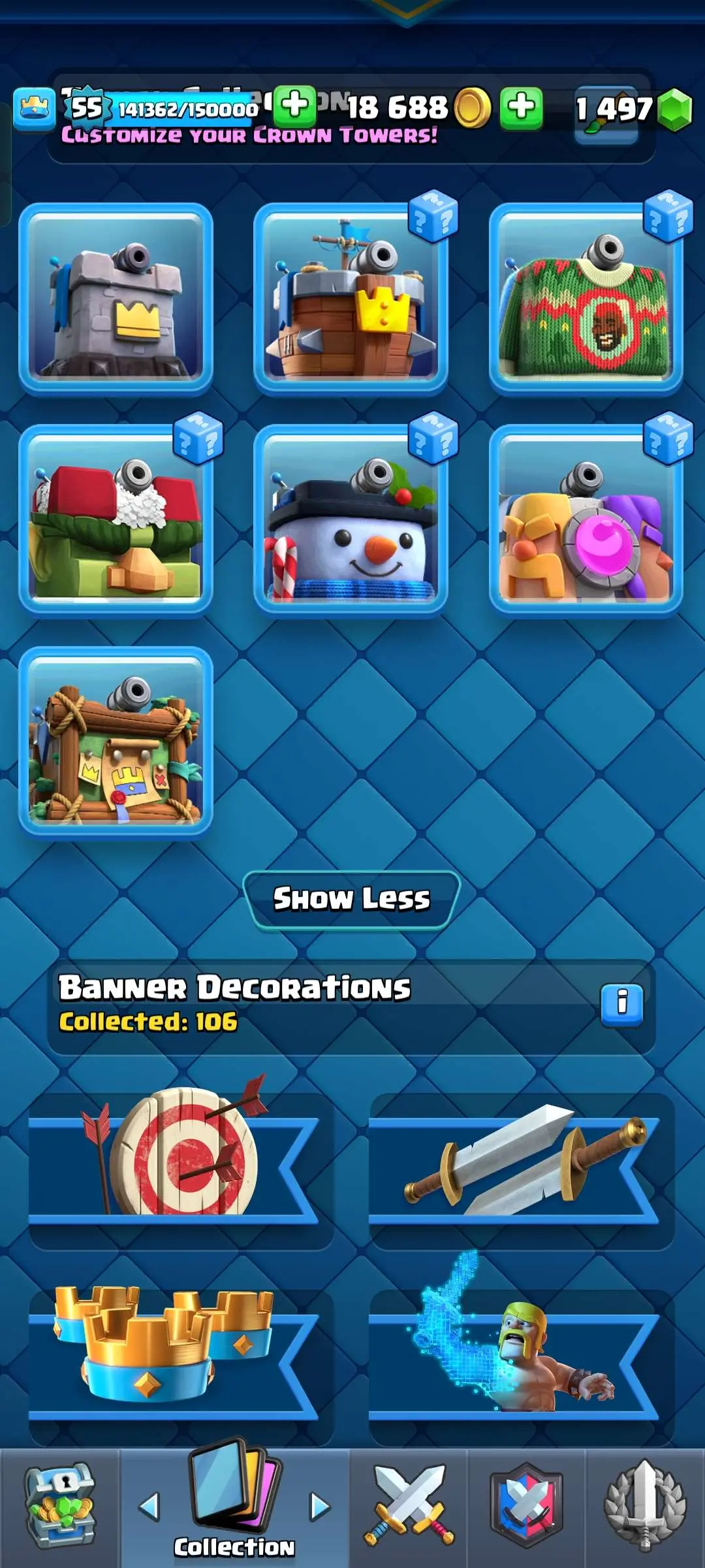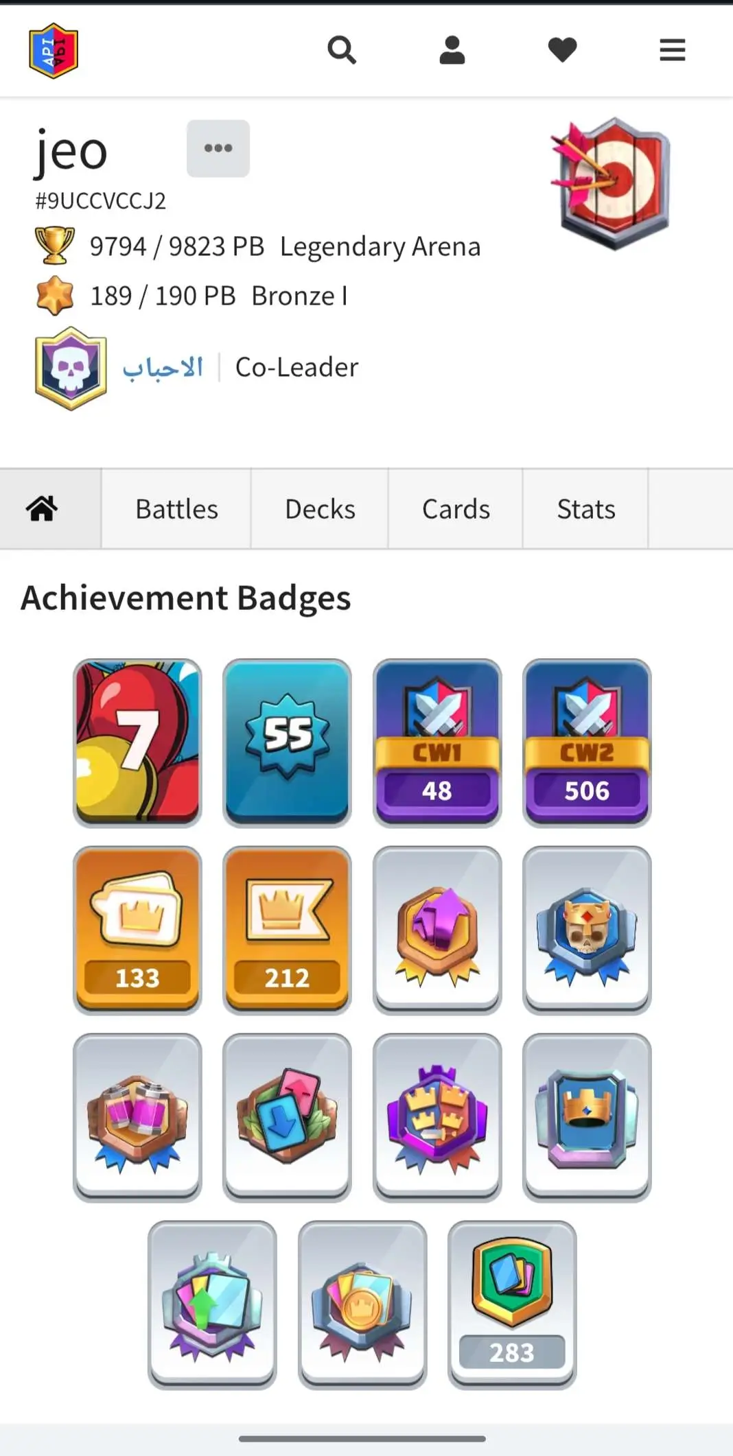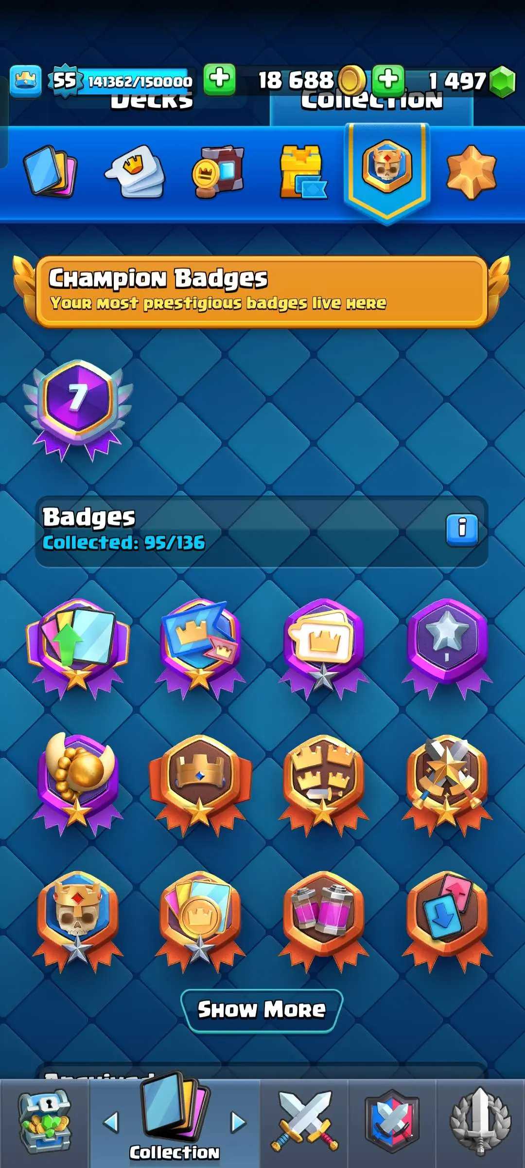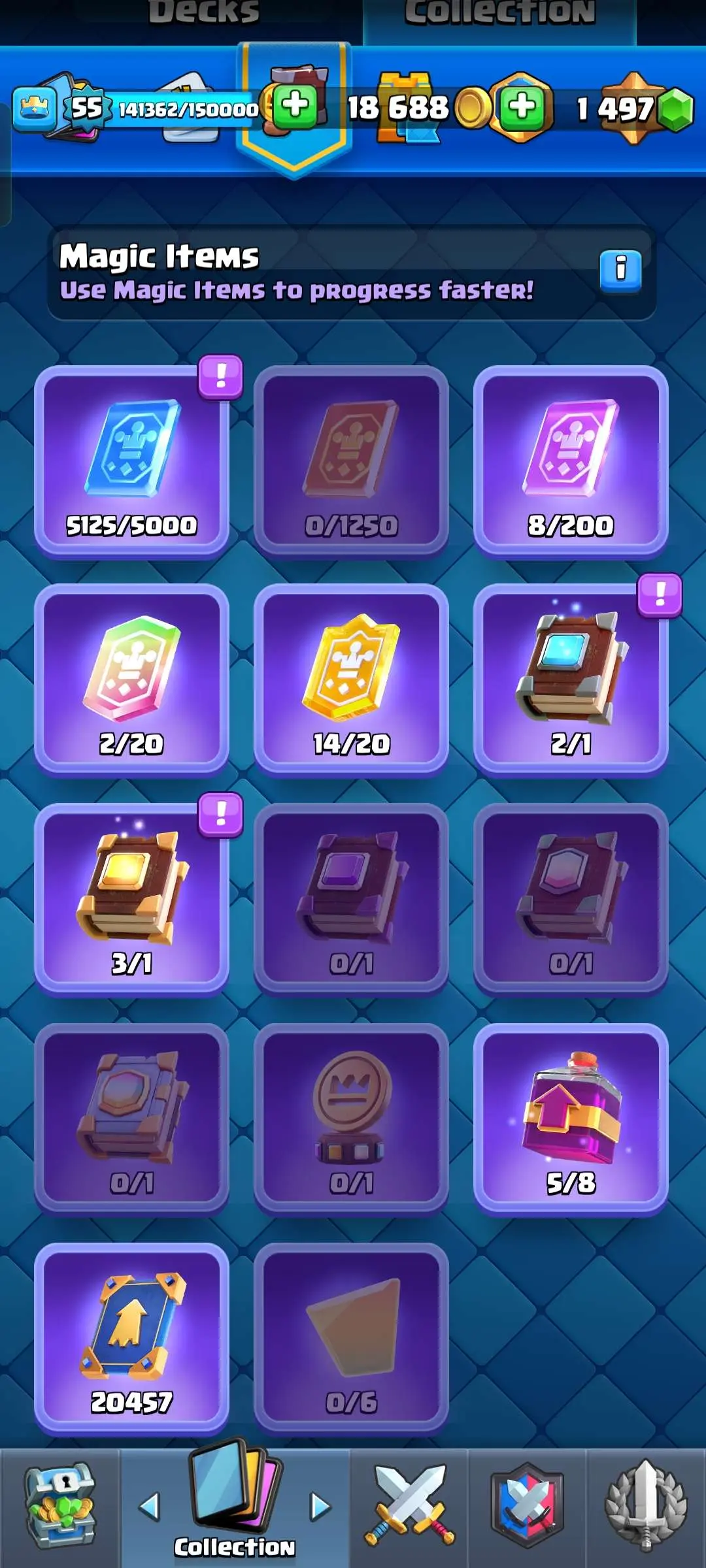 CR Lvl 55 ✨ 9700 Trophy✨ KT 15 ✨ 9 elite cards ✨ 48 max cards ✨ 10 Evo cards ✨ 133 emotes ✨ 6 Tower skins