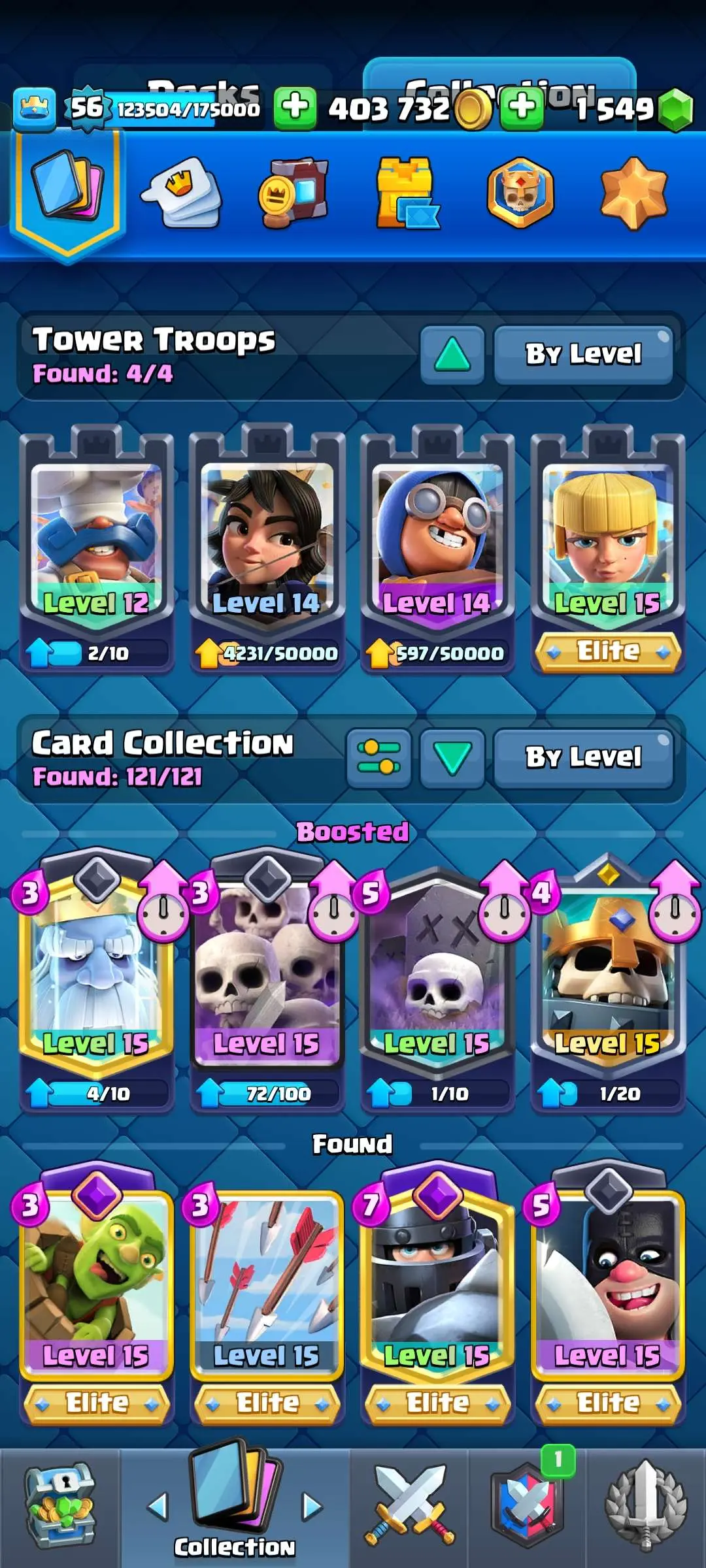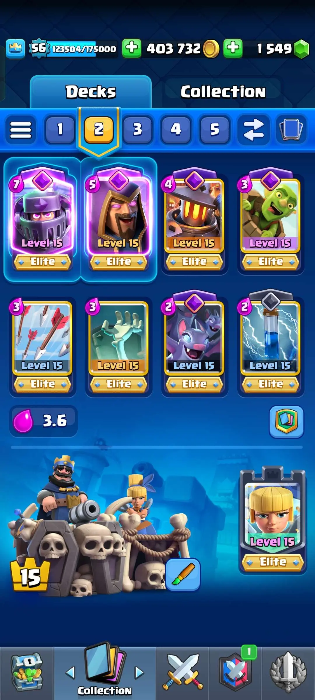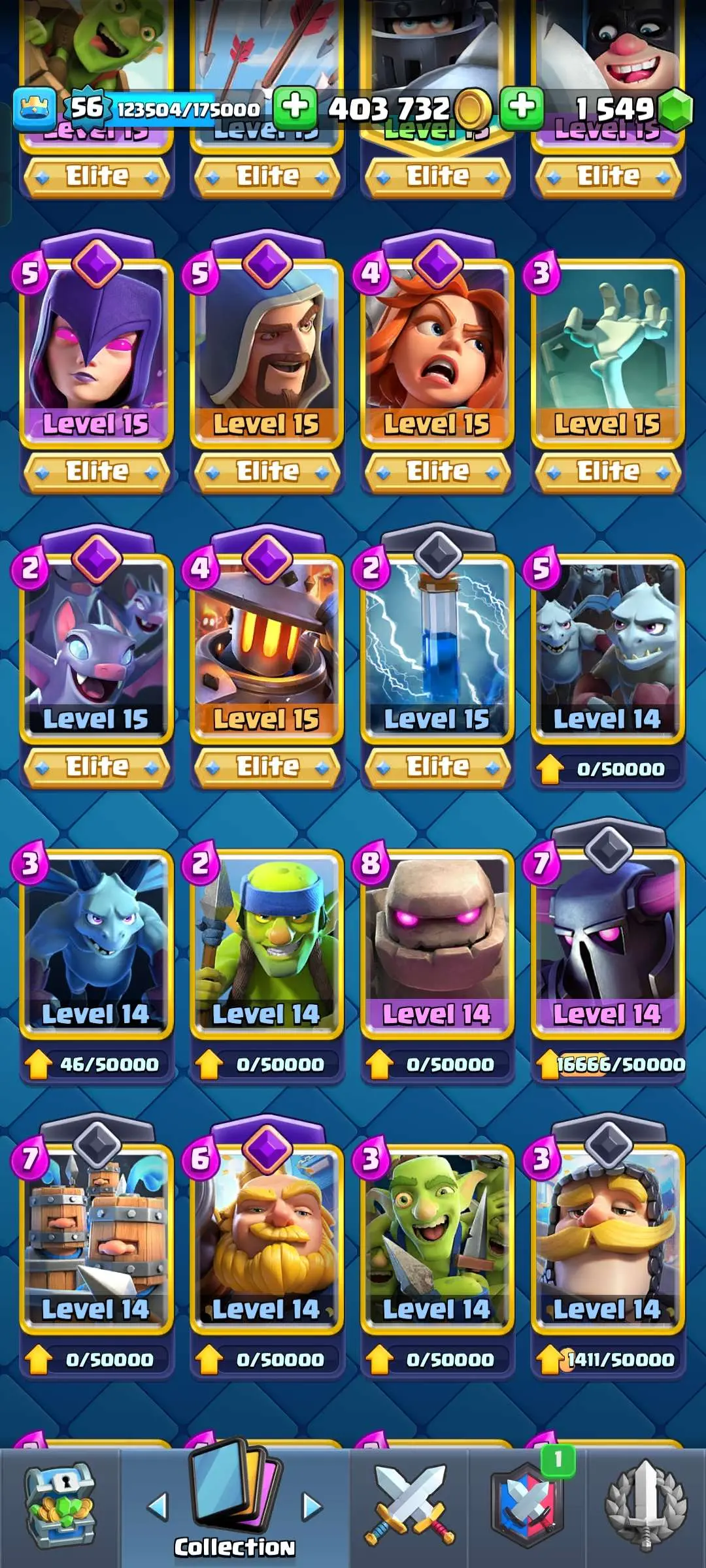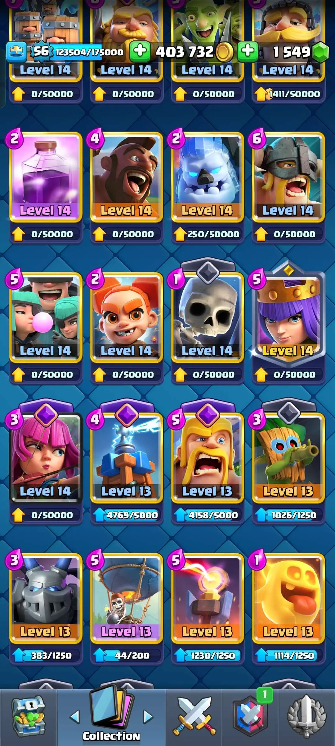 CR Lvl 56 ✨ 14500 Trophy ✨ 9 years badge ✨ KT 15 ✨ 11 Elite Cards ✨ 29 Max Cards ✨ 14 Evo Cards ✨ 69 Emotes ✨ 12 tower skins