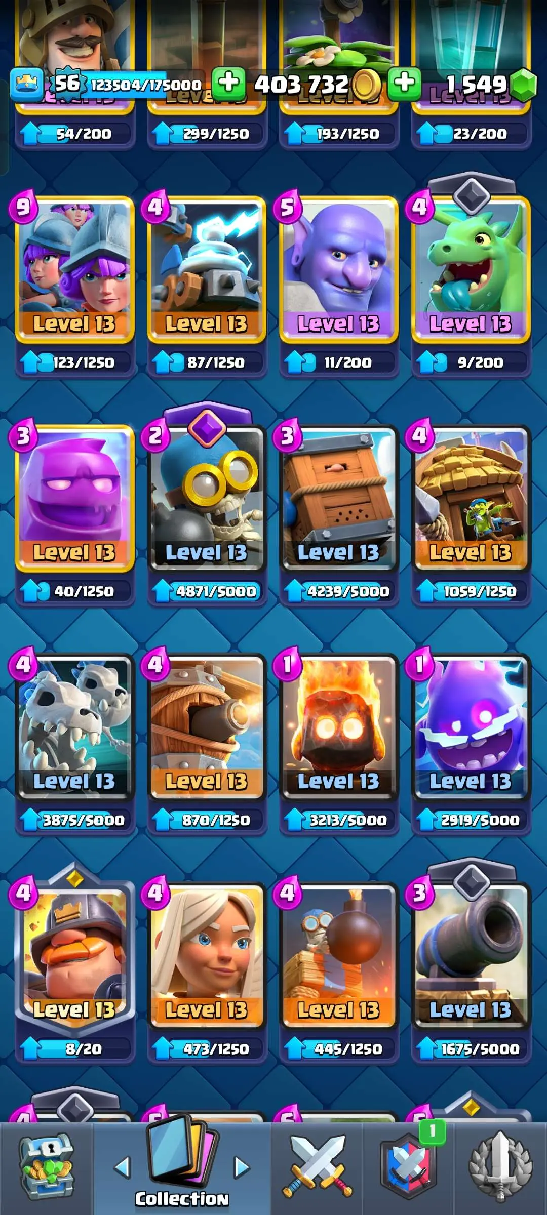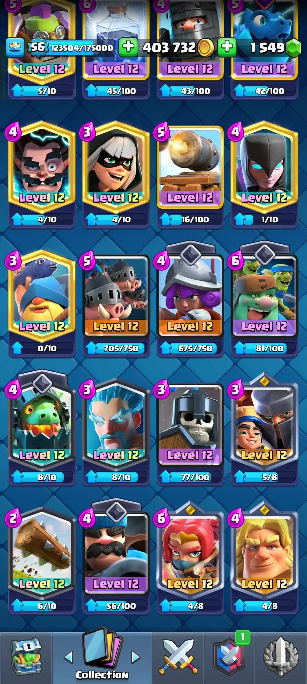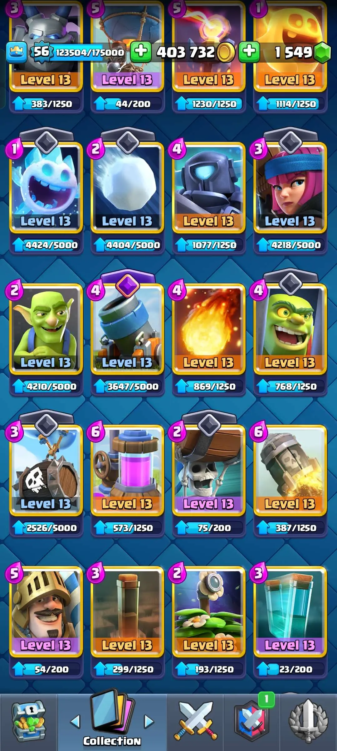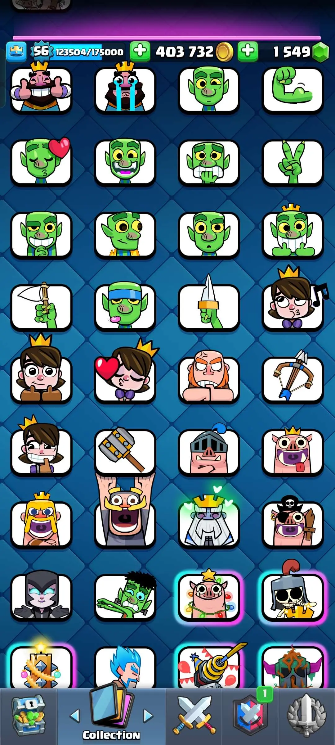 CR Lvl 56 ✨ 14500 Trophy ✨ 9 years badge ✨ KT 15 ✨ 11 Elite Cards ✨ 29 Max Cards ✨ 14 Evo Cards ✨ 69 Emotes ✨ 12 tower skins