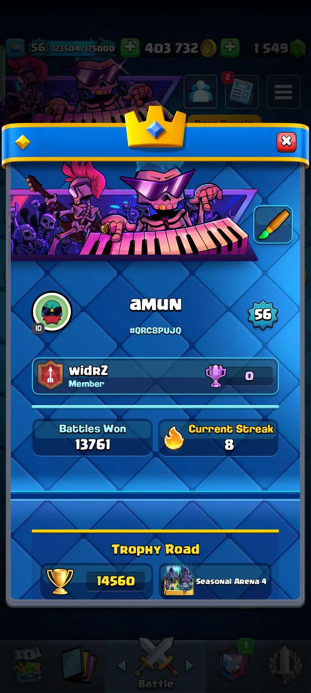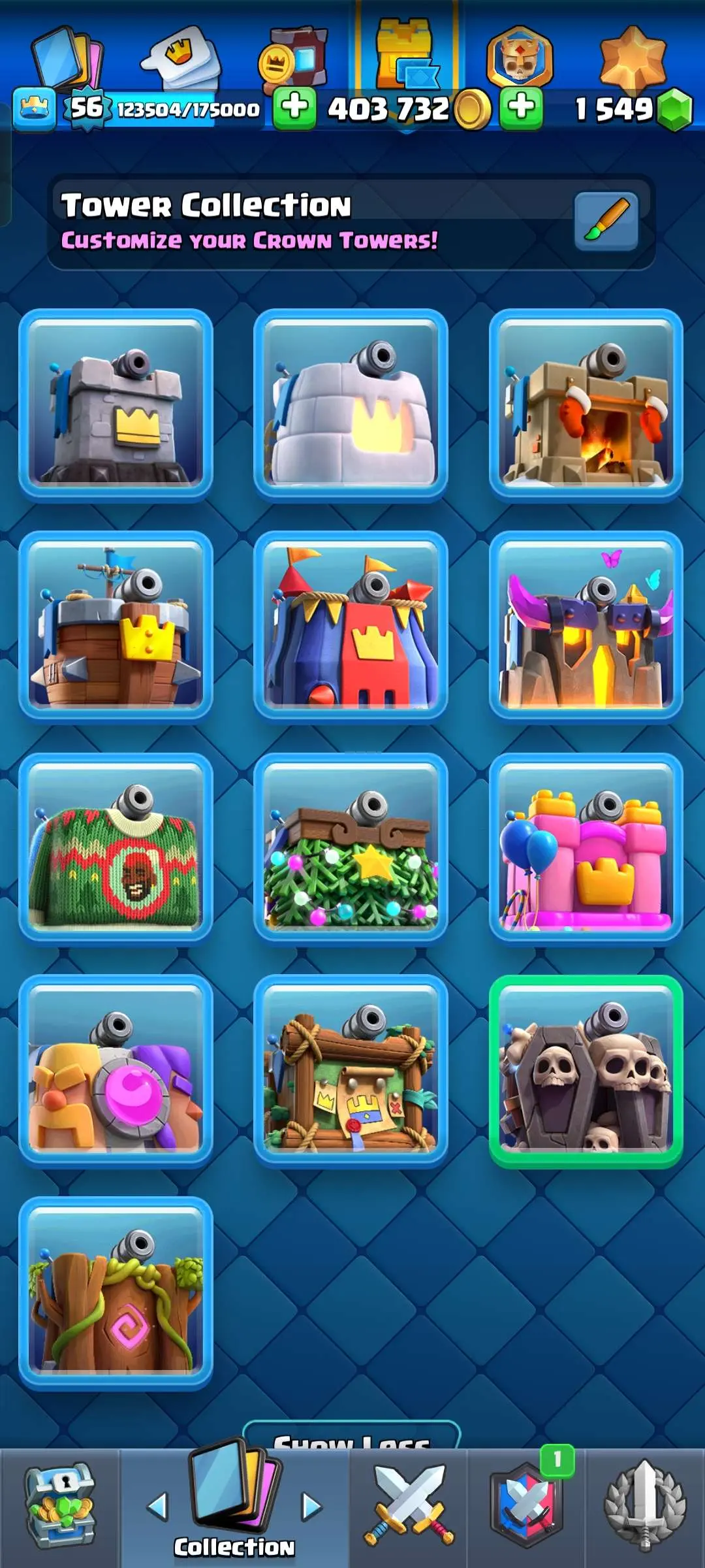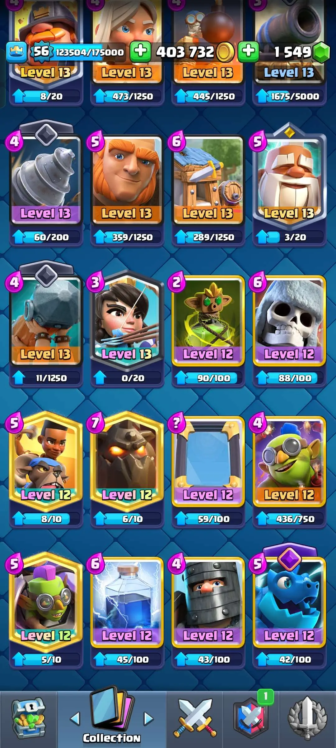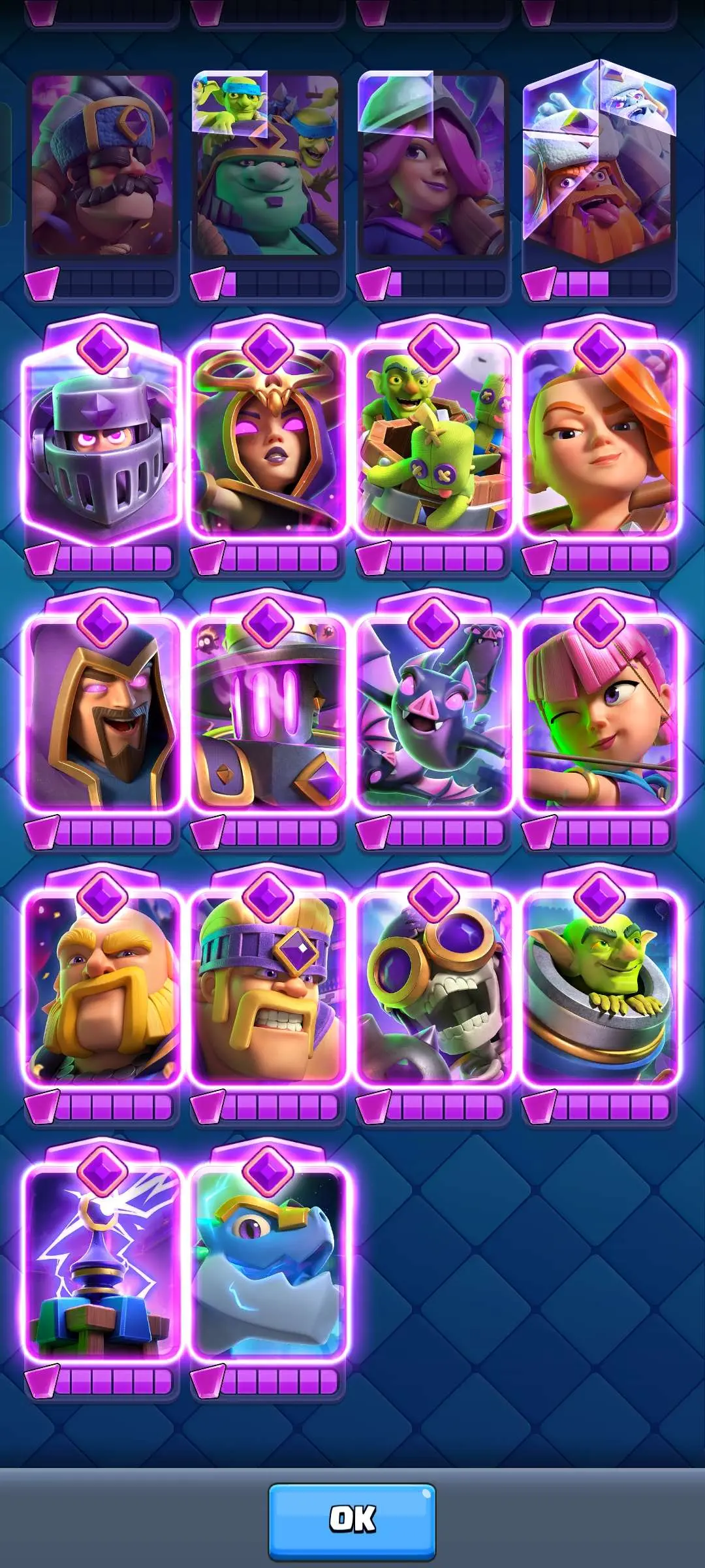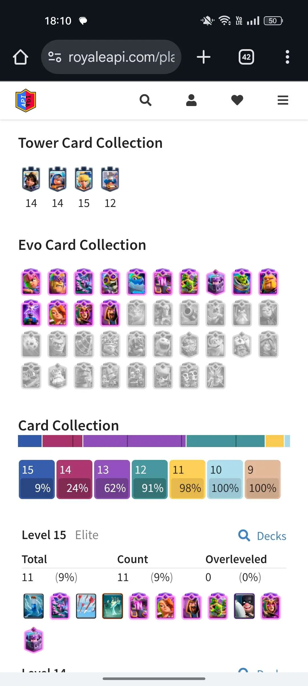 CR Lvl 56 ✨ 14500 Trophy ✨ 9 years badge ✨ KT 15 ✨ 11 Elite Cards ✨ 29 Max Cards ✨ 14 Evo Cards ✨ 69 Emotes ✨ 12 tower skins