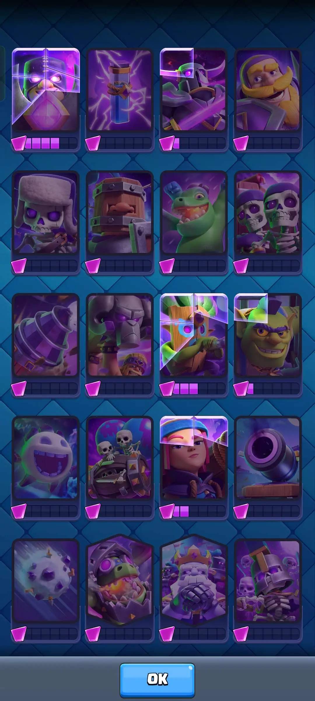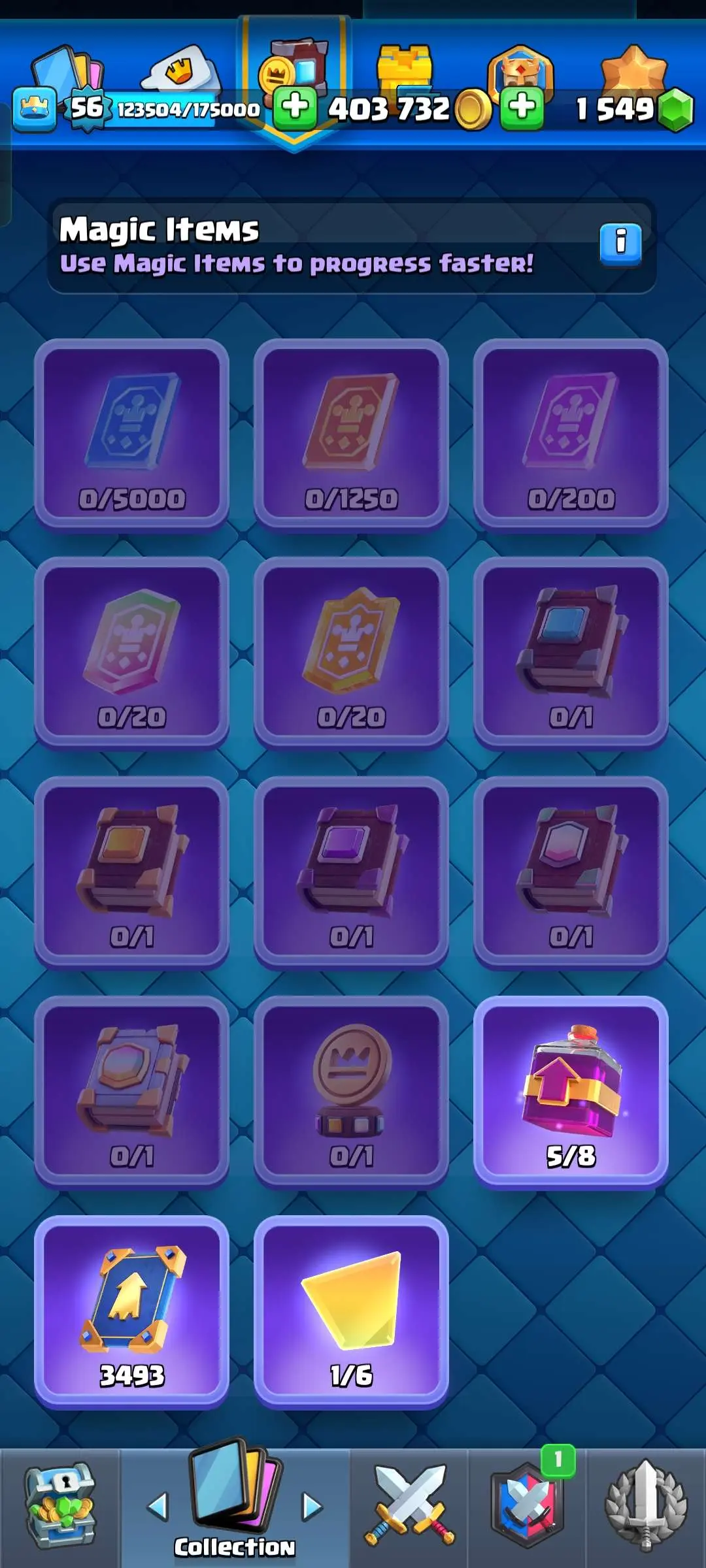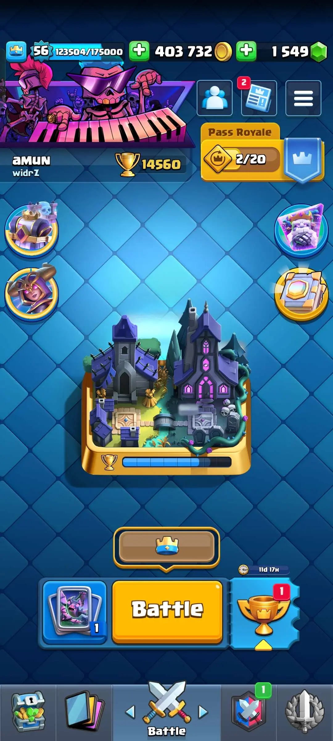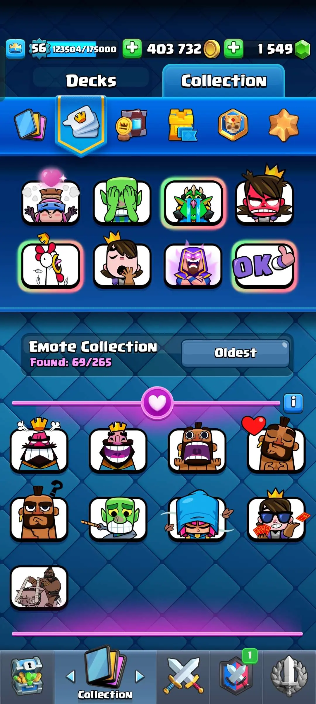 CR Lvl 56 ✨ 14500 Trophy ✨ 9 years badge ✨ KT 15 ✨ 11 Elite Cards ✨ 29 Max Cards ✨ 14 Evo Cards ✨ 69 Emotes ✨ 12 tower skins