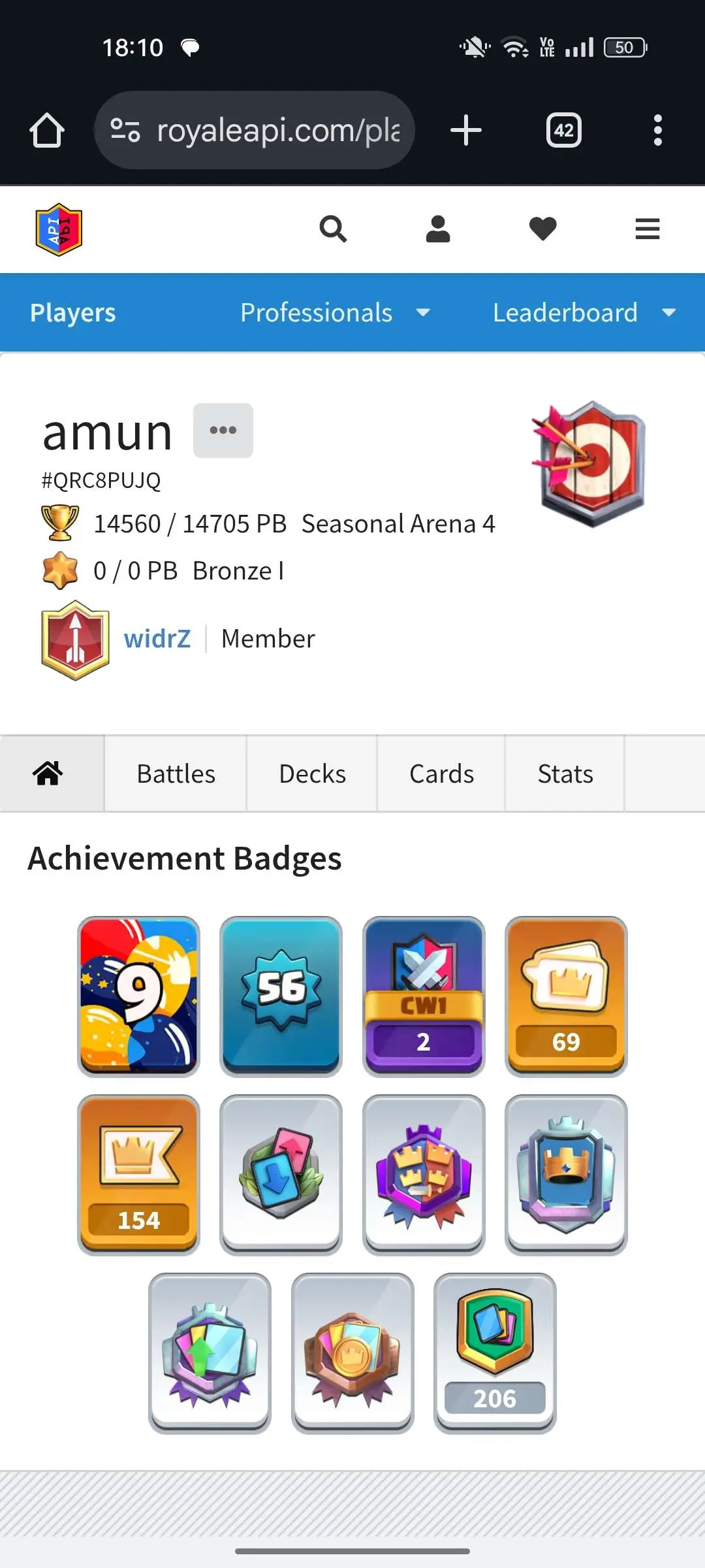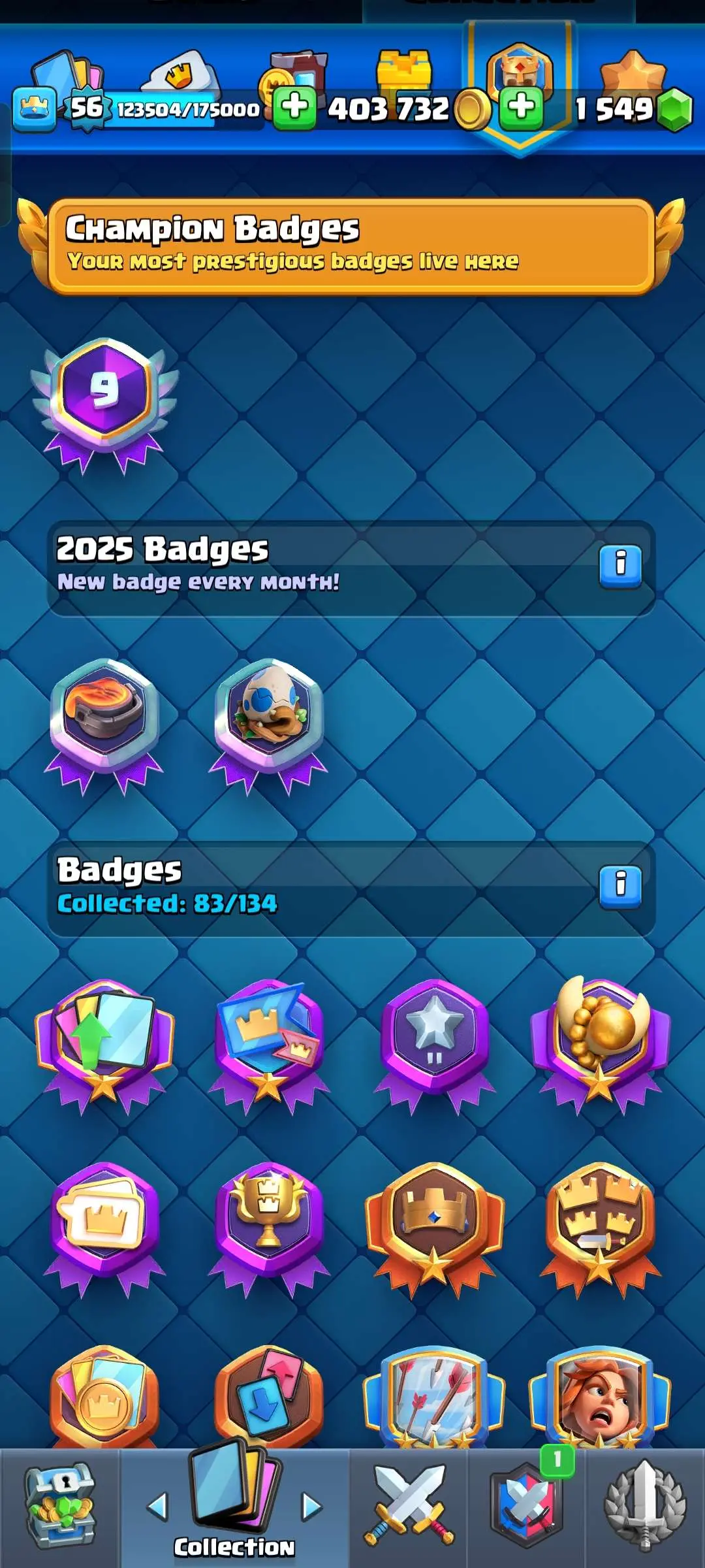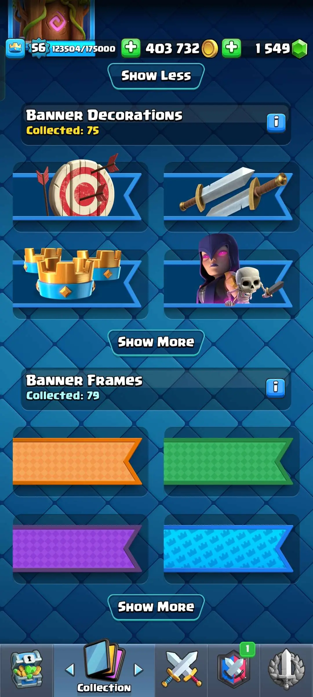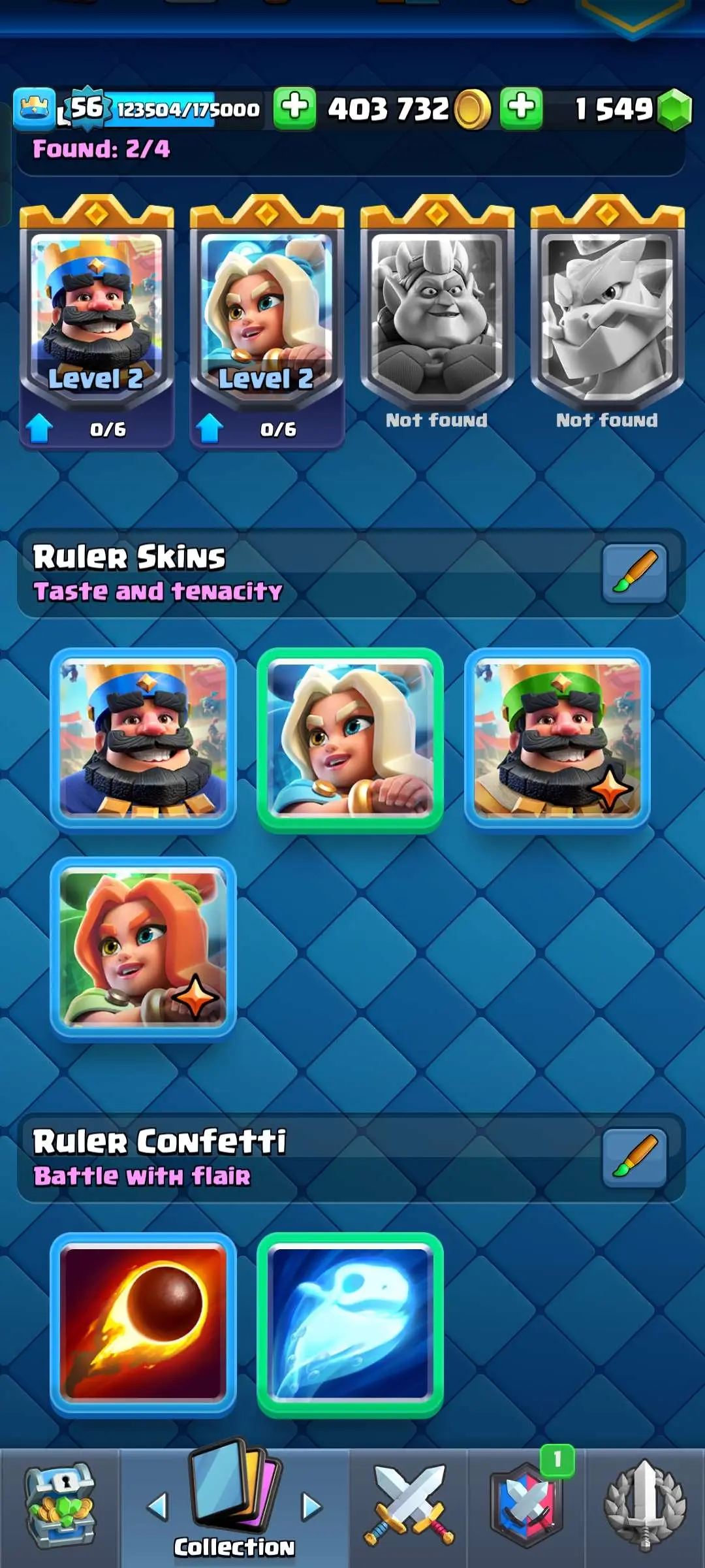 CR Lvl 56 ✨ 14500 Trophy ✨ 9 years badge ✨ KT 15 ✨ 11 Elite Cards ✨ 29 Max Cards ✨ 14 Evo Cards ✨ 69 Emotes ✨ 12 tower skins
