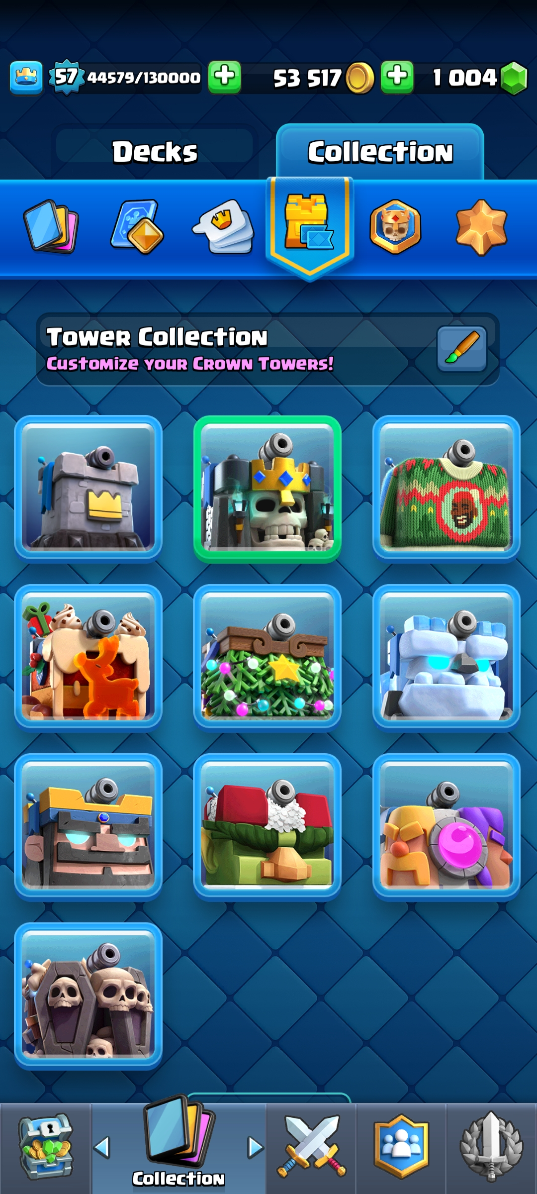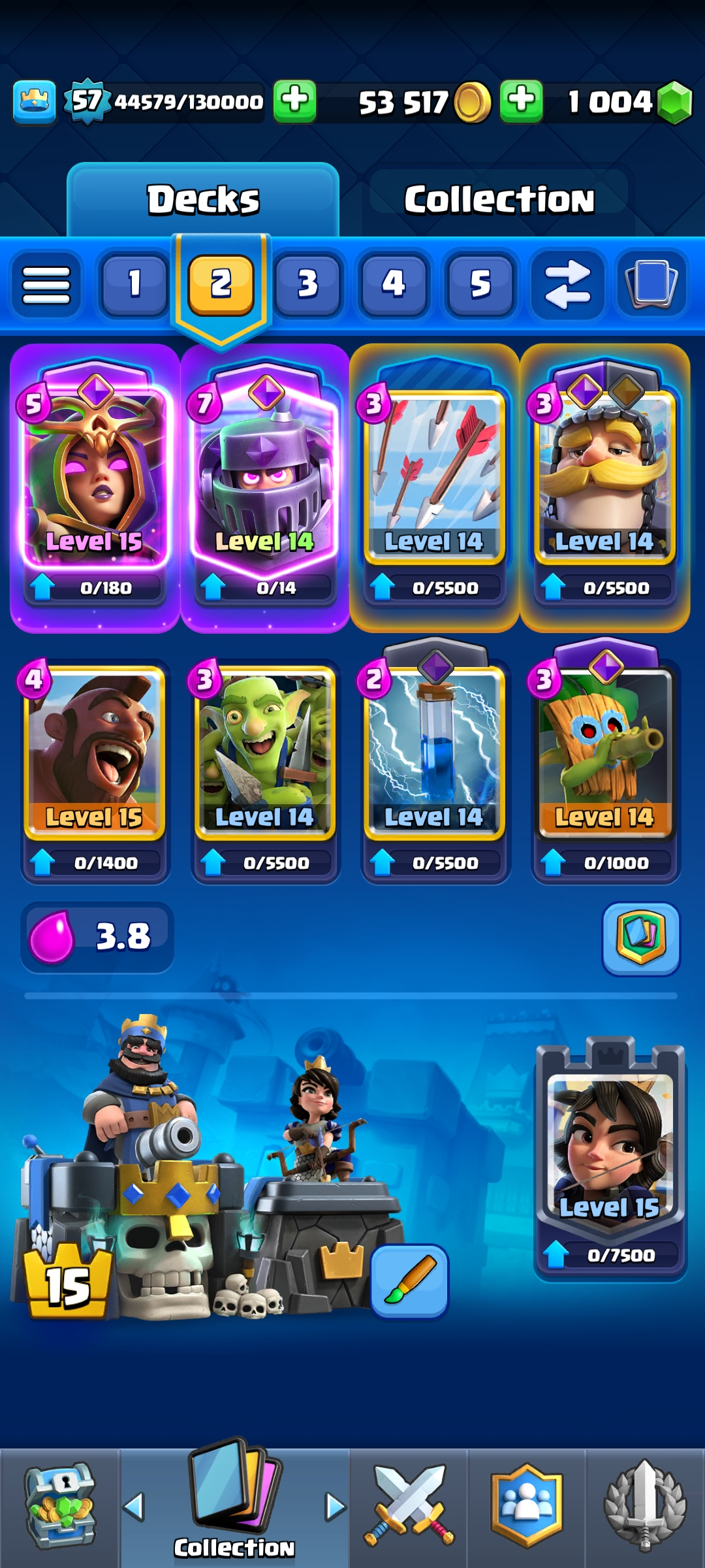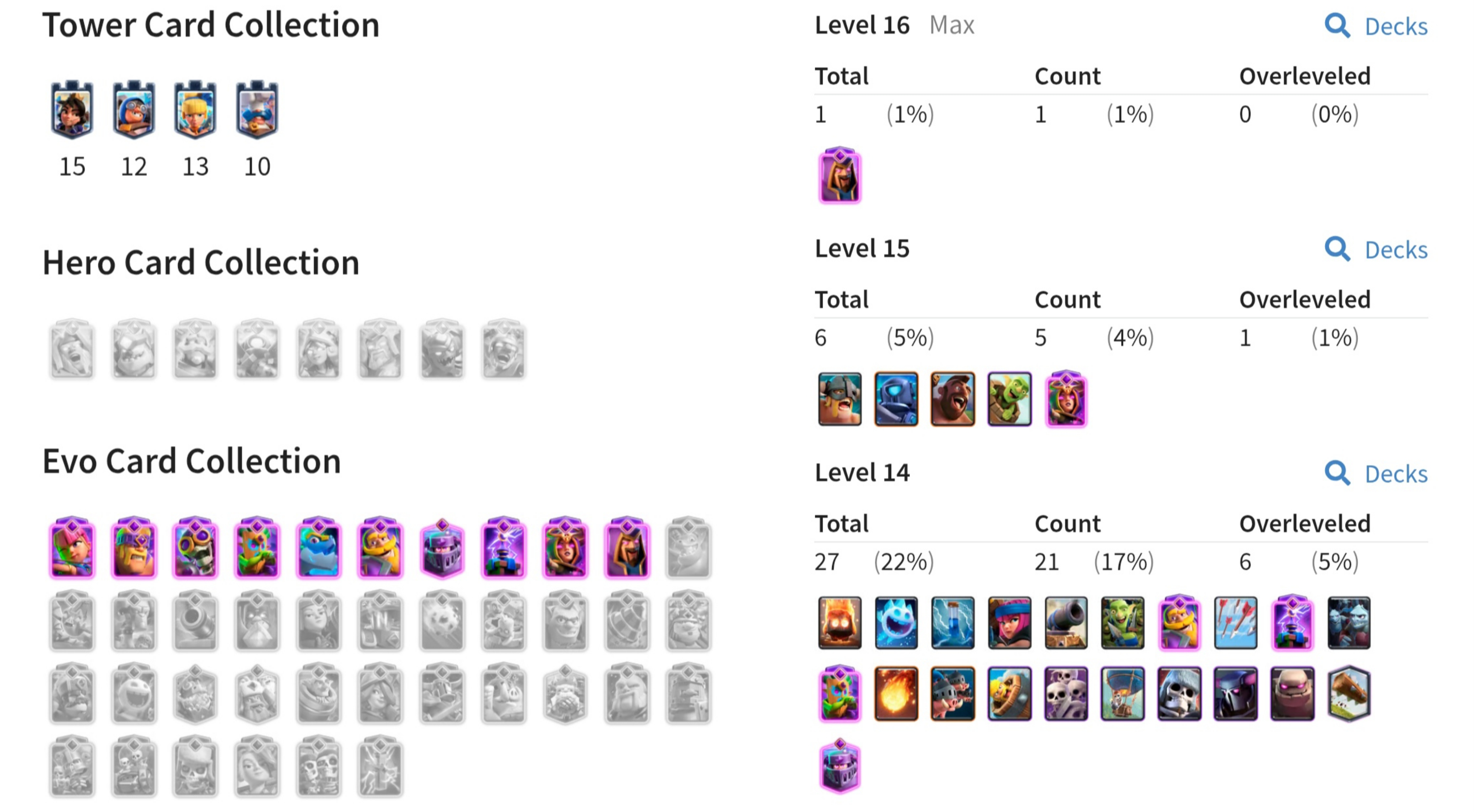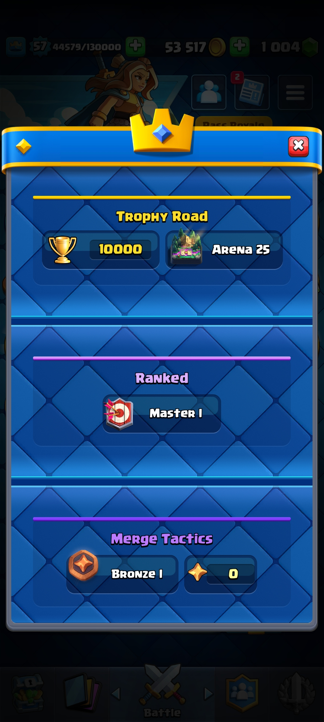 ⭐ KT 15 ⭐ 57 EXP ⭐ 10 Evolution ⭐ 1 Level 16 , 5 Level 15 & 21 Level 14 Cards ⭐ 96 Emotes ⭐ Namechange 500⭐ 9 Towerskins ⭐ 10k Trophies ⭐ 1k Gems