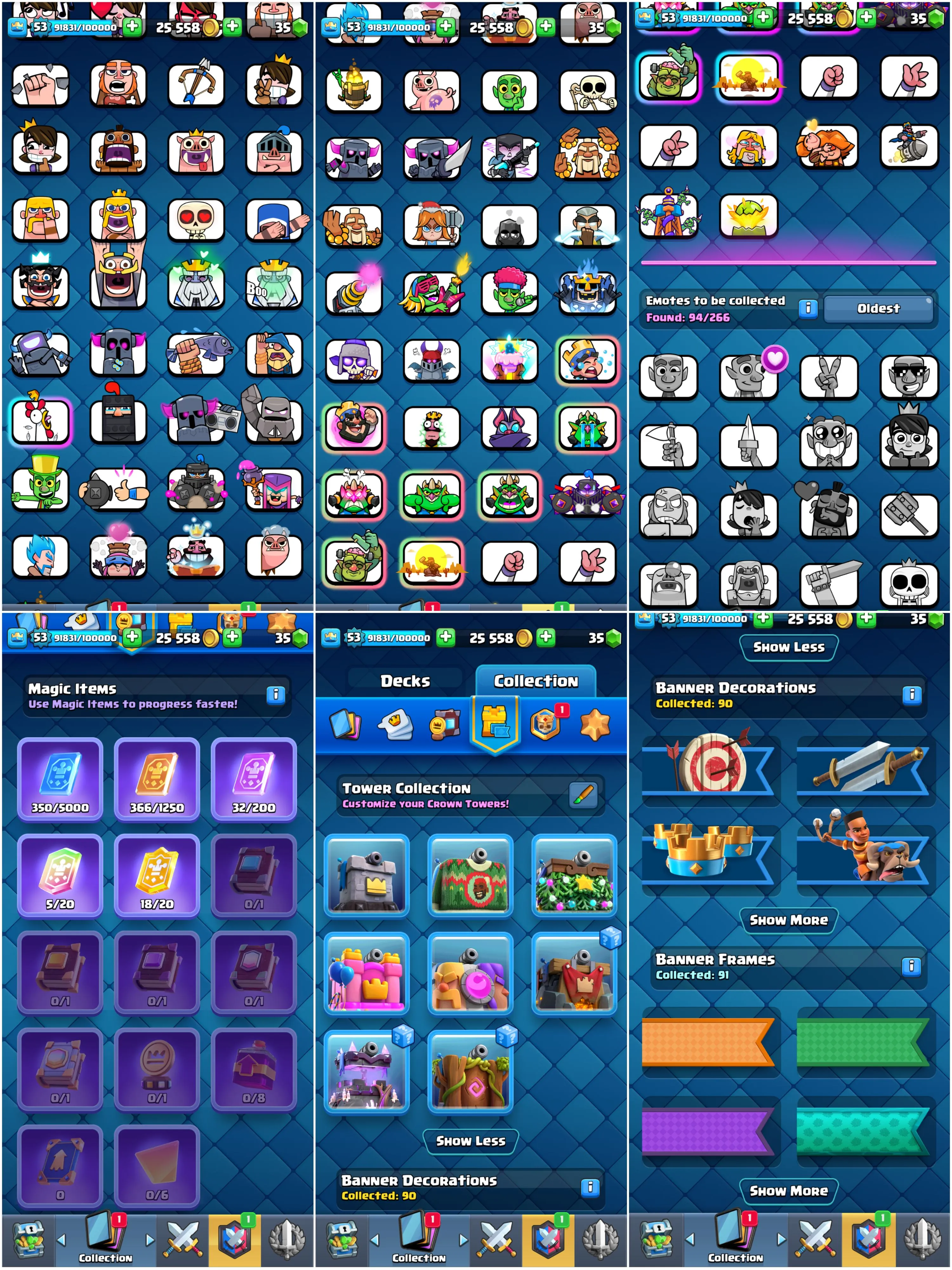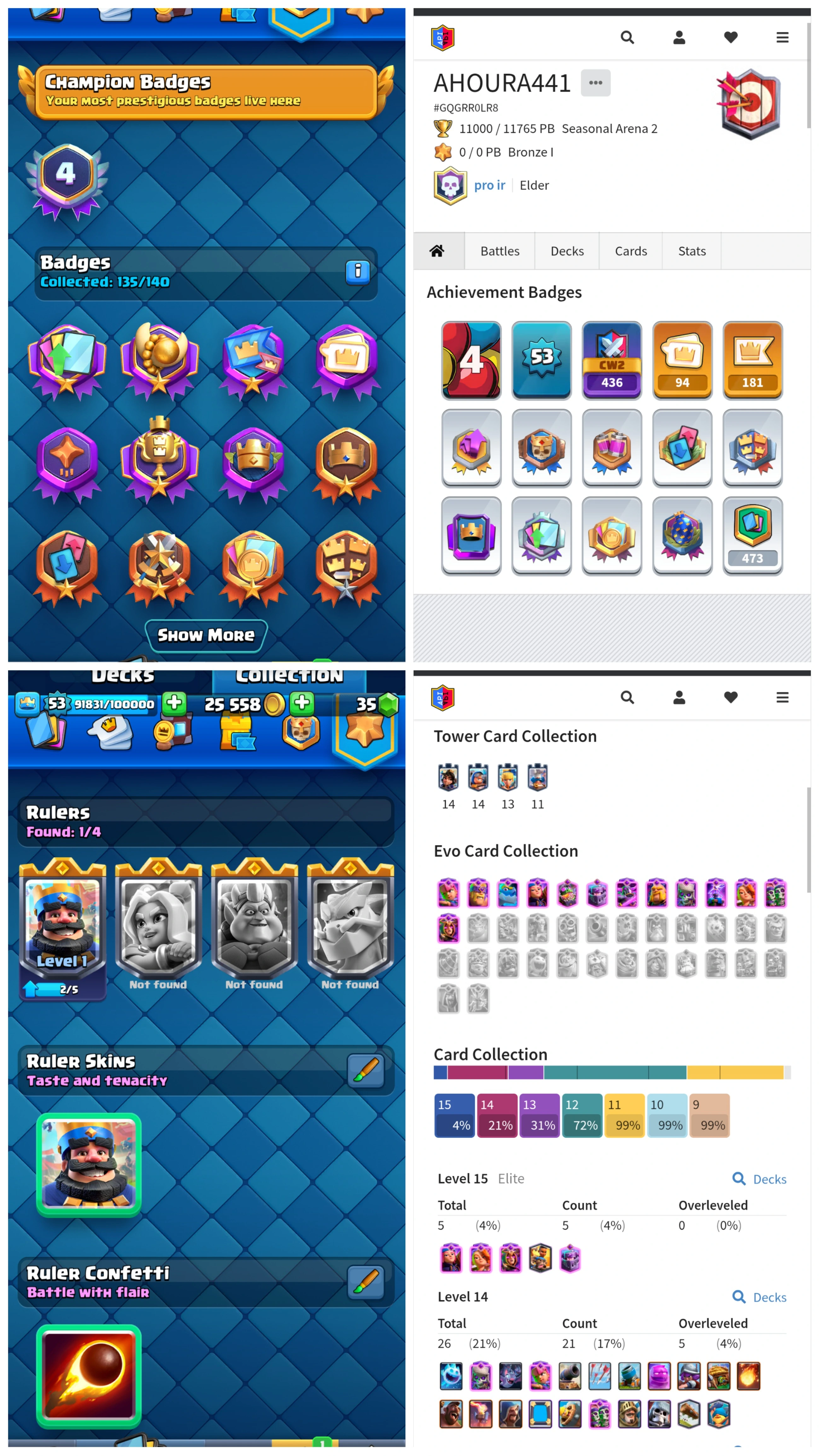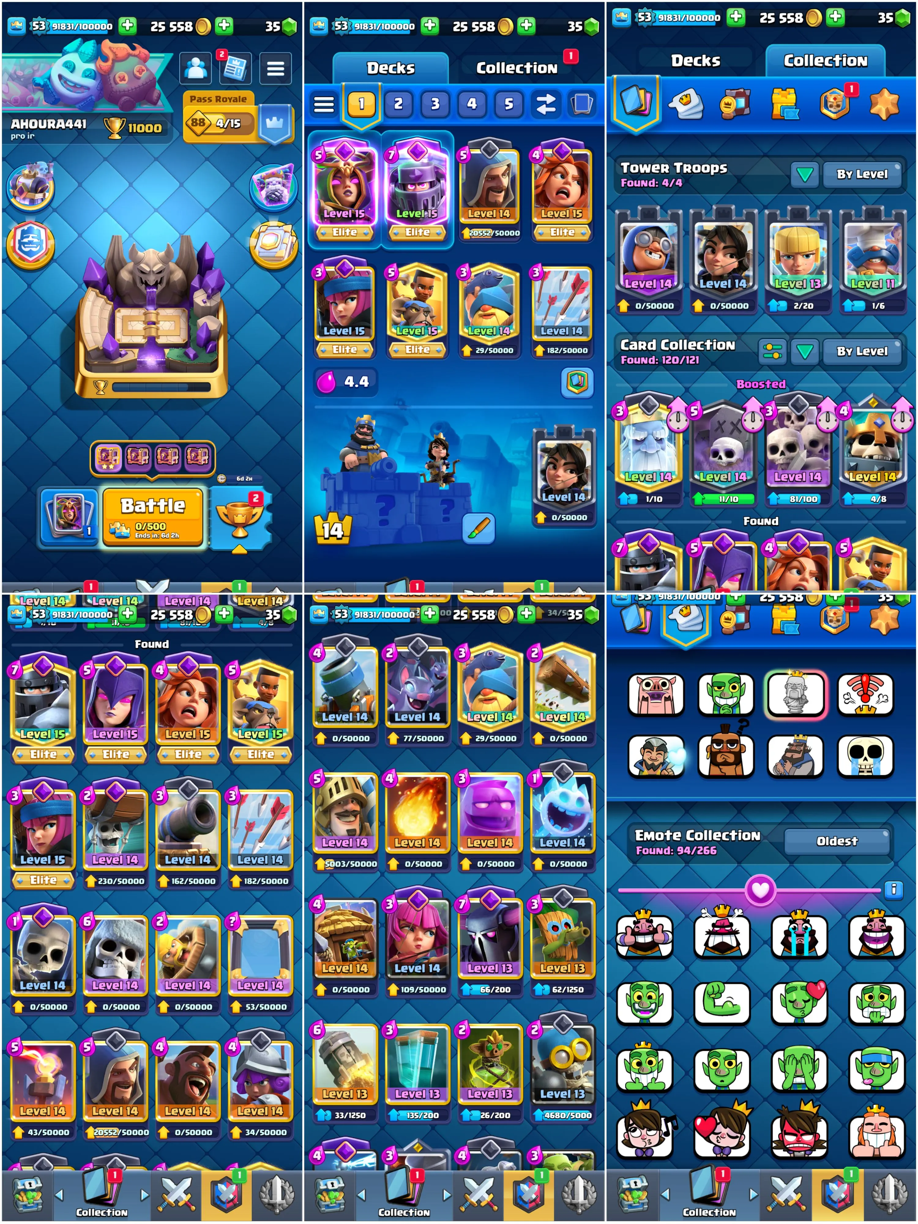 🏅 Level 53 + KT 14 • 11,000 Trophies 🏆 • 26 Max Cards, 5 Elites & 13 Evolutions • 94 Emotes • 8 Tower Skins • 4 Years Played Badge 🎖️