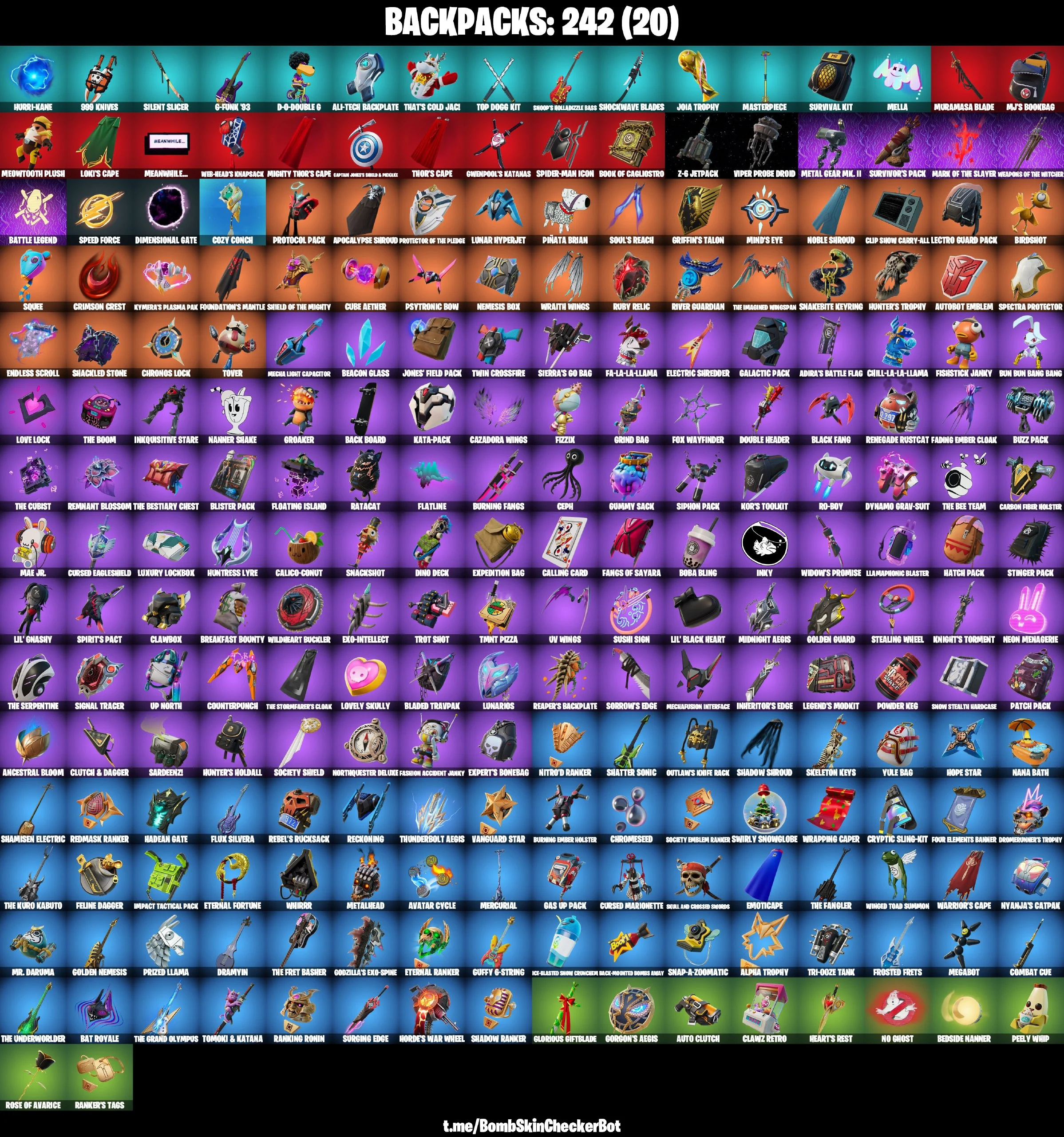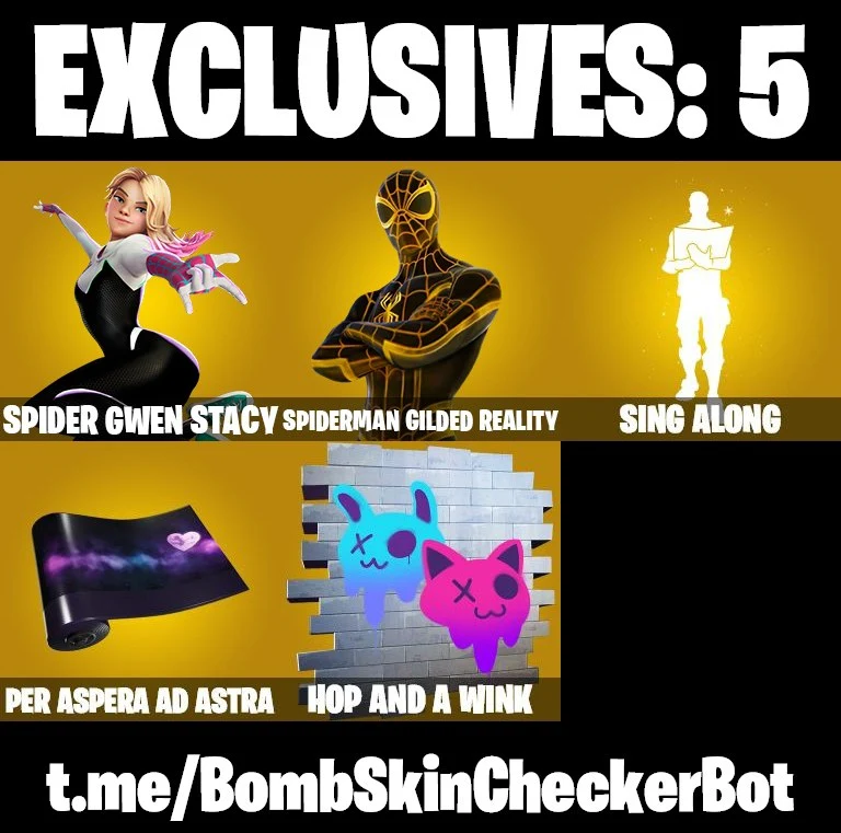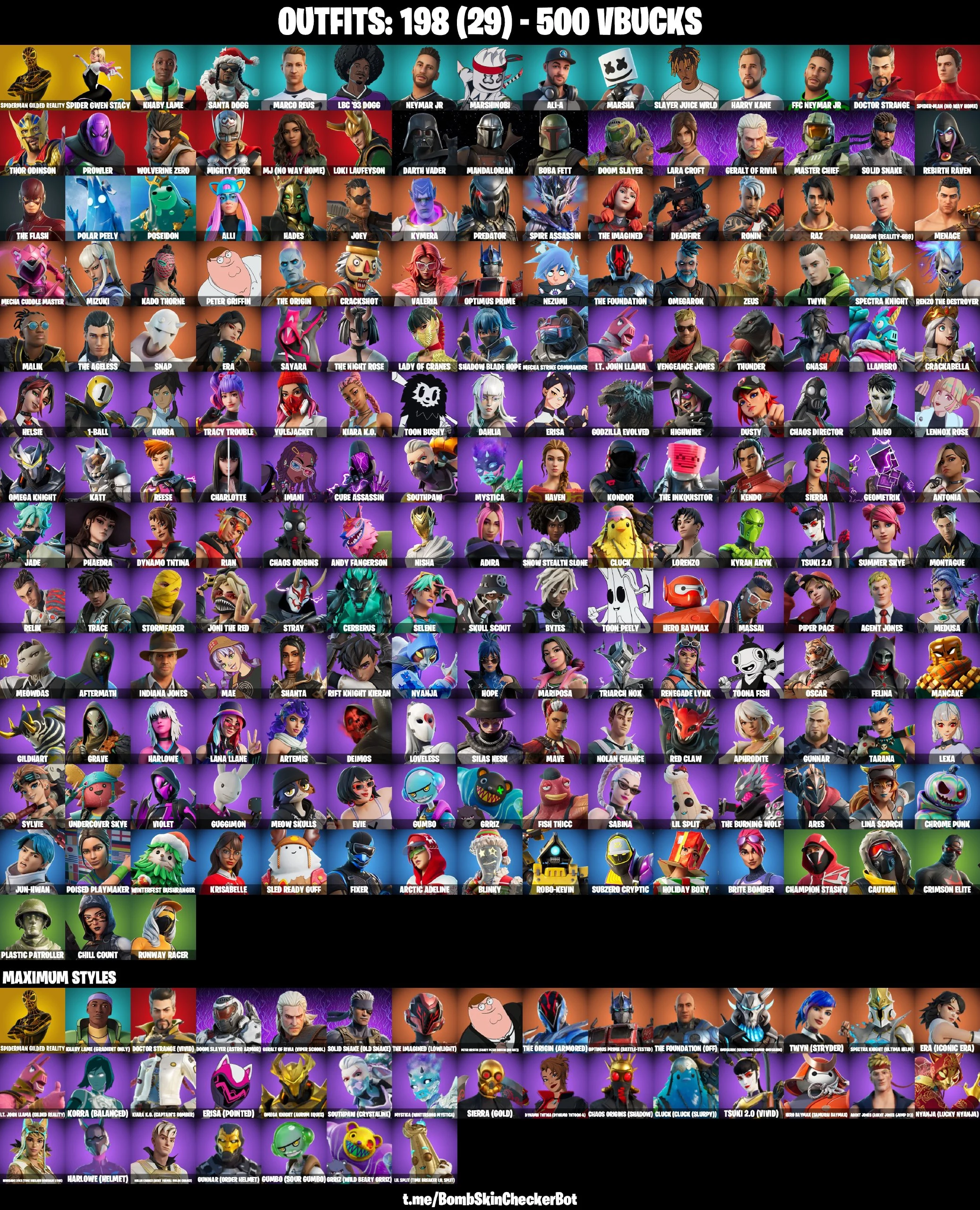 🔮198 Skins🔮 Spidergwen (Stacy)💎Loki Laufeyson💎Darth Vader💎Lara Croft💎Neymar Jr💎Erisa💎Polar Peely💎Krisabelle💎Fixer💎Doctor Strange💎Predator💎Toona Fish💎Meow Skulls