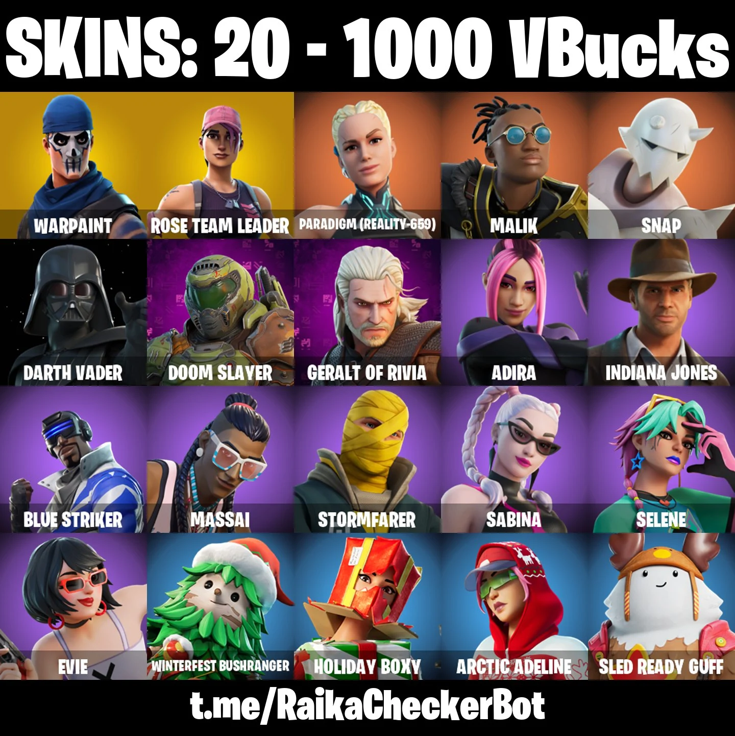 👑20 Skins 👑PC/PSN/XBOX👑 OG STW 👑 Paragon 👑 Paradigm (Reality-659) 👑 Malik 👑 Snap 👑 Darth Vader 👑 Doom Slayer 👑 Geralt of Rivia 👑 Adira 👑 Indiana Jones 👑