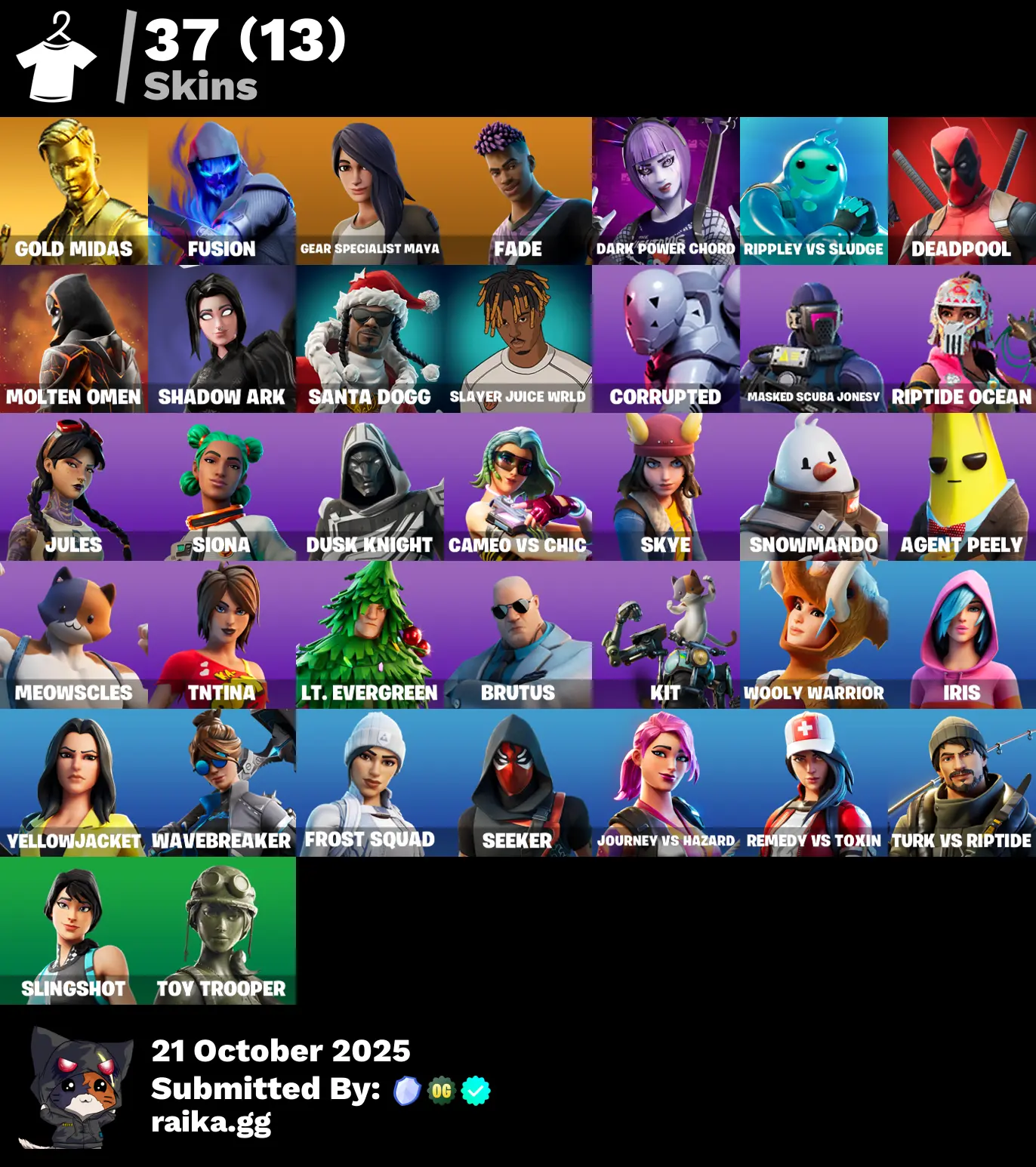 👑37 TOP SKINS 👑 GOLD MIDAS❤️FUSIOIN❤️LAUGH IT UP❤️RIPPLEY VS SLUDGE❤️FADE❤️DARK POWER CHORD❤️MOLTEN OMEN❤️JULES❤️CORRUPTED