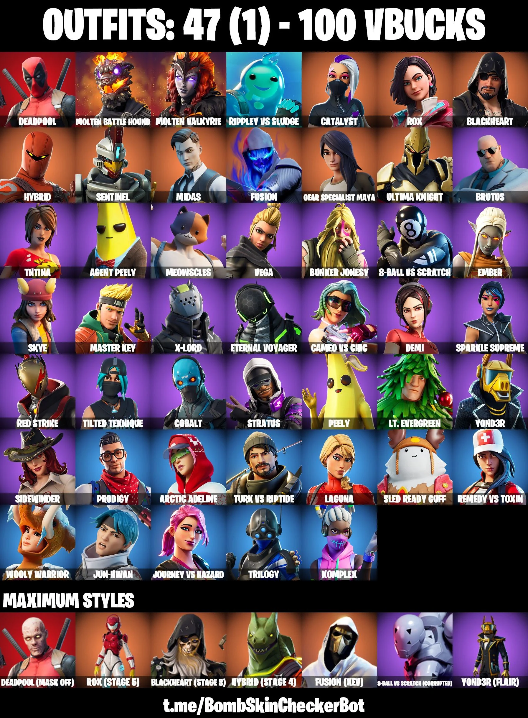 🔮47 Skins🔮 Take The Elf💎Prodigy💎Trilogy💎Tilted Teknique💎Peely💎Ember💎Fusion💎Arctic Adeline💎Sled Ready Guff