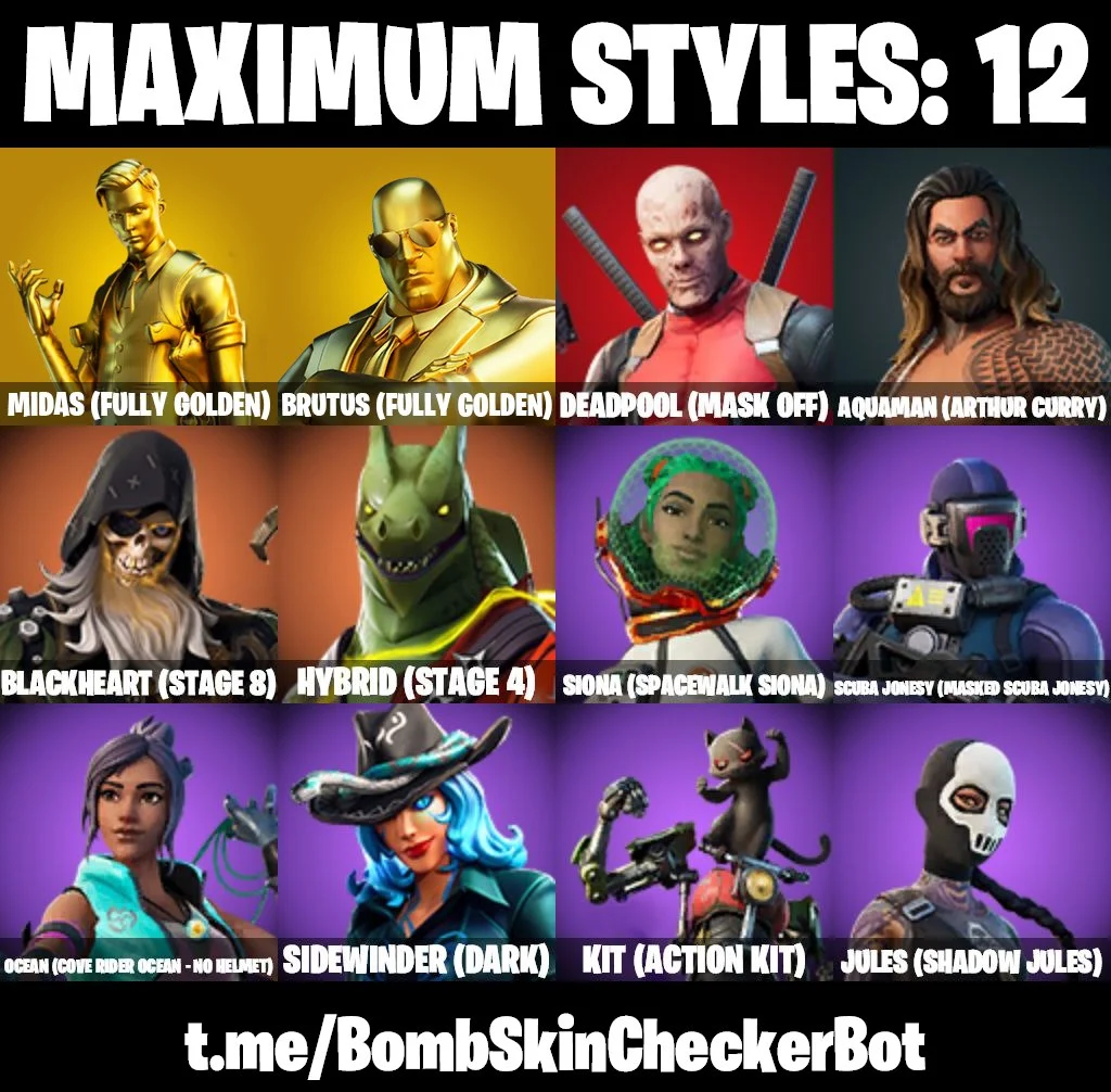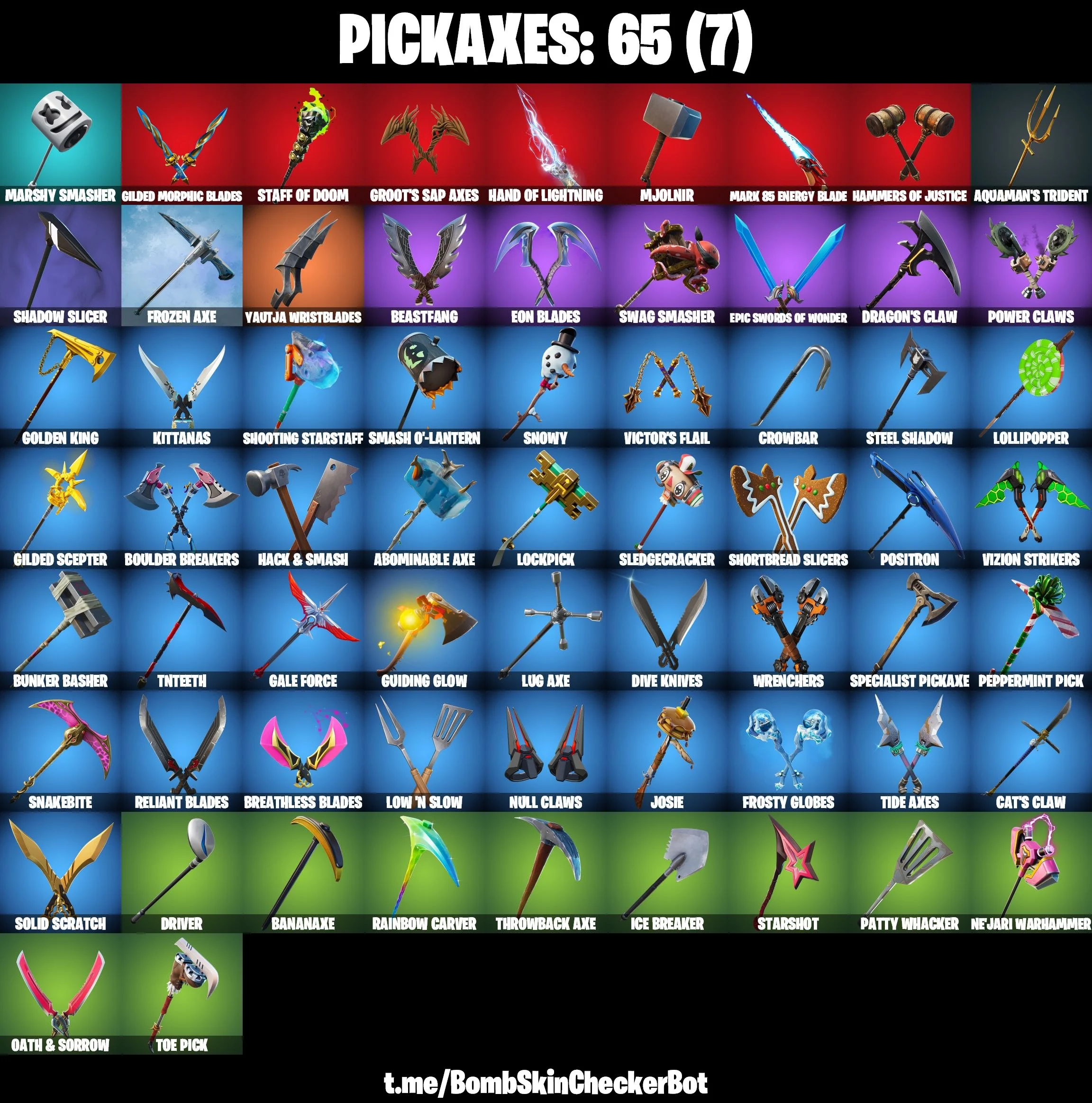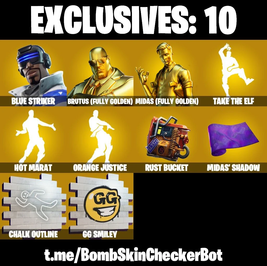 🔮51 Skins🔮 Hot Marat💎Midas (Fully Golden)💎Take The Elf💎Rust Bucket💎Blue Striker💎Tony Stark💎Crowbar💎Orange Justice💎Peely💎Jules💎Predator💎Jennifer Walters💎Mandalorian💎Siona💎Ocean💎Arctic Adeline💎Sled Ready Guff