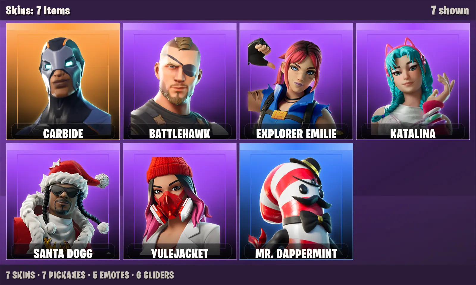 ⭐️ 7 Skins | Carbide + Santa Dogg + Katalina + Battlehawk + Explorer Emilie + Yulejacket + Mr. Dappermint | 300 VB