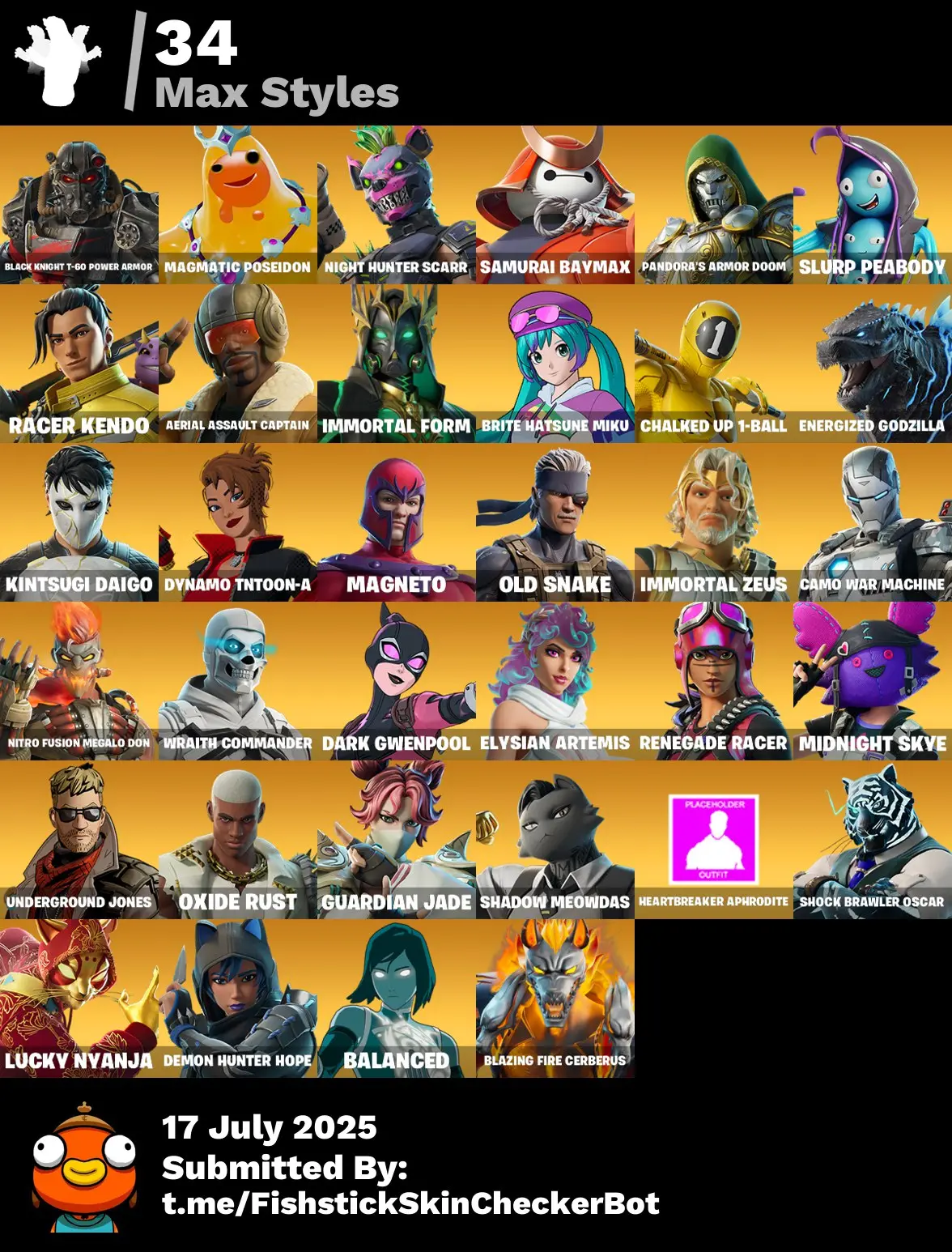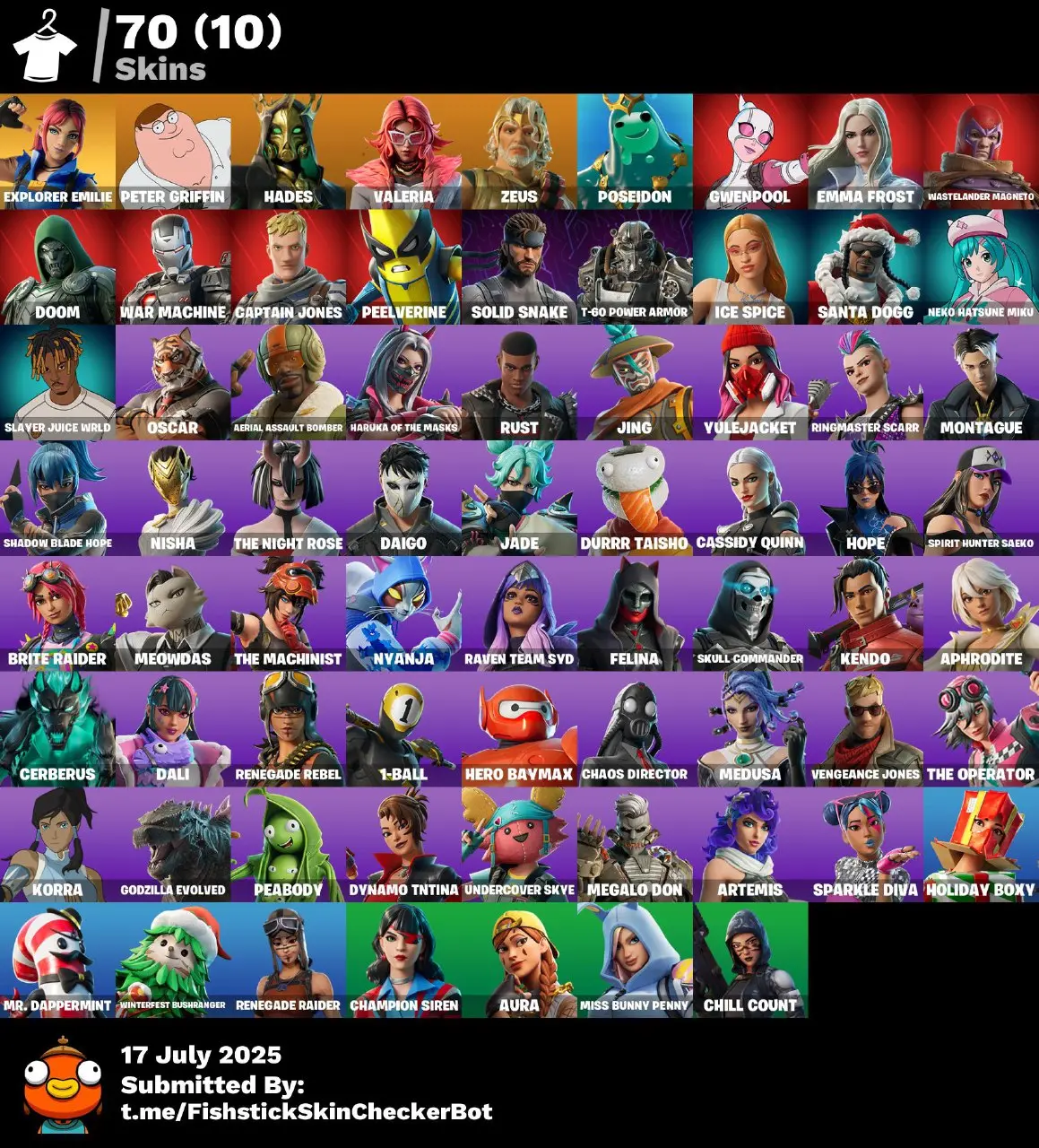 🦄 70 Skins [PC/PSN/XBOX] 🔥 Renegade Raider 🌺 Explorer Emilie 🍔 Peter Griffin 💫 Valeria ⚡ Zeus 🌊 Poseidon 💥 Gwenpool ❄️ Emma Frost 🪄 FTN108
