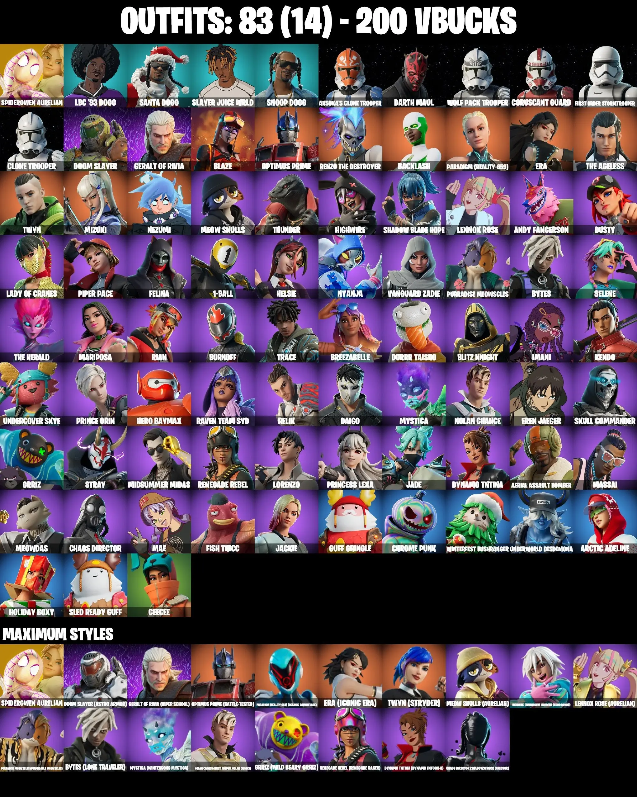 ❤️ 83 SKINS ❤️ BACKLASH ❤️ SPIDER-GWEN STACY ❤️ AHSOKAS CLONE TROOPER ❤️ DARTH MAUL ❤️ WOLF PACK TROOPER ❤️ CORUSCANT GUARD ❤️ FIRST ORDER STORMTROOPER ❤️ CLONE TROOPER ❤️ STAR WAND ❤️ EREN JAEGER ❤️ PRINCESS LEXA ❤️ ERA MAX ❤️