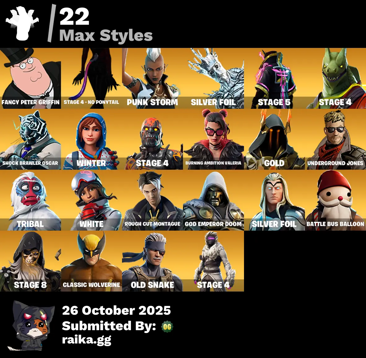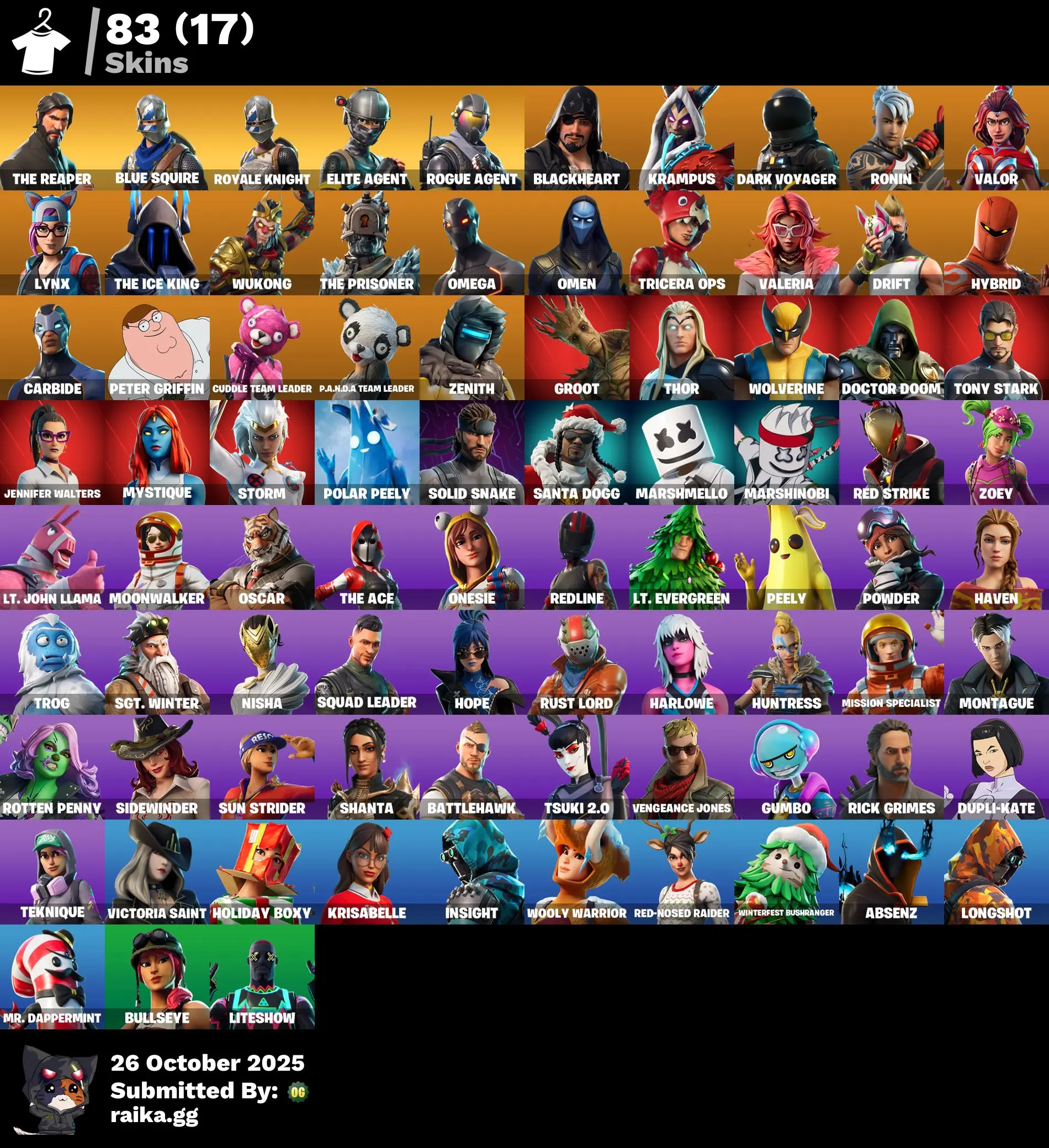 83 skins | The Reaper🎃The Ice King🎃Cuddle Team Leader🎃Peter Griffin🎃Elite Agent🎃Ronin🎃Dark Voyager🎃Hybrid🎃Krampus🎃Carbide🎃Rogue Agent🎃Valor🎃Valeria🎃Omega🎃Blackheart🎃Lynx🎃Omen🎃Royale Knight🎃Blue Squire🎃The Prisoner🎃Tricera Ops D5230