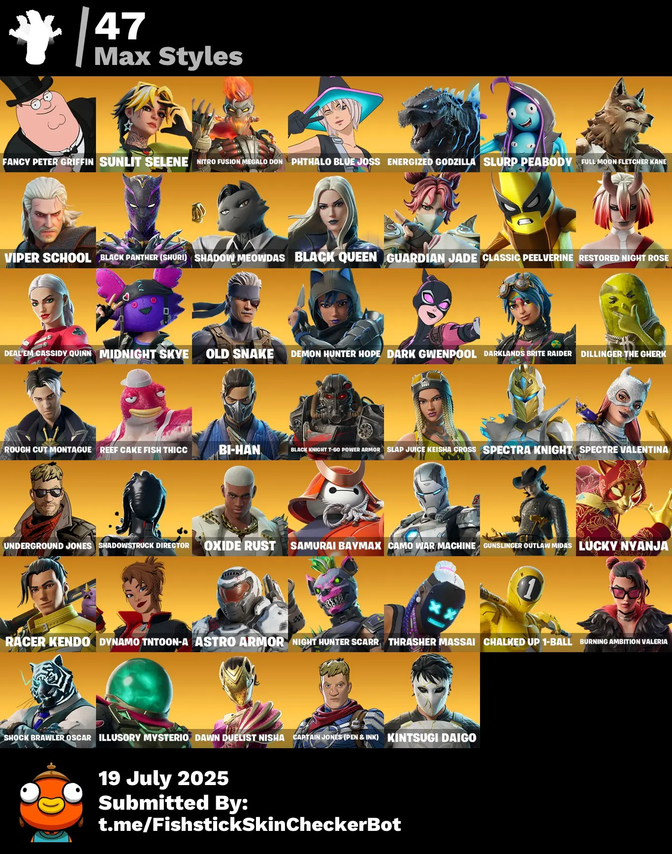 🦁 95 Skins [PC/PSN/XBOX] 🍔 Peter Griffin 🛡️ Spectra Knight 🌅 Era 💫 Valeria ⚔️ First Order Stormtrooper 🌪️ Peelverine ⚙️ War Machine 🪄 FTN114