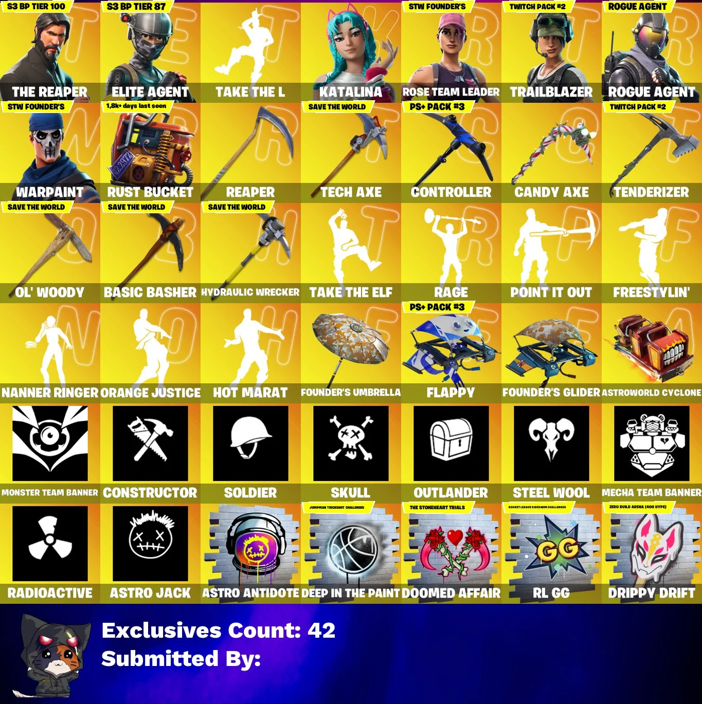 ๐ก๏ธ๐ OG ACCOUNT ๐๐ก๏ธ 208 SKINS ๐ THE REAPER ๐ ELITE AGENT ๐ TAKE THE L ๐ KATALINA ๐ TRAILBLAZER ๐ ROGUE AGENT ๐ RUST BUCKET ๐ REAPER ๐ TECH AXE ๐ CONTROLLER ๐ CANDY AXE ๐ TENDERIZER ๐ OL' WOODY ๐ BASIC BASHER ๐ 1670 VB ๐ OG STW ๐ FULL ACCESS ๐