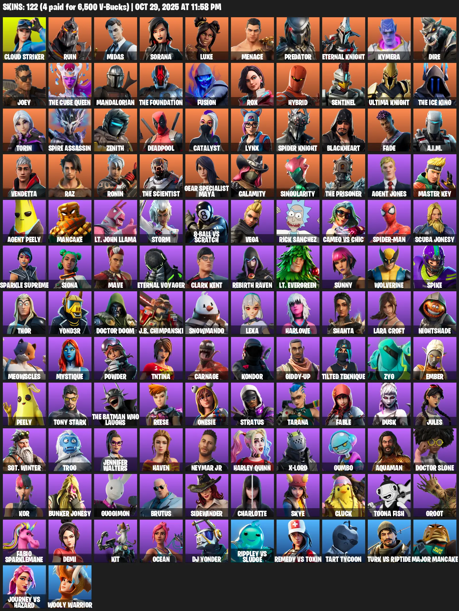 [PC] | 122 skins | Lara Croft | Cloud Striker | Ruin | Midas | Sorana | Luxe | Menace | Predator | Eternal Knight | Kymera | Dire | #FAA8073 | #MBFN