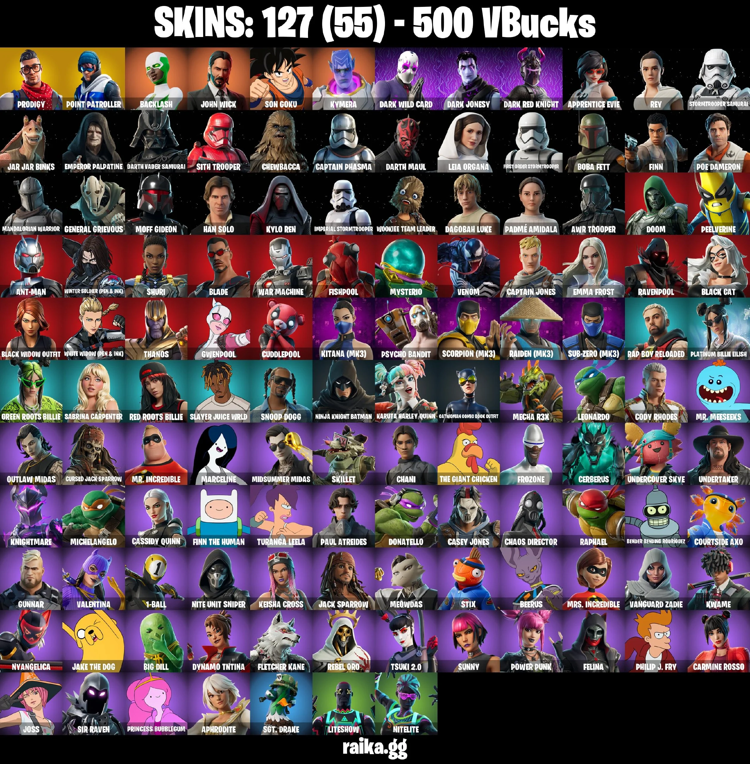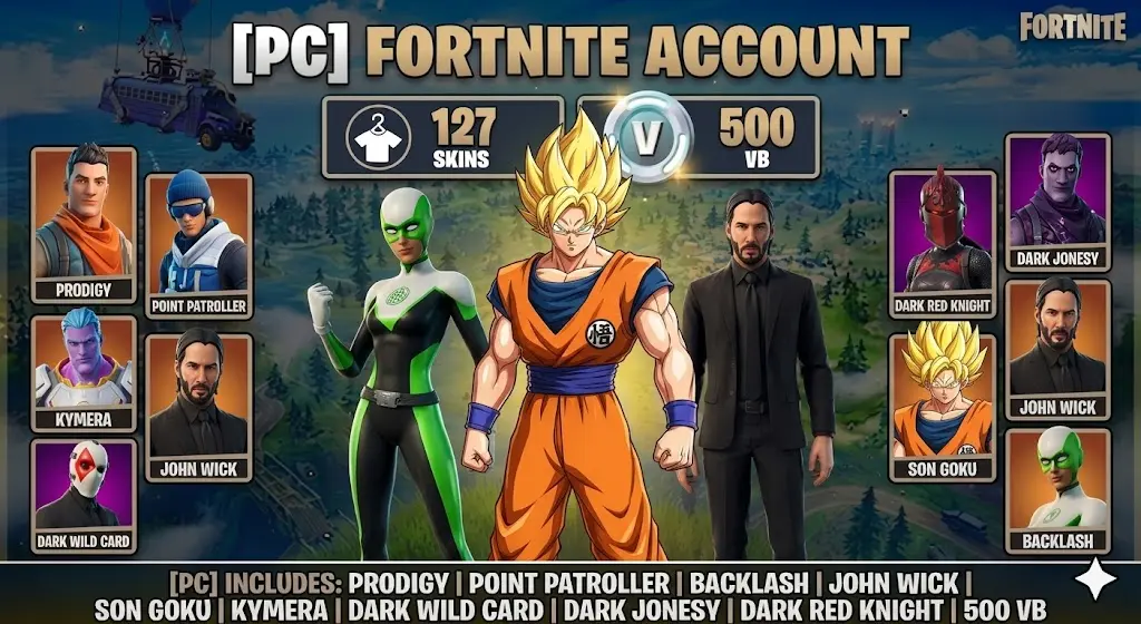 [PC] 💻 127 Skins👕 | Prodigy🧠 | Point Patroller🎯 | John Wick🔫 | Son Goku🐉 | Dark Wild Card🃏 | Dark Jonesy🌑 | Dark Red Knight🛡️ | 500 VBucks💸