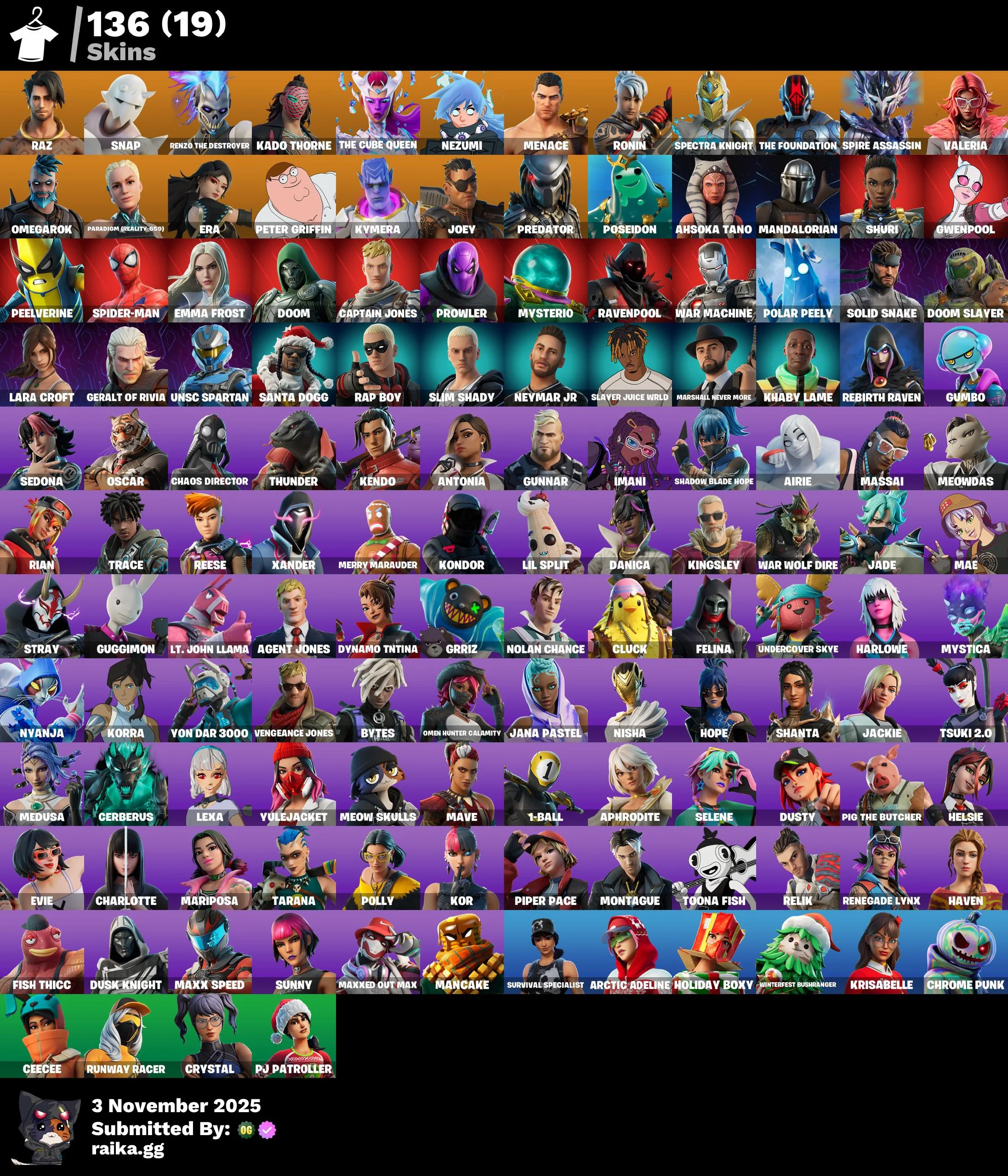 [PC] 136 skins | Raz | Snap | Renzo the Destroyer | Kado Thorne | The Cube Queen | Nezumi | Menace | Ronin | Spectra Knight | The Foundation | 1050 VB
