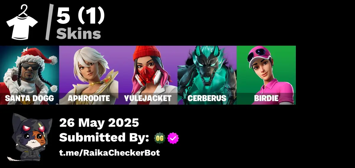 [PC] 5 Skins | Santa Dogg | Aphrodite | Yulejacket | Cerberus | Birdie | Cozy Conch | That's Cold Jac! | Snoop's Holladizzle Bass | FN35