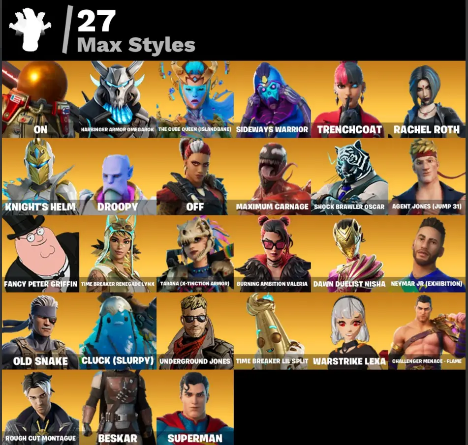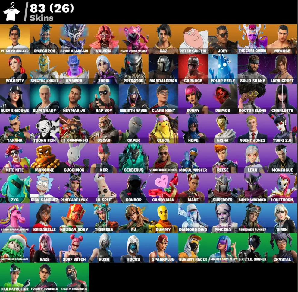 (PC PSN XBOX) 83 skins | LEVIATHAN AXE / LARA CROFT / CANDY AXE / REAPER / Pitch Patroller | Omegarok | Spire Assassin | Valeria | Mecha Cuddle Master | Raz | Peter Griffin | Joey | The Cube Queen | Menace | 300 VB