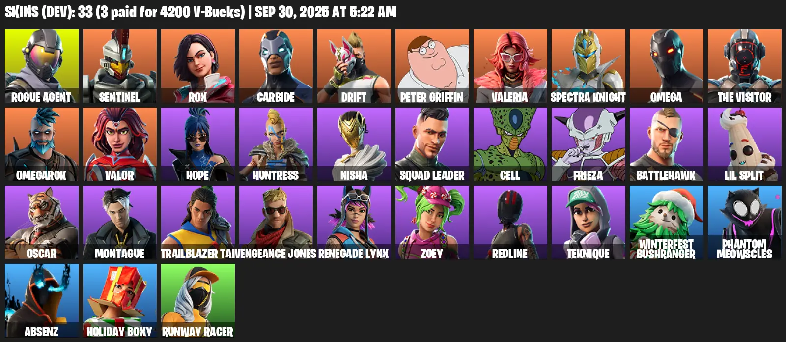 [PC/PSN] | 33 skins | Omega | Mako | Rogue Agent | Sentinel | Rox | Carbide | Drift | Peter Griffin | Valeria | Spectra Knight | The Visitor | S4G