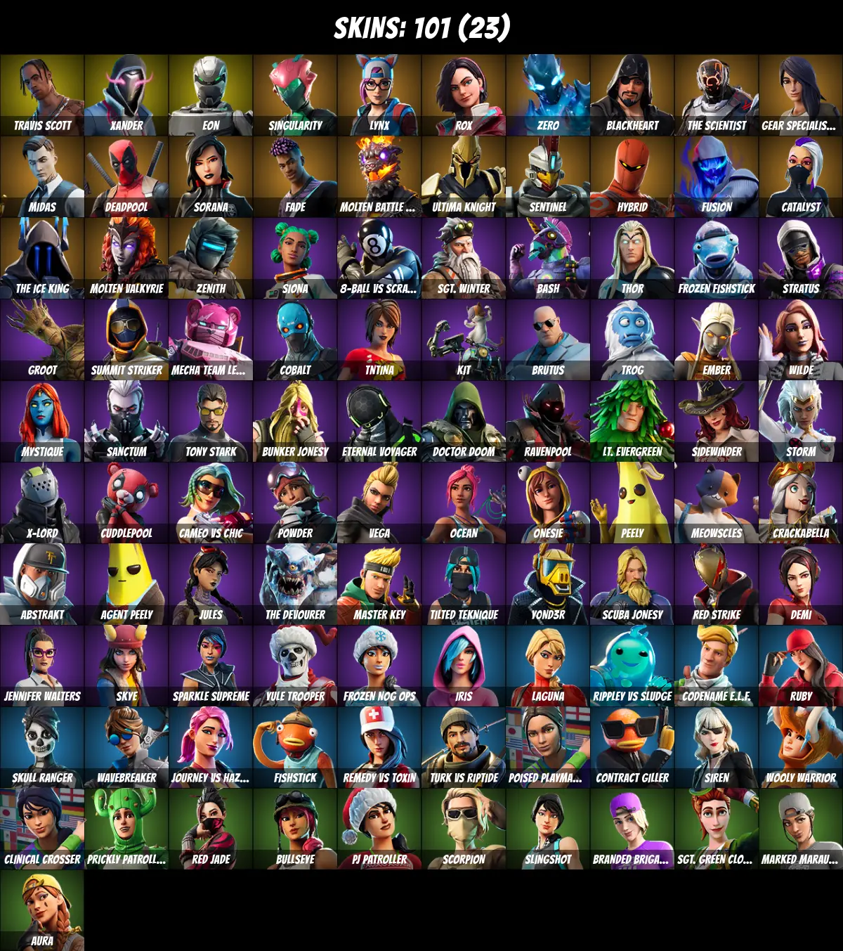 ⚡PC/PSN/XBOX⚡ 101 skins 💎 Travis Scott 💎 Eon 💎 Deadpool 💎 Tony Stark 💎 Midas 💎 Lynx 💎 Jules 💎 Fishstick 💎 Aura 💎 Peely 💎 Agent Peely 💎 Catalyst 💎 Siren 💎 Ultima Knight 💎 Meowscles 💎 Thor 💎 TNTina 💎 Brutus 💎 Mystique 💎 Xander 💎 Singularity 💎 350 V-Bucks 💎