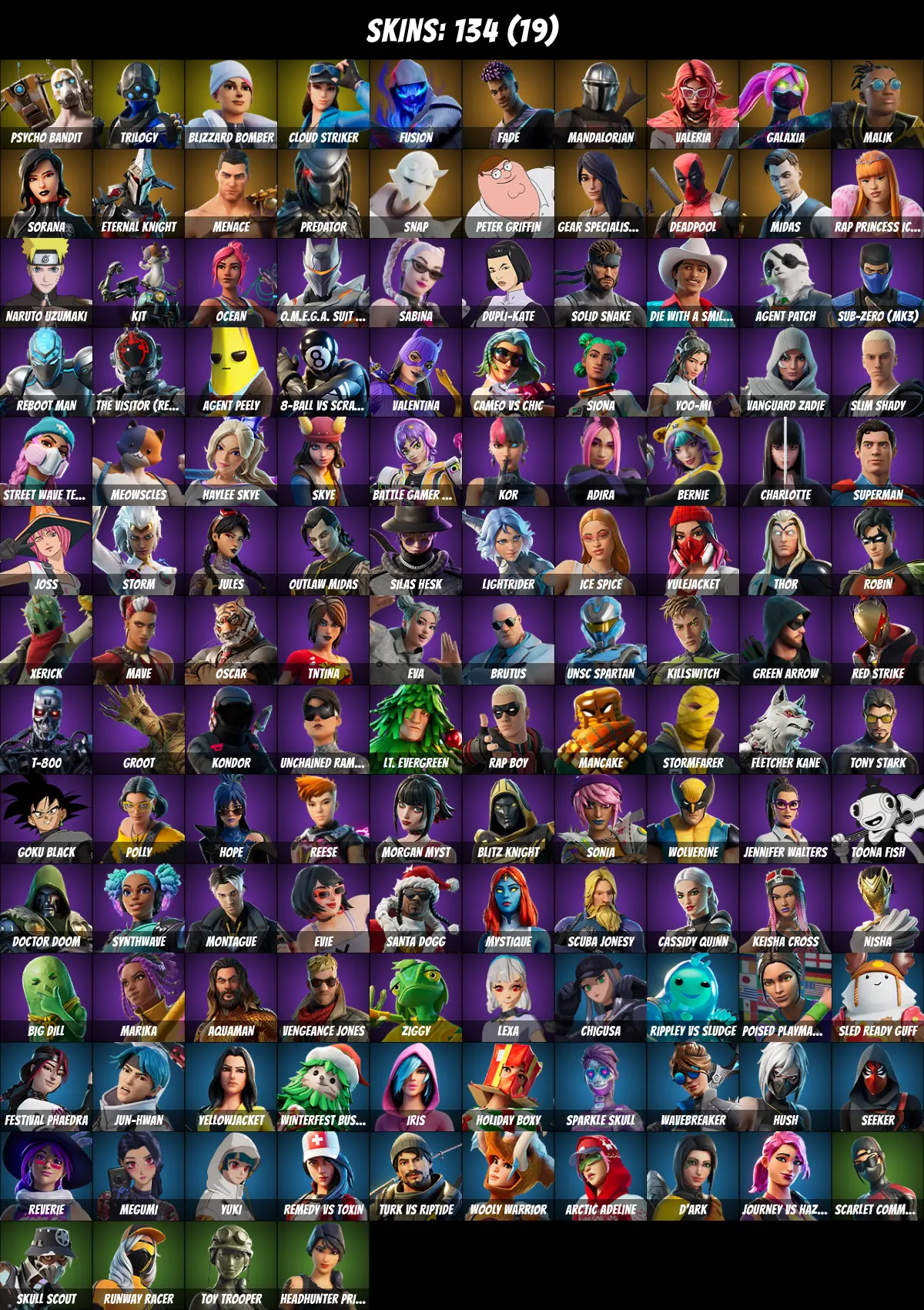 ⚡PC/PSN/XBOX⚡ 134 skins 💎 Psycho Bandit 💎 Unchained Ramirez 💎 Naruto Uzumaki 💎 Kor 💎 Deadpool 💎 Tony Stark 💎 Midas 💎 Galaxia 💎 Mandalorian 💎 Jules 💎 Agent Peely 💎 Toona Fish 💎 Meowscles 💎 Thor 💎 Snap 💎 TNTina 💎 Brutus 💎 Trilogy 💎 100 V-Bucks 💎