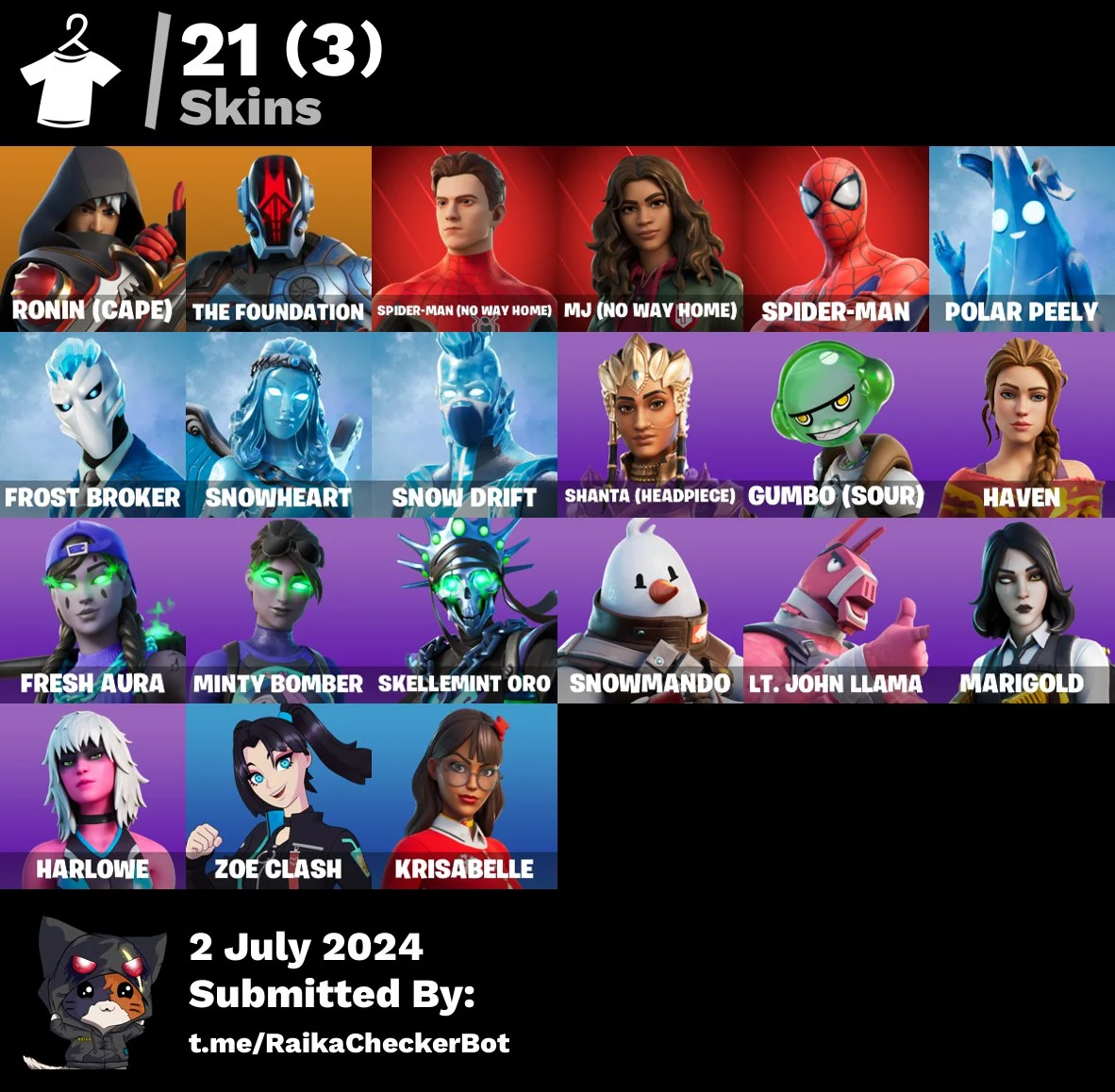 [PC/PSN/XBOX] 21 skins | Ronin (Cape) | The Foundation | Spider-Man (No Way Home) | MJ (No Way Home) | Spider-Man | Polar Peely | 300 VB