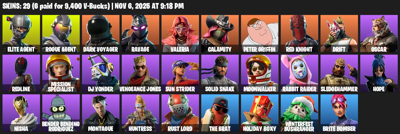 [PC/PSN/XBOX] | 29 skins | 550 V-bucks | Take The L | Elite Agent | Rogue Agent | Dark Voyager | Ravage | Valeria | Calamity | Peter Griffin | S4G