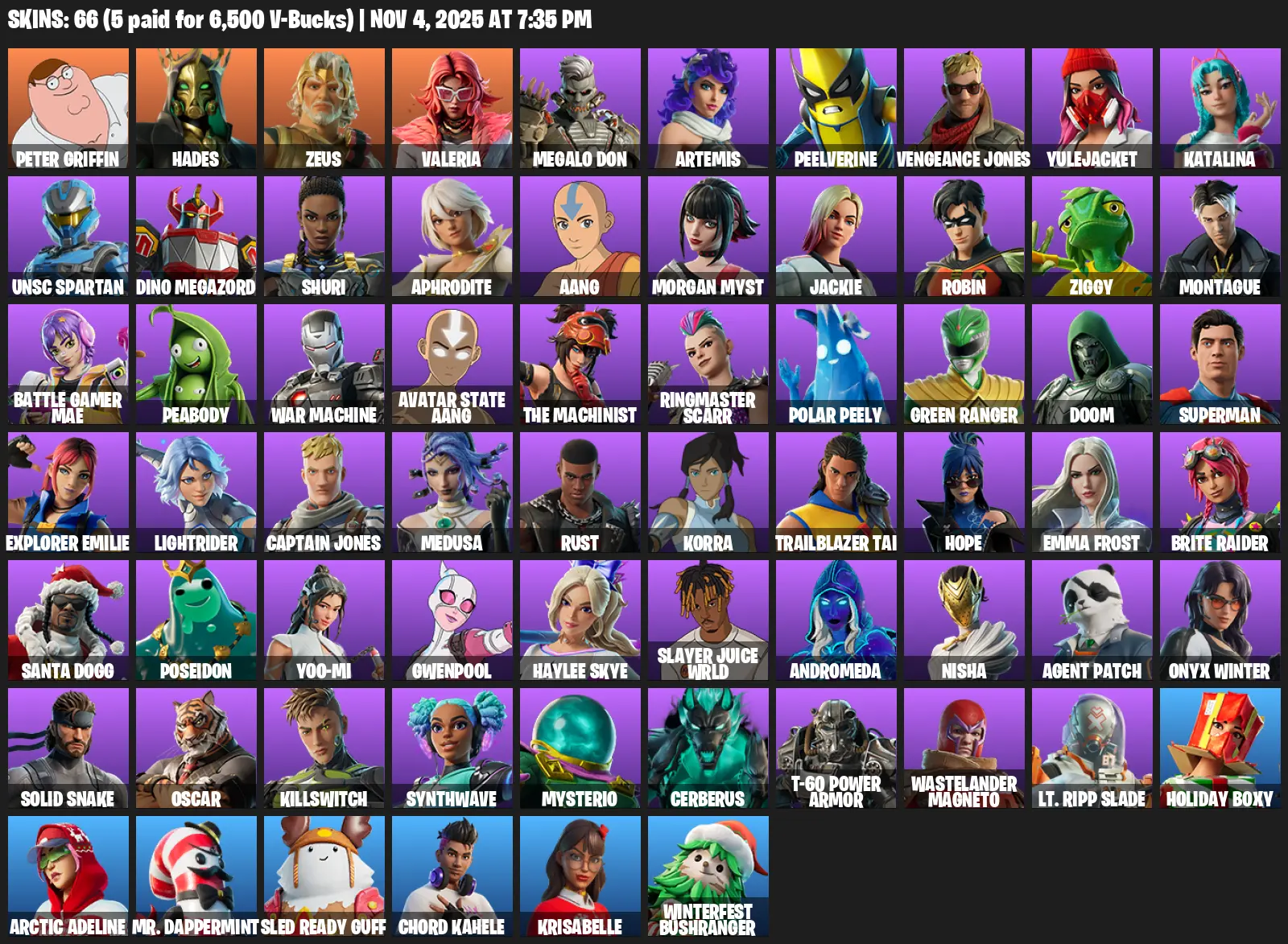 🍨 [PC/PSN/XBOX] 🌟 66 skins | Hades , Zeus , Valeria , Megalo Don , Artemis , Peelverine , Vengeance Jones , Yulejacket , Katalina | 💙 1600 VBUCKS | ✉️ Changeable Email Now