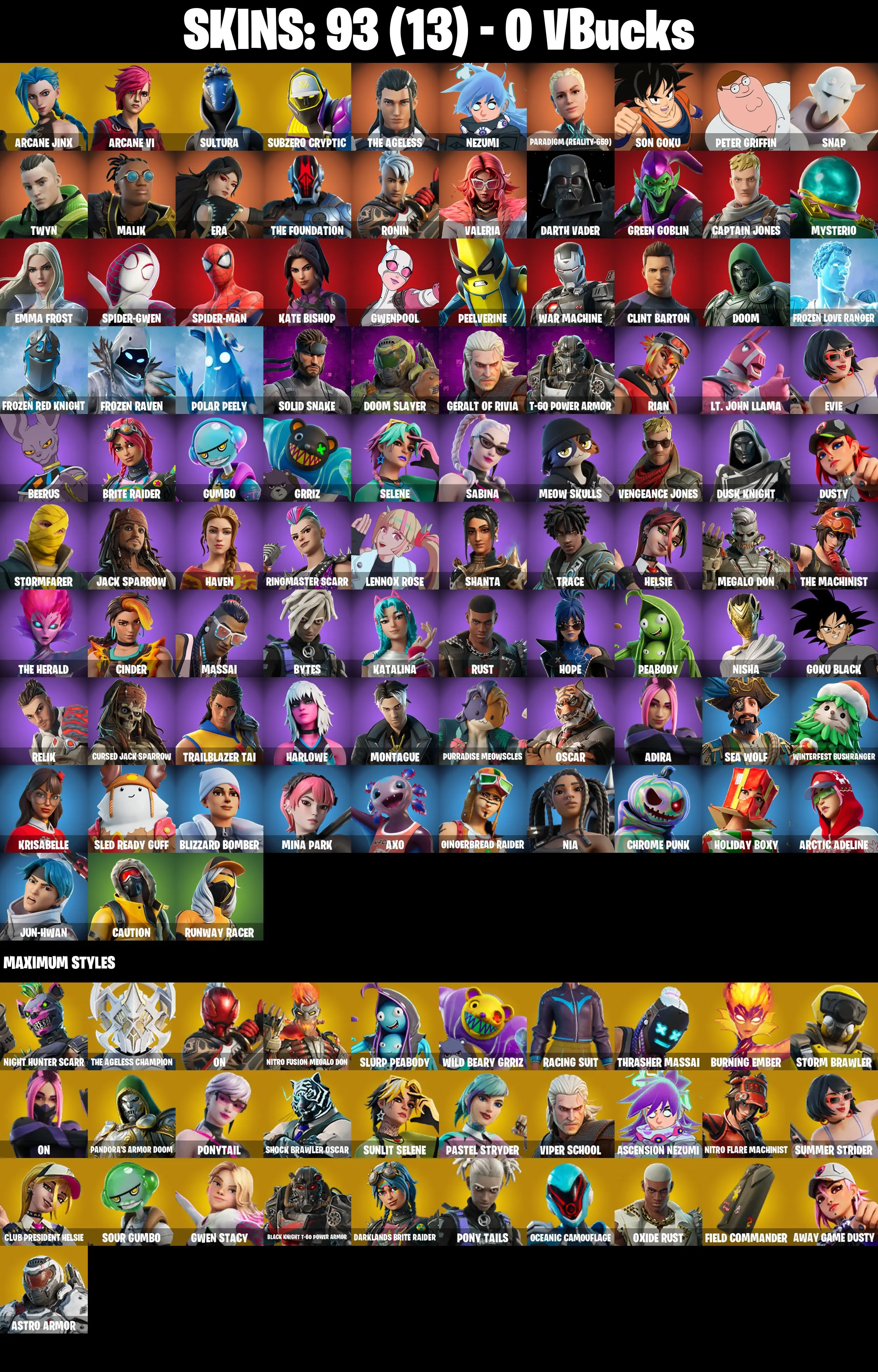 (PC/PSN/XBOX) 93 SKINS ♠️ Arcane Jinx ♠️ Arcane Vi ♠️ Sultura ♠️ Subzero Cryptic ♠️ The Ageless ♠️ Nezumi ♠️ Paradigm (Reality-659) ♠️ Son Goku ♠️ 0 V-Bucks