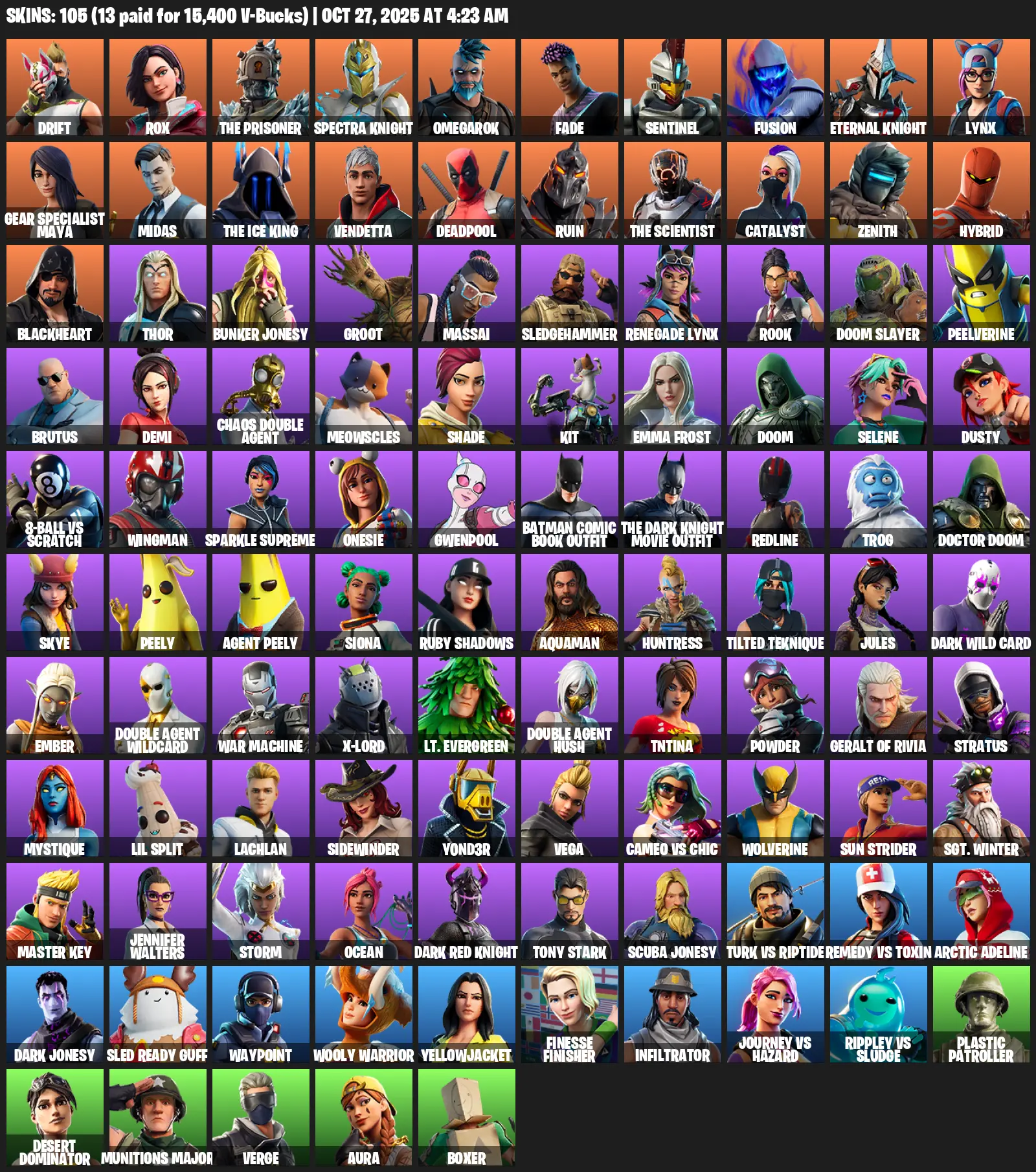 [PC/XBOX] | 105 skins | 850 V-bucks | Drift | Rox | The Prisoner | Spectra Knight | Omegarok | Fade | Sentinel | Fusion | Eternal Knight | Lynx | S4G