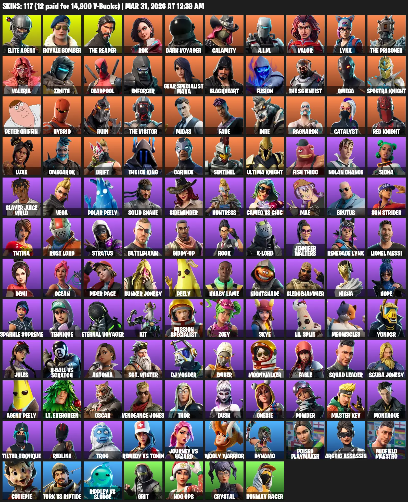 [PC/XBOX] | 117 skins | Take The L | The Reaper | Elite Agent | Omega | Royale Bomber | Rox | Dark Voyager | Calamity | A.I.M. | Valor | #UBY8867