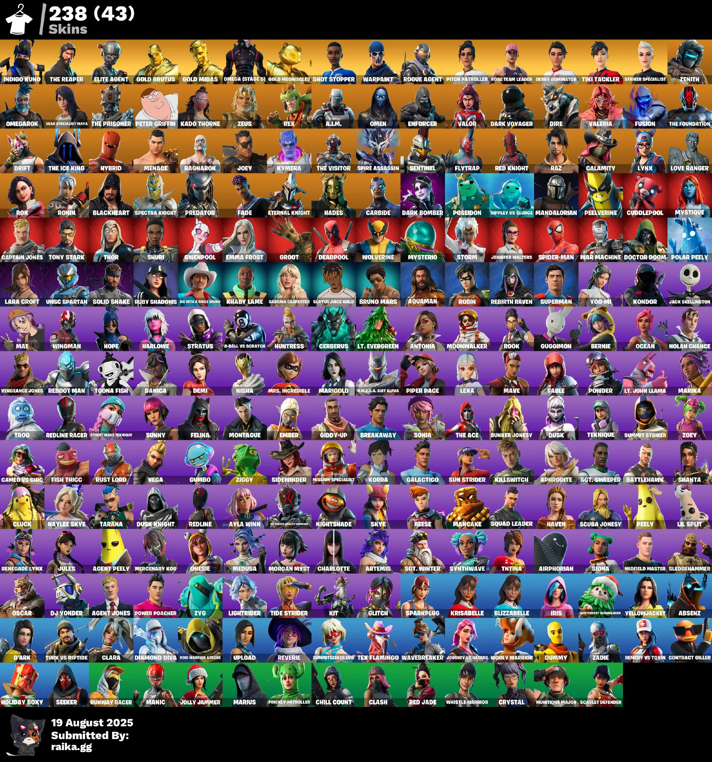 [PC/XBOX] 238 skins | OG STW | Indigo Kuno | The Reaper | Elite Agent | Gold Brutus | Gold Midas | Omega (stage 5) | Gold Meowscles | Shot Stopper | 175 VB