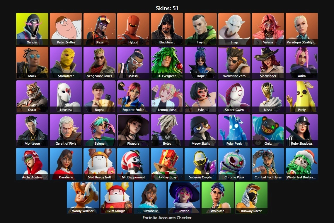 PC/XBOX/PSN 51 Skins⚡ | Peely | Xander | Peter Griffin | Blaze | Hybrid | Blackheart | Twyn | Snap | Valeria | Paradigm (Reality-659) | Malik | Stormfarer