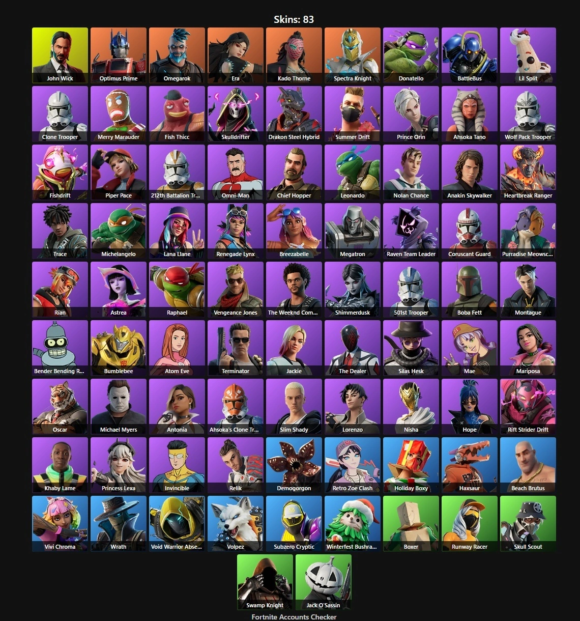 PC/XBOX/PSN 83 Skins⭐️ | John Wick | Optimus Prime | Omegarok | Era | Kado Thorne | Spectra Knight | Donatello | BattleBus | Lil Split | Clone Trooper