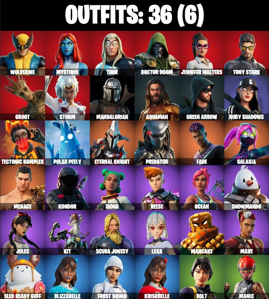 💠PSN/XBOX/PC/SWITCH💠 36 SKINS 💠 Wolverine 💠 Tectonic Komplex 💠 Thor 💠 Storm 💠 Mandalorian 💠 Aquaman 💠 Green Arrow 💠 Galaxia 💠 Tony Stark 💠 Fade 💠