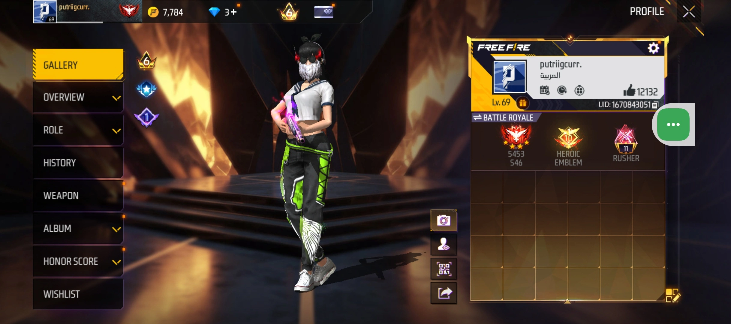 FF194|LV 69/460 WEAPON (5 EVO + 91 MYTHIC)/MP40 ⸱ PREDATORY COBRA LV. 4/MP5 ⸱ PLATINUM DIVINITY LV. 4/SCAR ⸱ MEGALODON ALPHA LV. 4/AK47 ⸱ BLUE FLAME DRACO LV. 5/M1014 ⸱ GREEN FLAME DRACO LV. MAX/423 COSTUME (38 MYTHIC)/71 EMOTE (2 ARTIFACT)