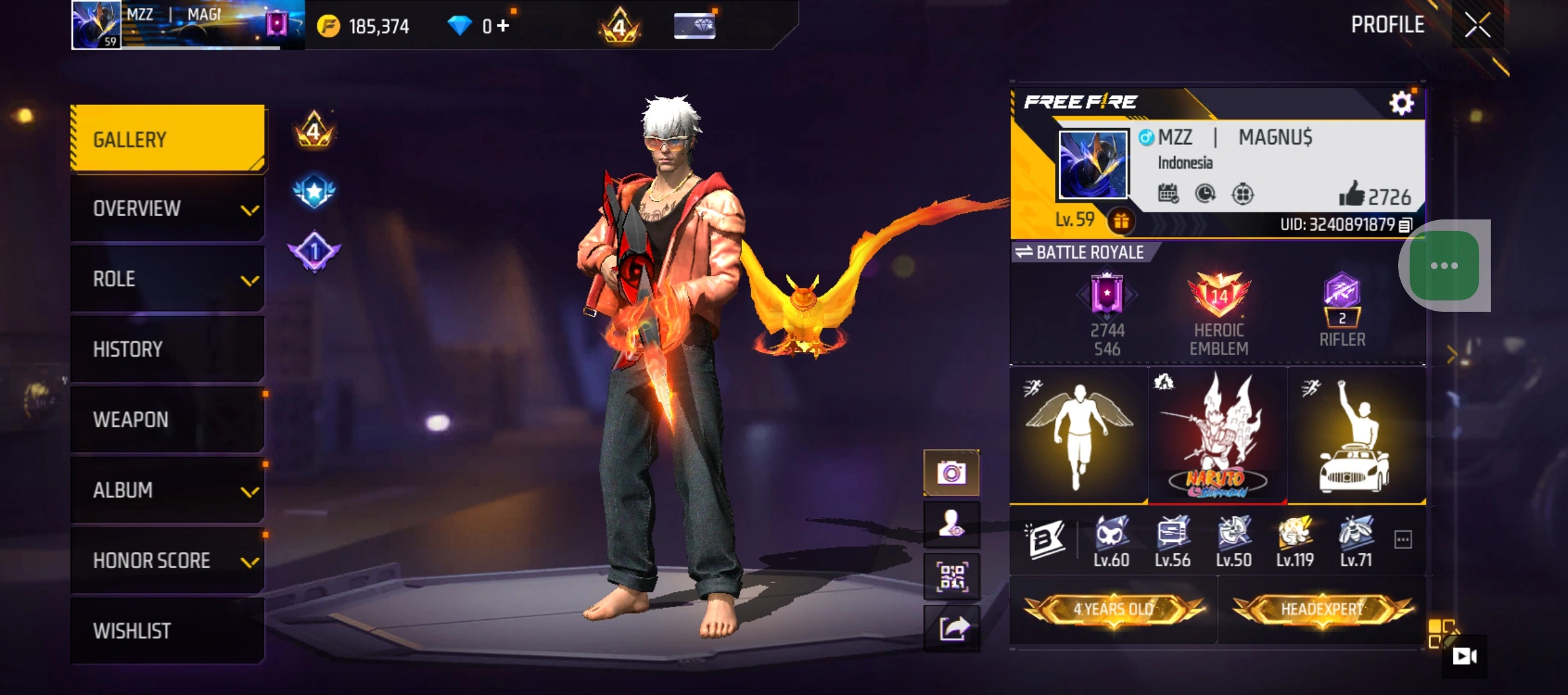 FF210|LV 59/298 WEAPON (1 EVO + 64 MYTHIC)/M1887 ⸱ STERLING CONQUEROR LV. 5/269 COSTUME (20 MYTHIC)/37 EMOTE (13 MYTHIC)/49 BACKPACK (20 MYTHIC)/10 SPORTS CAR